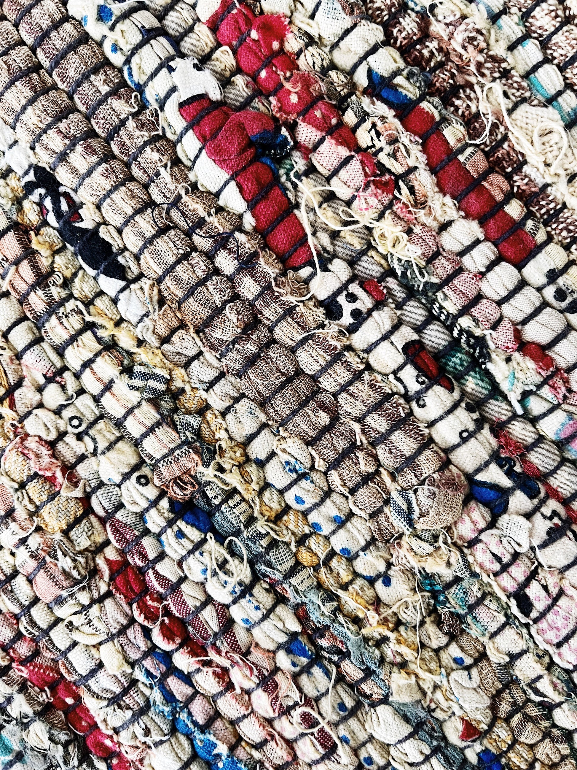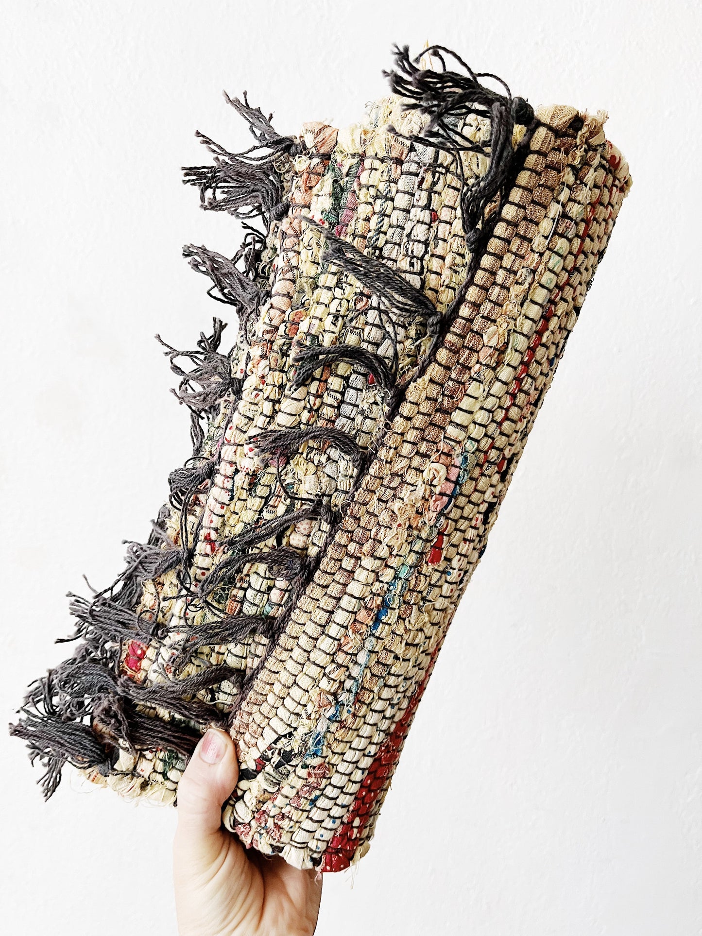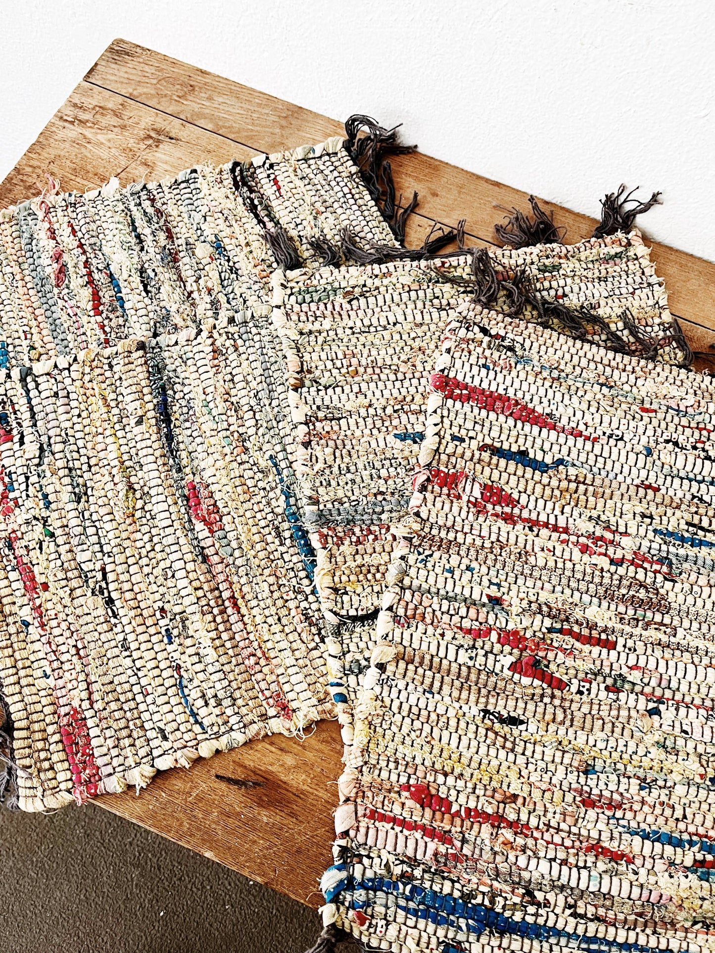 Thick woven cotton rag mats in numerous patterns, with a sort of earthy rainbow effect. Really feels nice to lay some thing on these but also great for making pillows or stringing together as a runner.