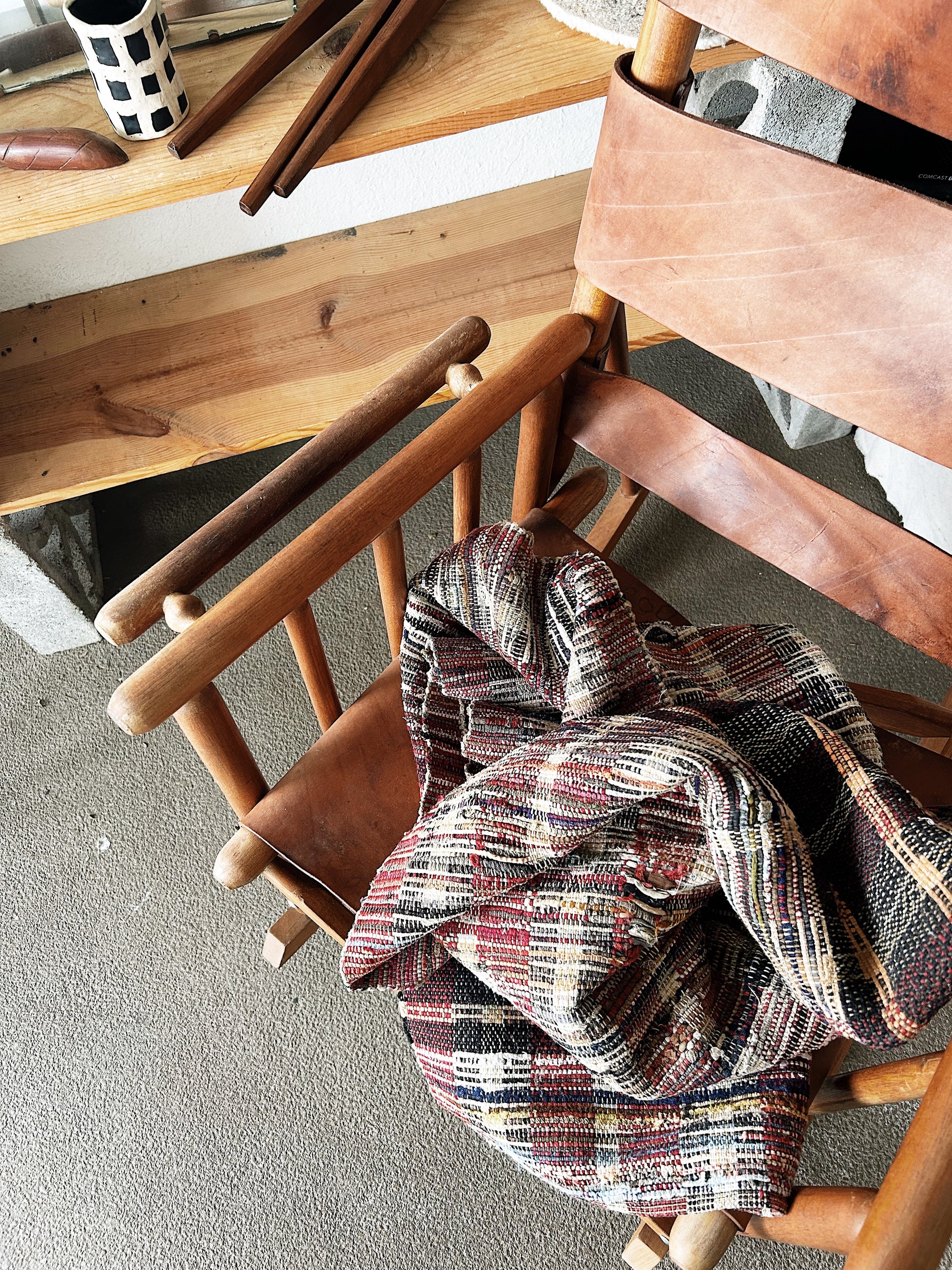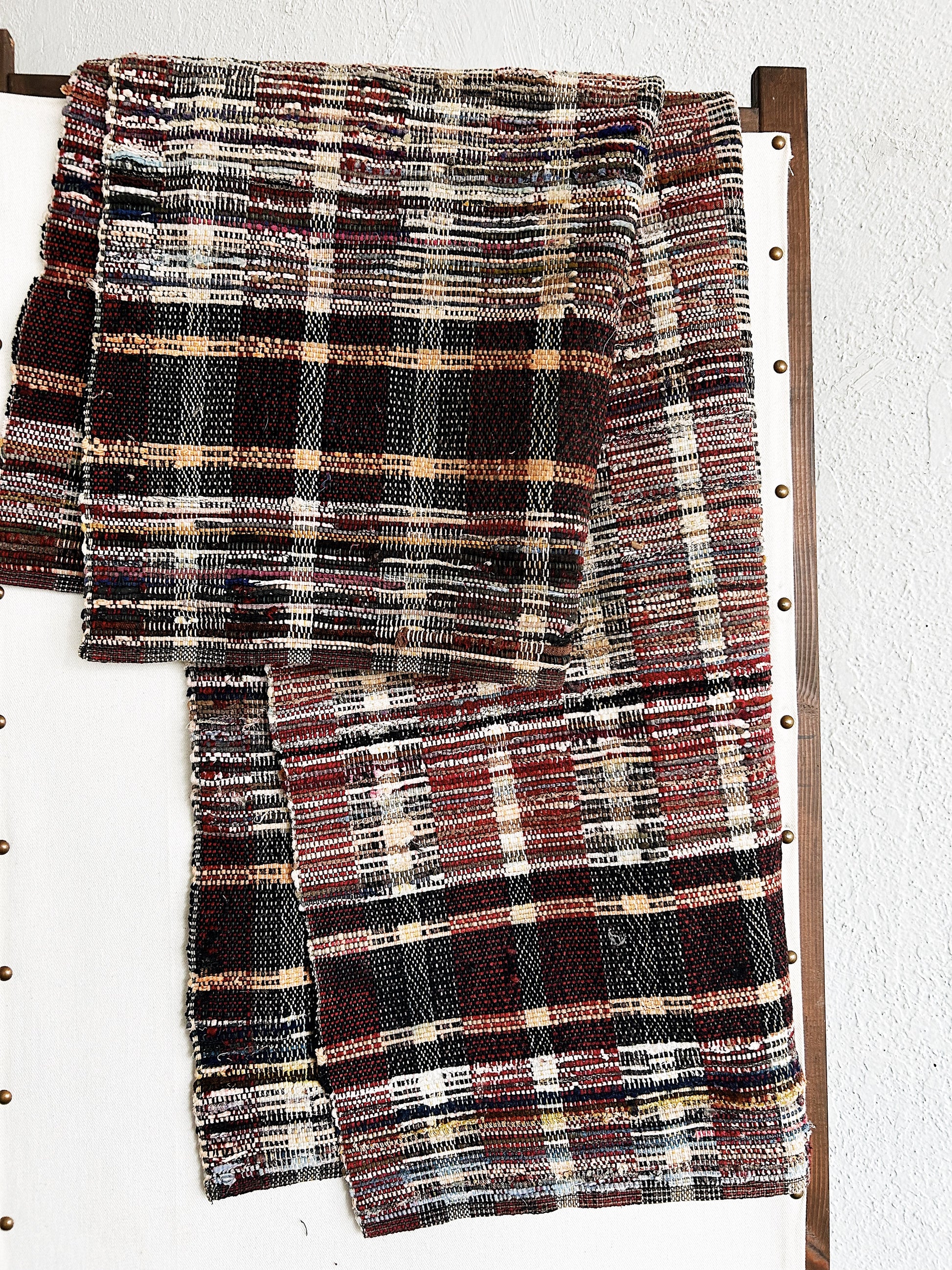 Nice earthy and cozy colors to this older rag rug. Hand woven. Perfectly oazed for end of bed, small hallway. An area of wear that doesn’t really show up when it’s on the floor but worth noting