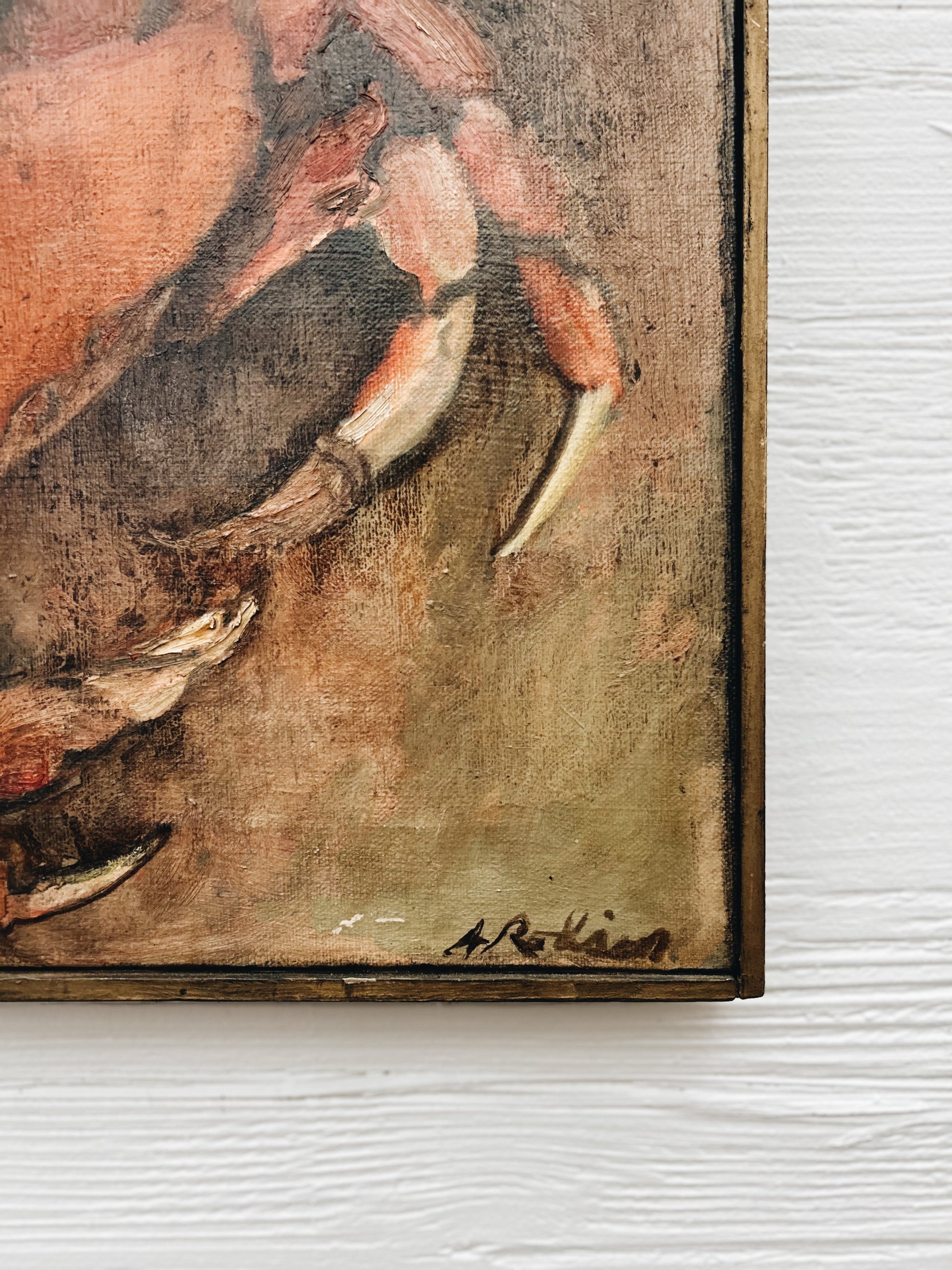 Fantastic painting of a crab in rich color. Older and painted oil on linen. Framed in a simple lathe mount. Signed.