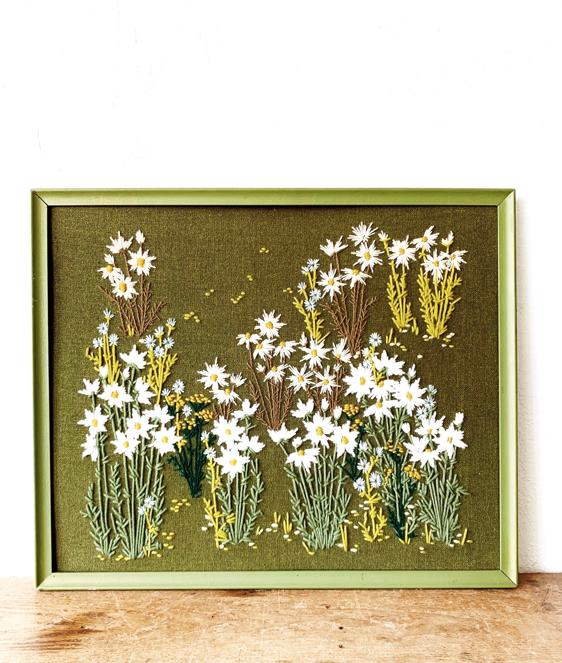 Such a sweet one from the 70’s. Crewel needlepoint daisies on wool in green wood frame.