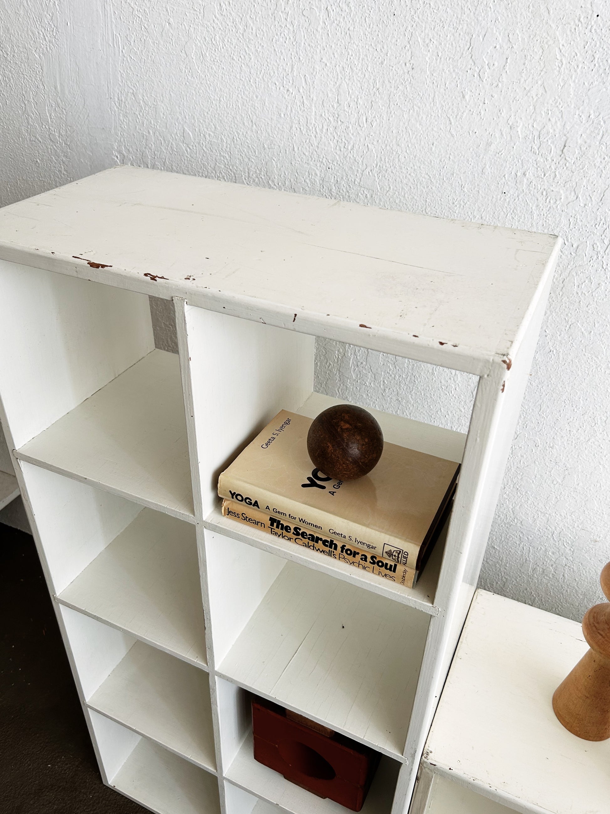 Vintage cubby shelves. Painted hardwood, one is warm white, one is plain white. Both are identical in size and wear. These shelves are sturdy and solid. And if you're up for it...there is beautiful wood underneath the paint. Marks are present but not too bad.