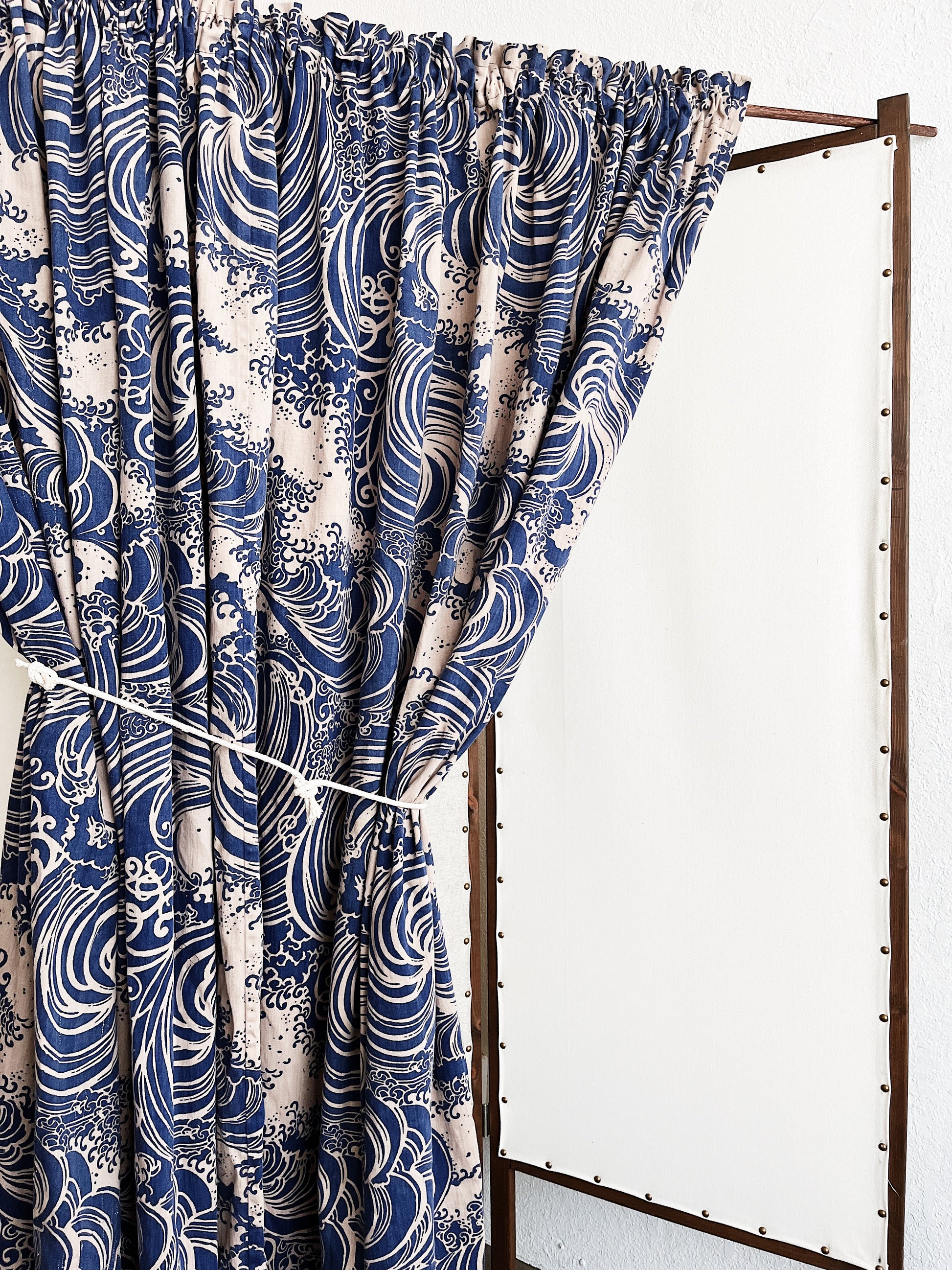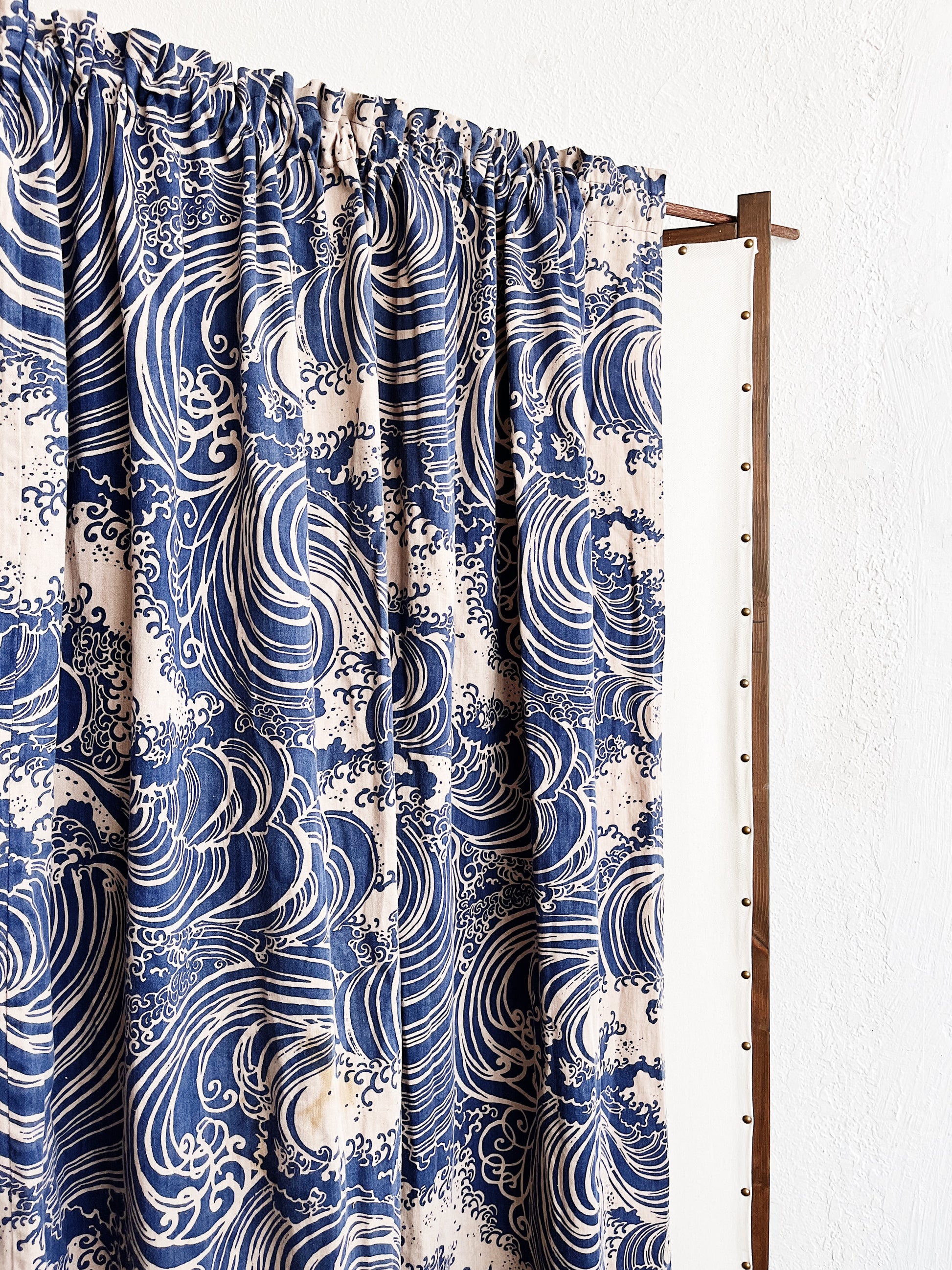 Beautiful vintage cotton curtain panel in a blue wave pattern. Lined. Looks as though two panels were sewn together…therefore you could split them again and have two good sized panels. There are a couple stains from the back that have come through a bit. Still a good amount of fabric here even with them.