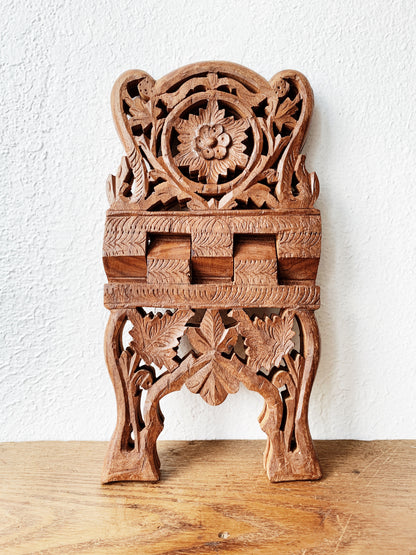 Vintage Cutout Wood Folding Book Stand. Made in India. Holds a standard size book of 8x10” and larger (or smaller).