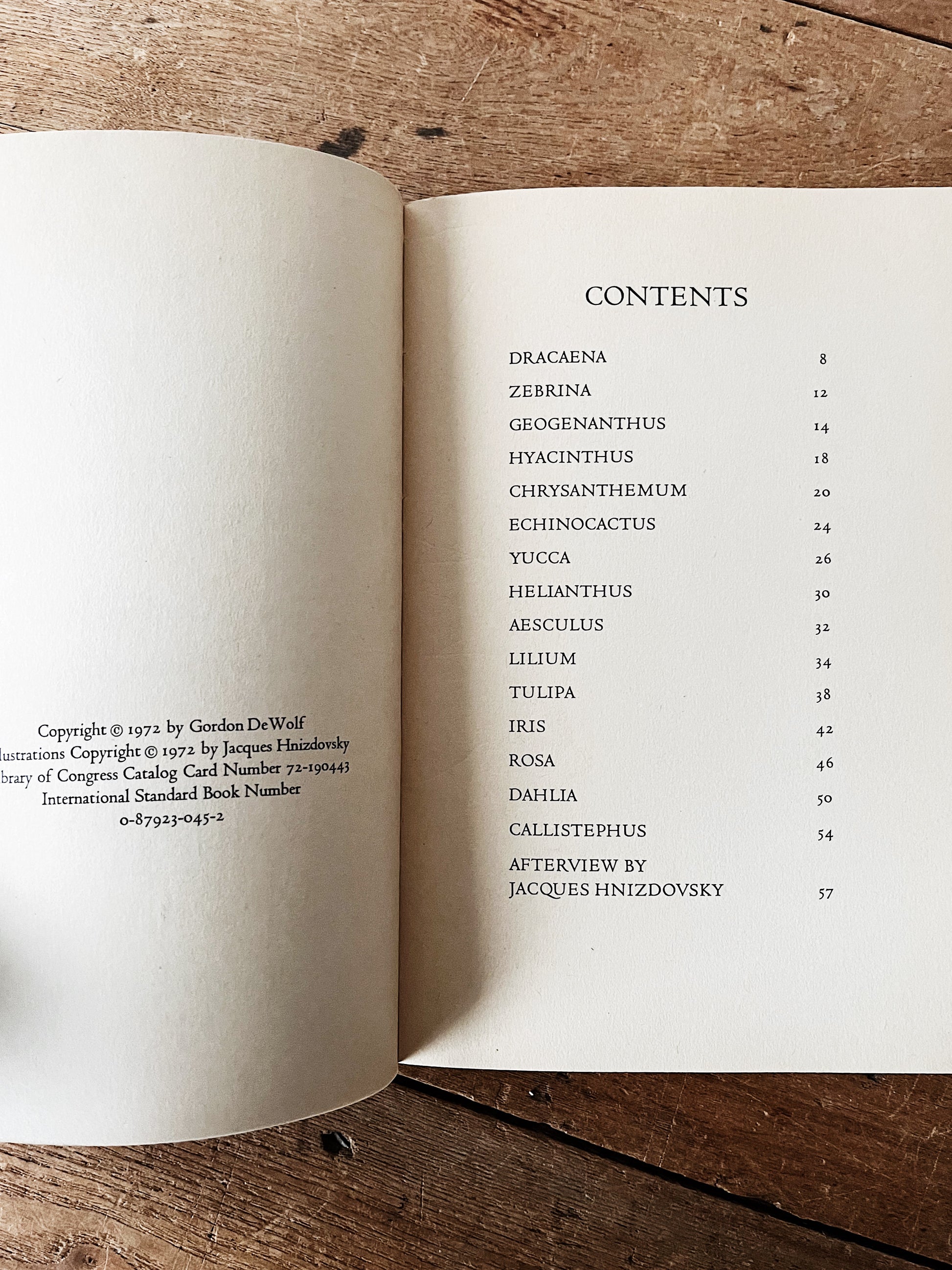 A book of Czechoslovakian floral woodcuts from 1972 by artist Jacques Hnizdovsky. This is the softcover, black and white version of the color plates we sometimes sell. On warm white paper and suitable for framing.