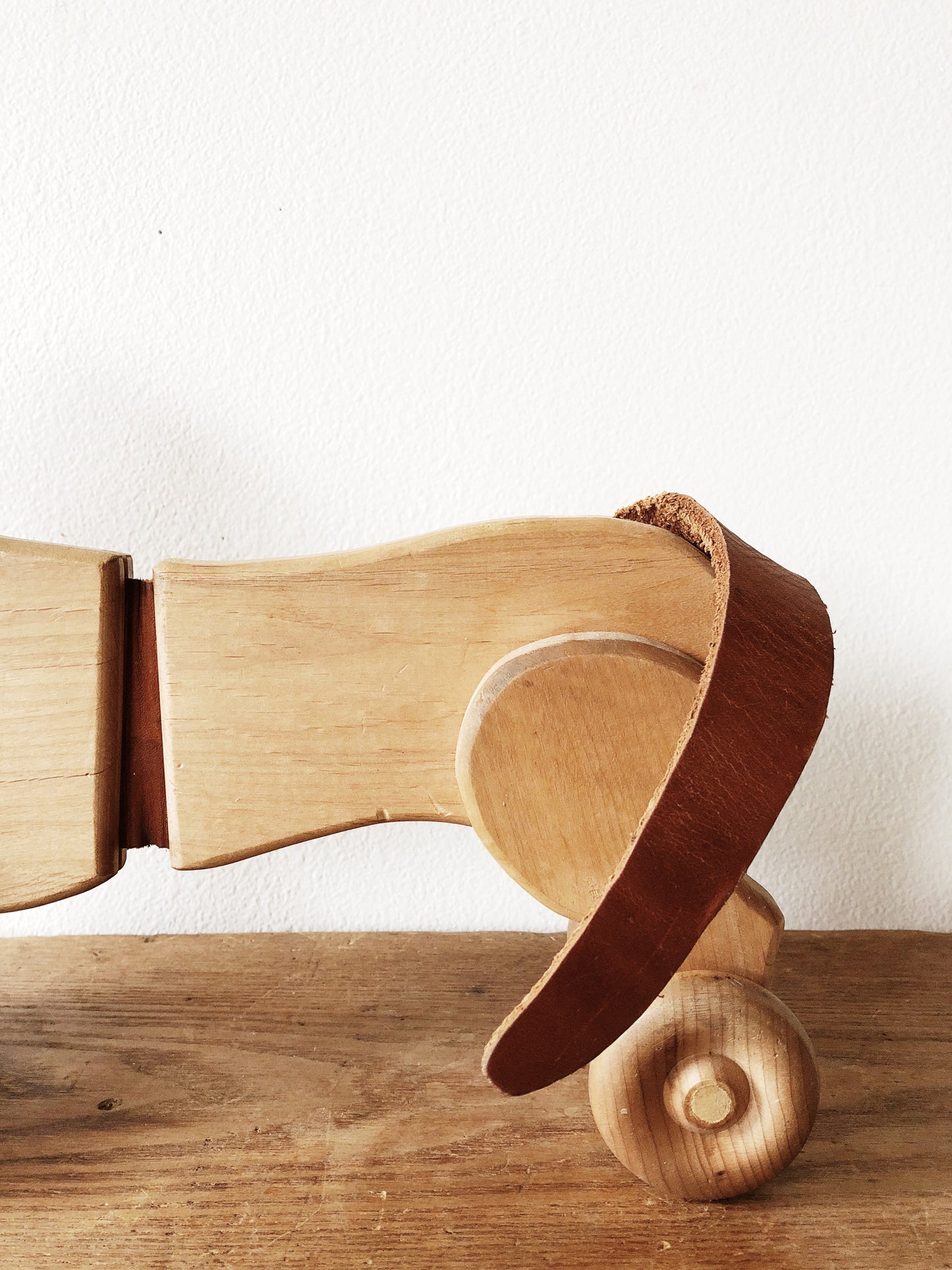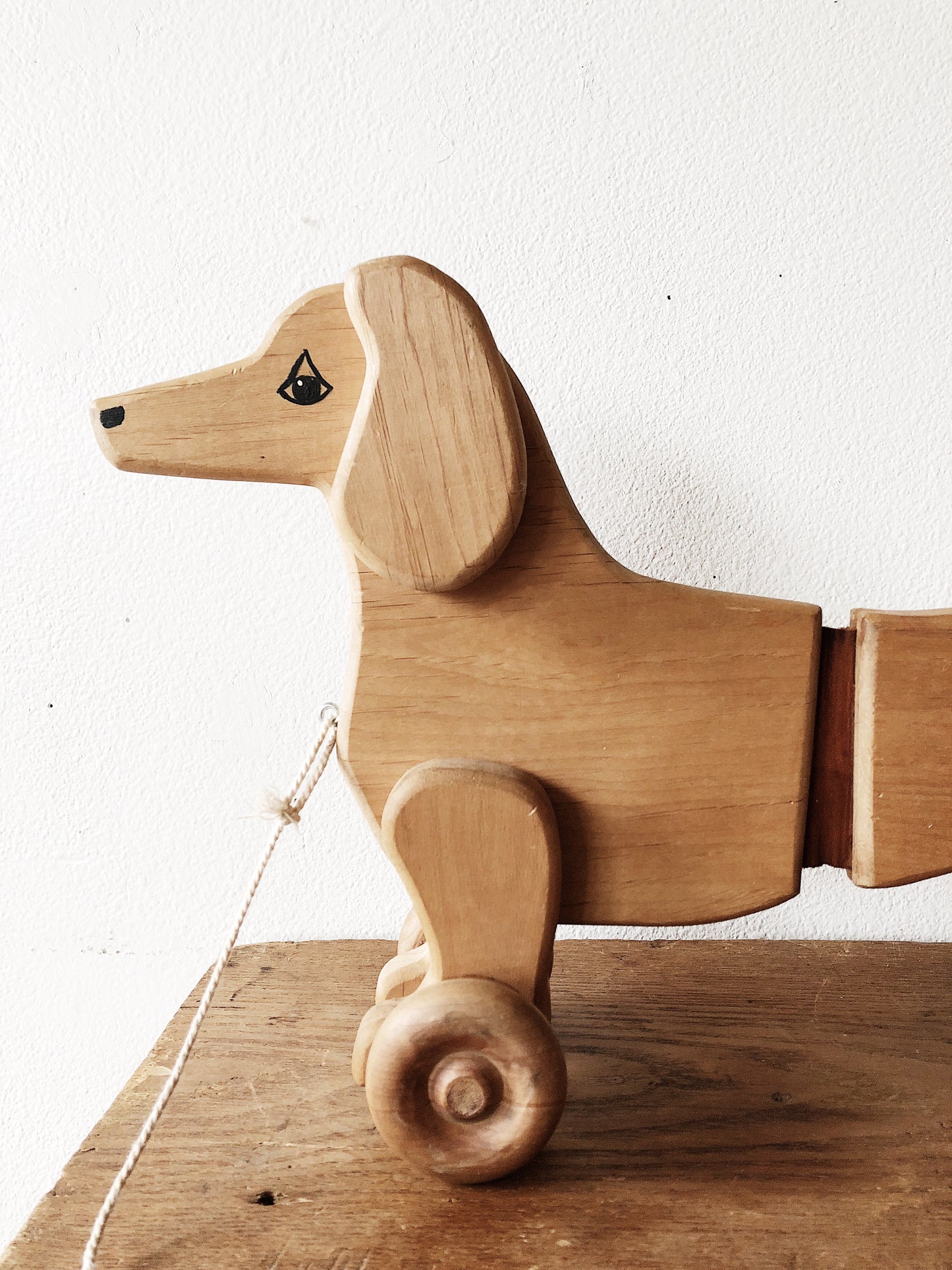 Toys were just better way back when! This vintage dachshund wooden pull toy is joined with leather to give it a little wiggle when pulled. Rolls smoothly