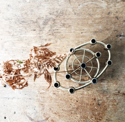 Simple and modern. Takes Danish taper candles (easily found online) or can be used to hold dried stems in the warmer light filled seasons. Plated metal