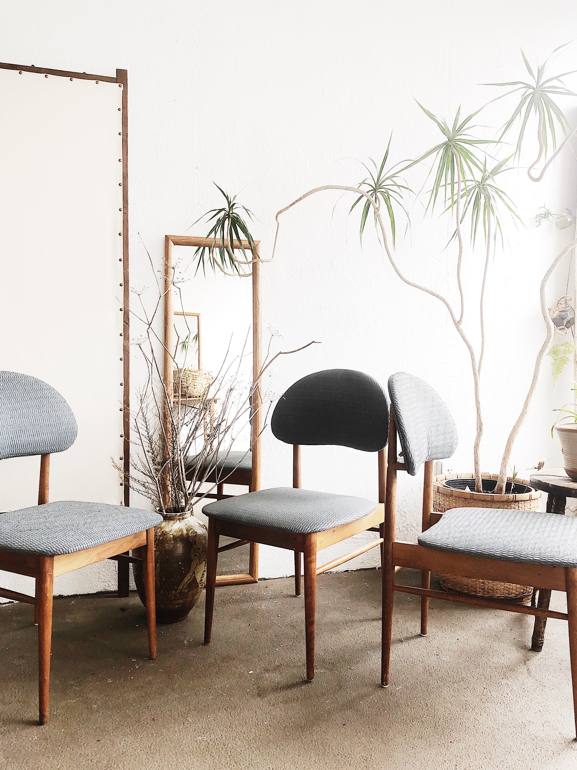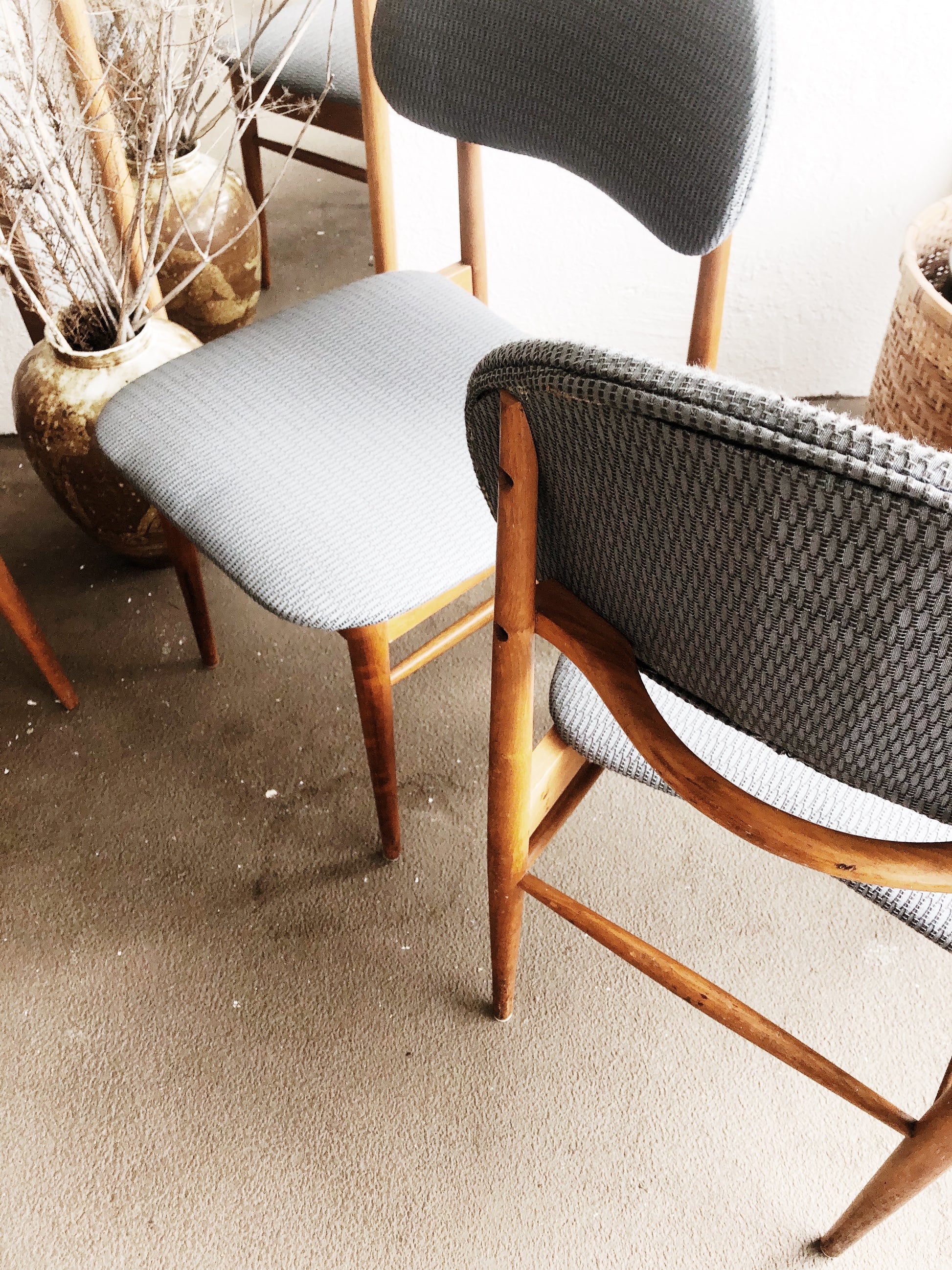 Really lovely shape to this Danish modern chair. The teak wood is mellow and smooth. It has a lower than dining height profile, and would be great as an occasional chair or clustered around a coffee table. Nubby grey blue upholstery