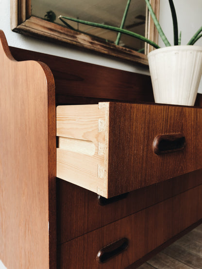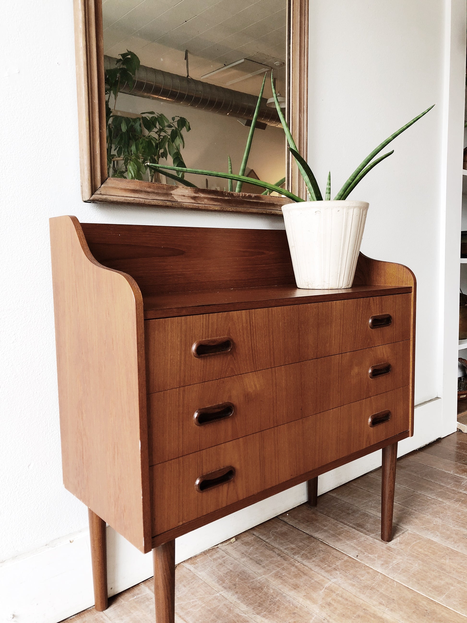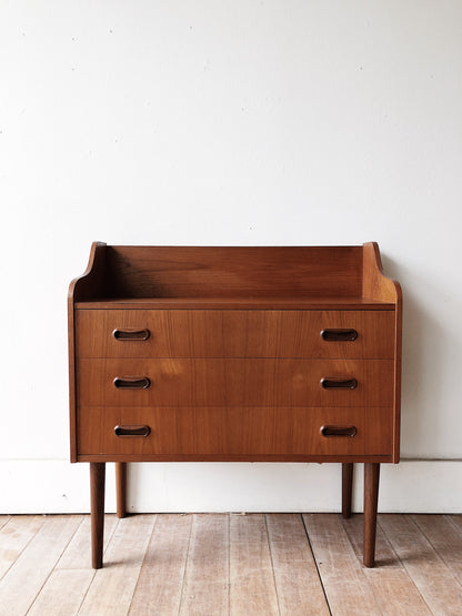 A smaller sized danish modern teak chest of drawers. Tapered legs and dovetailed joints. Perfectly proportioned for next to the bed, a small flat screen tv or an entryway.