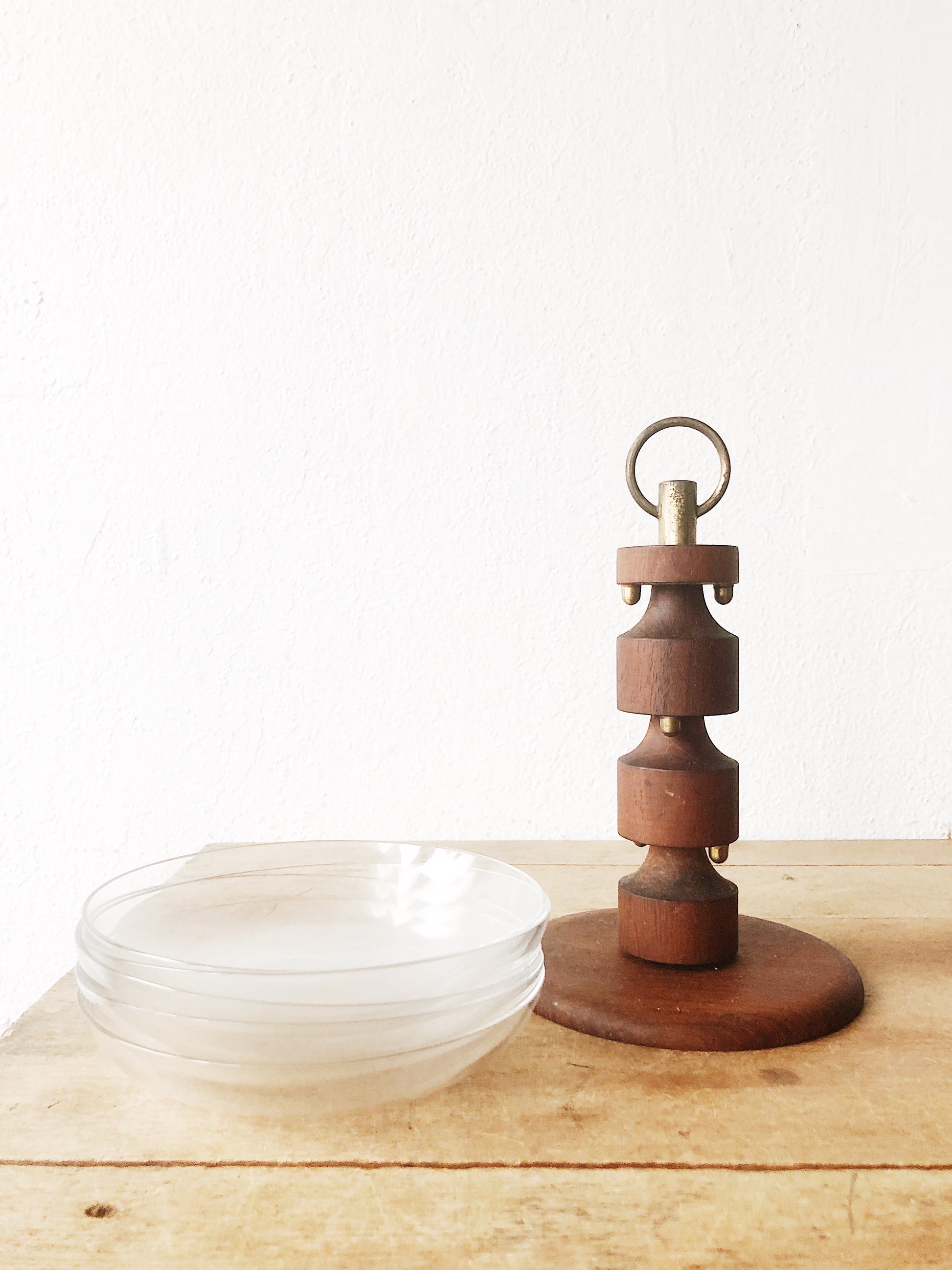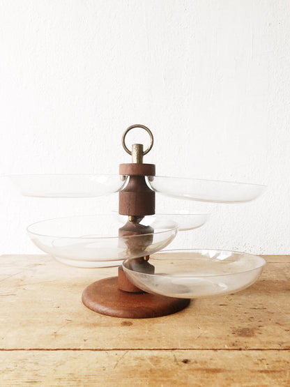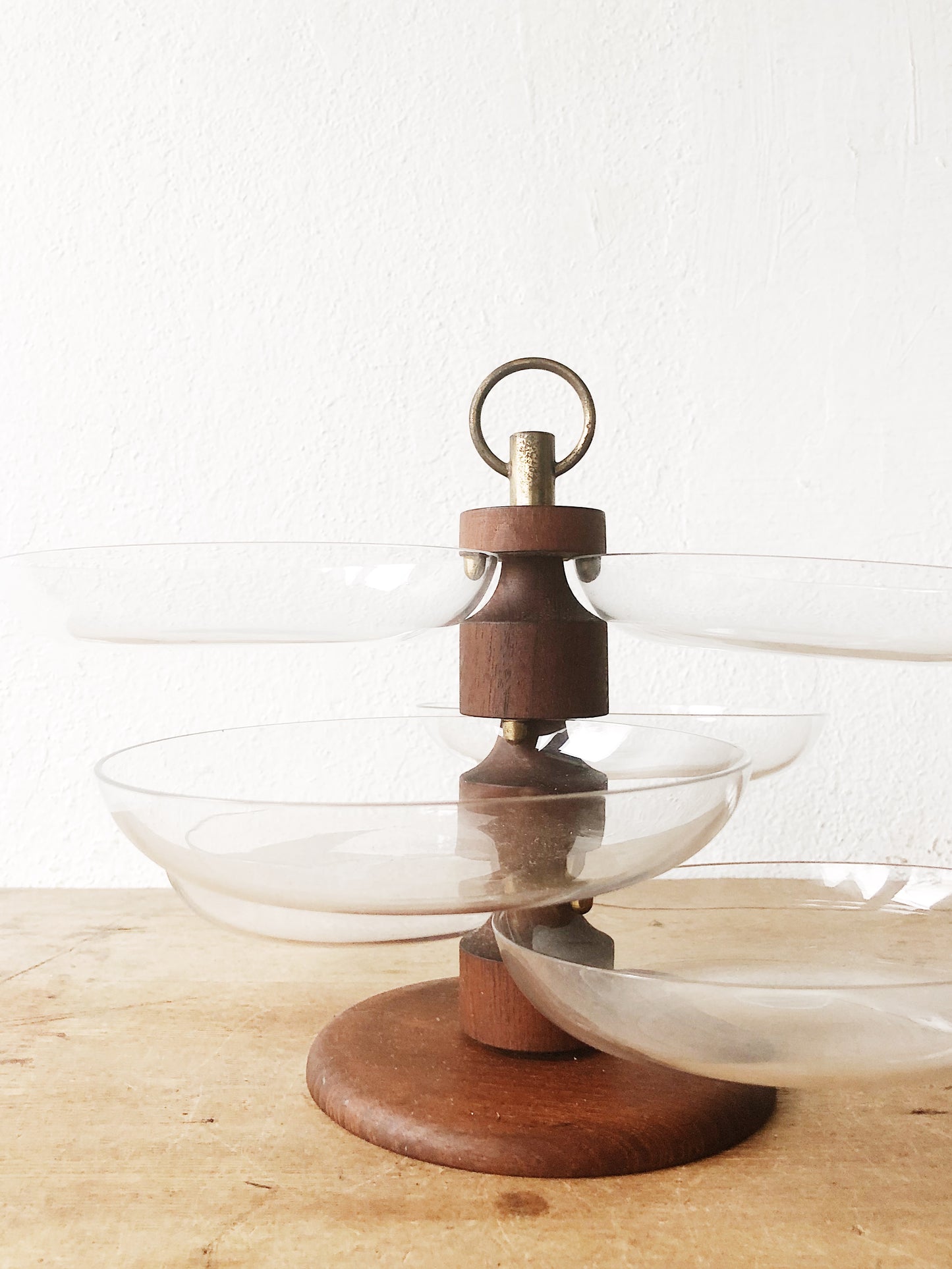 Unique server from Denmark. Glass bowls which rest cantilevered on a teak and brass holder. Lovely for serving but can also be used to hold jewelry