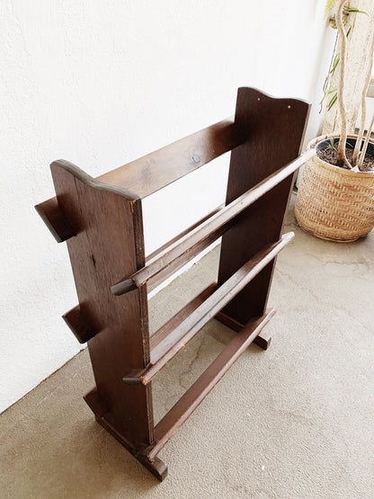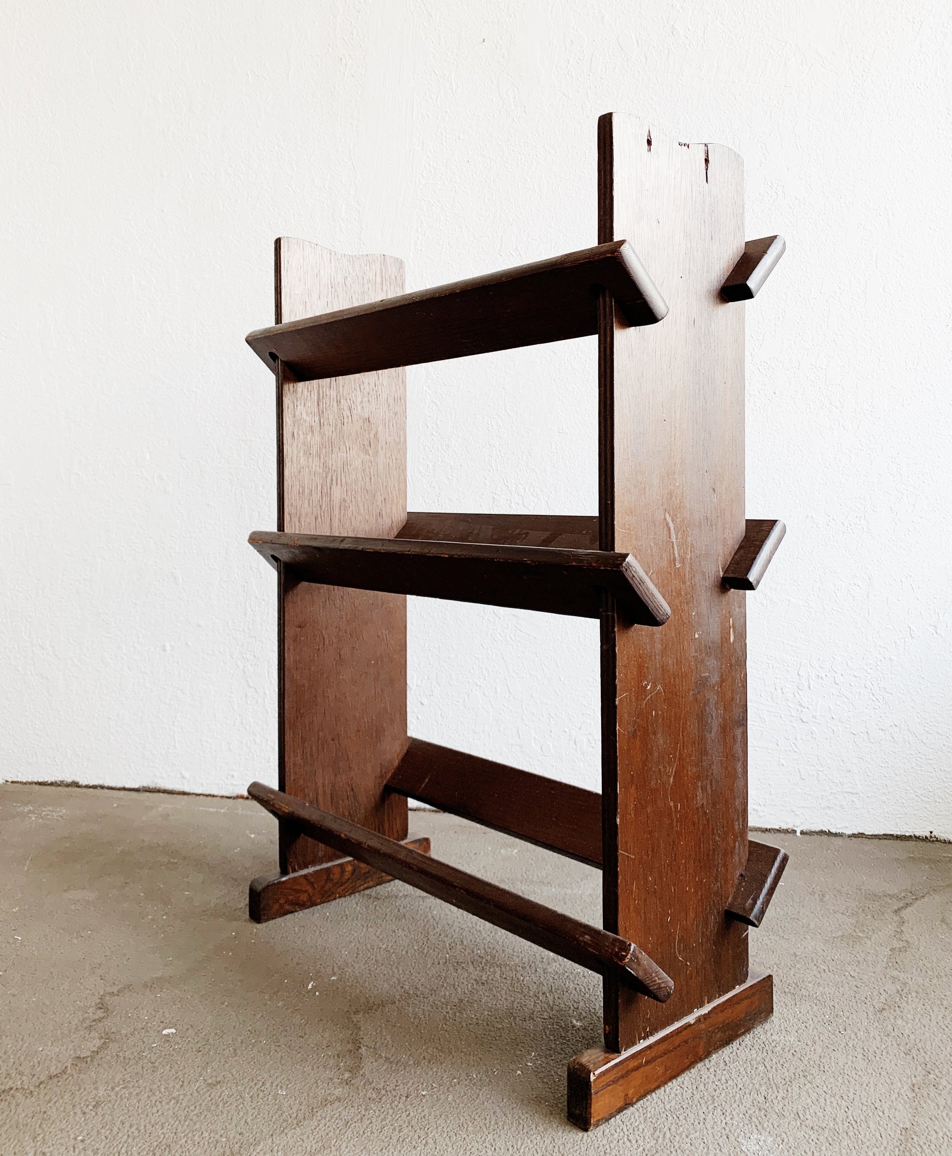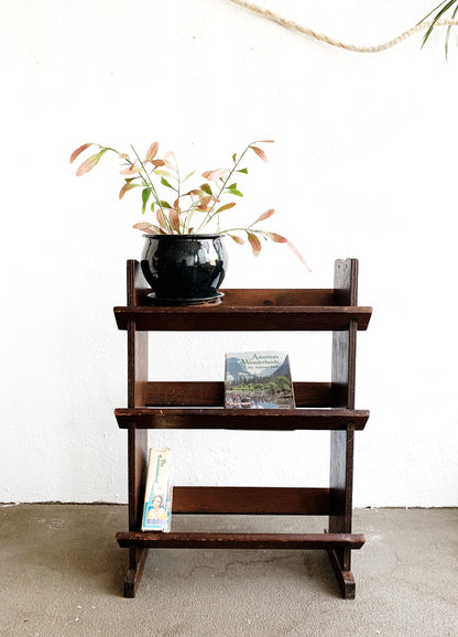 Dark wood vintage book stand, simple with primitive leanings. Can hold a lot of books! Other items as well, like baskets and plants. Appears to be handmade, slatted sides. A great addition to your home! Especially good for small spaces.