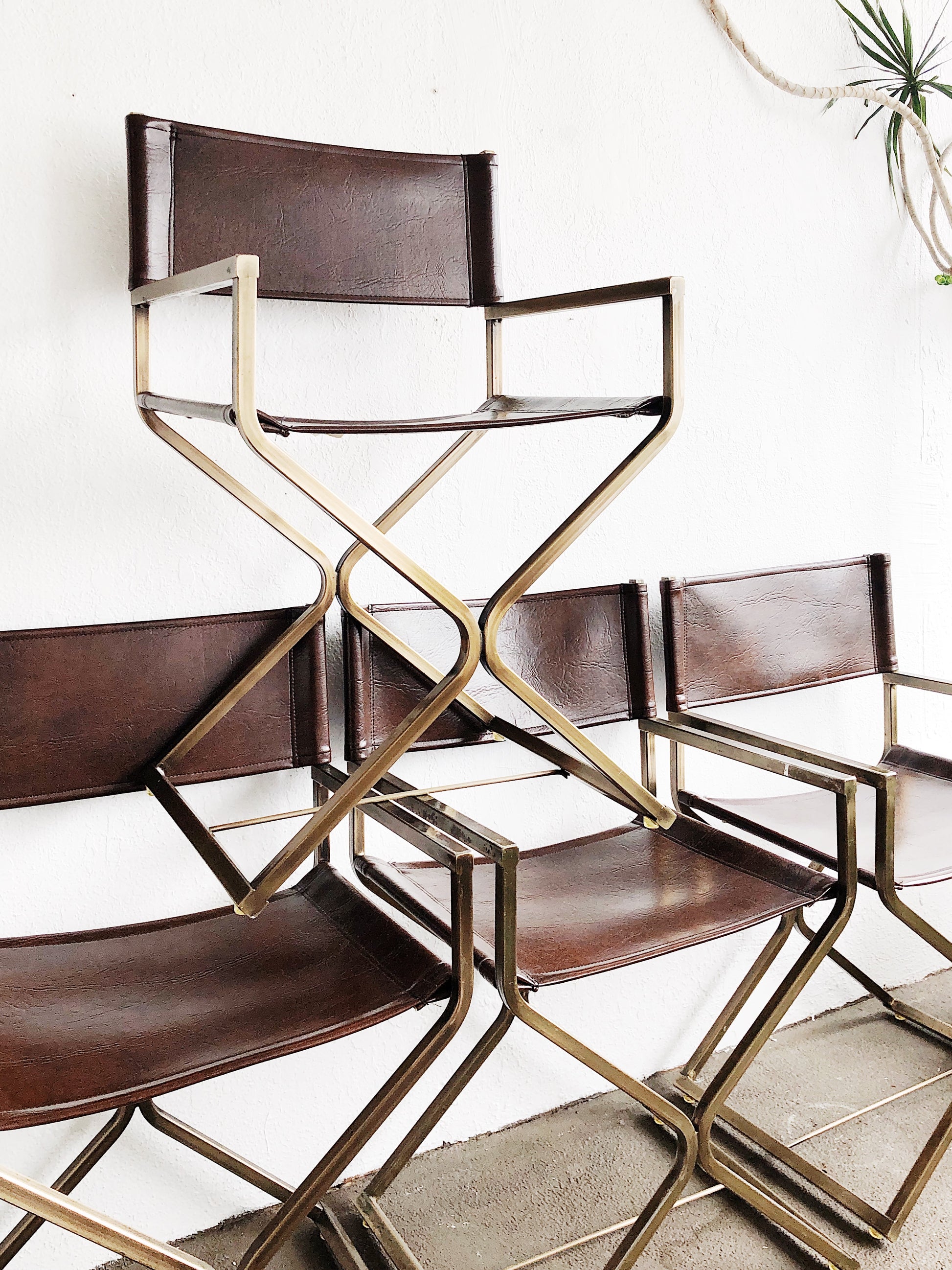 Vintage Daystrom - Virtue of California directors chairs. Hollywood Regency style circa 1960/70. Featured in brown leather look vinyl and brass toned base. Cross bar at base. Very sturdy. Nice around a table.