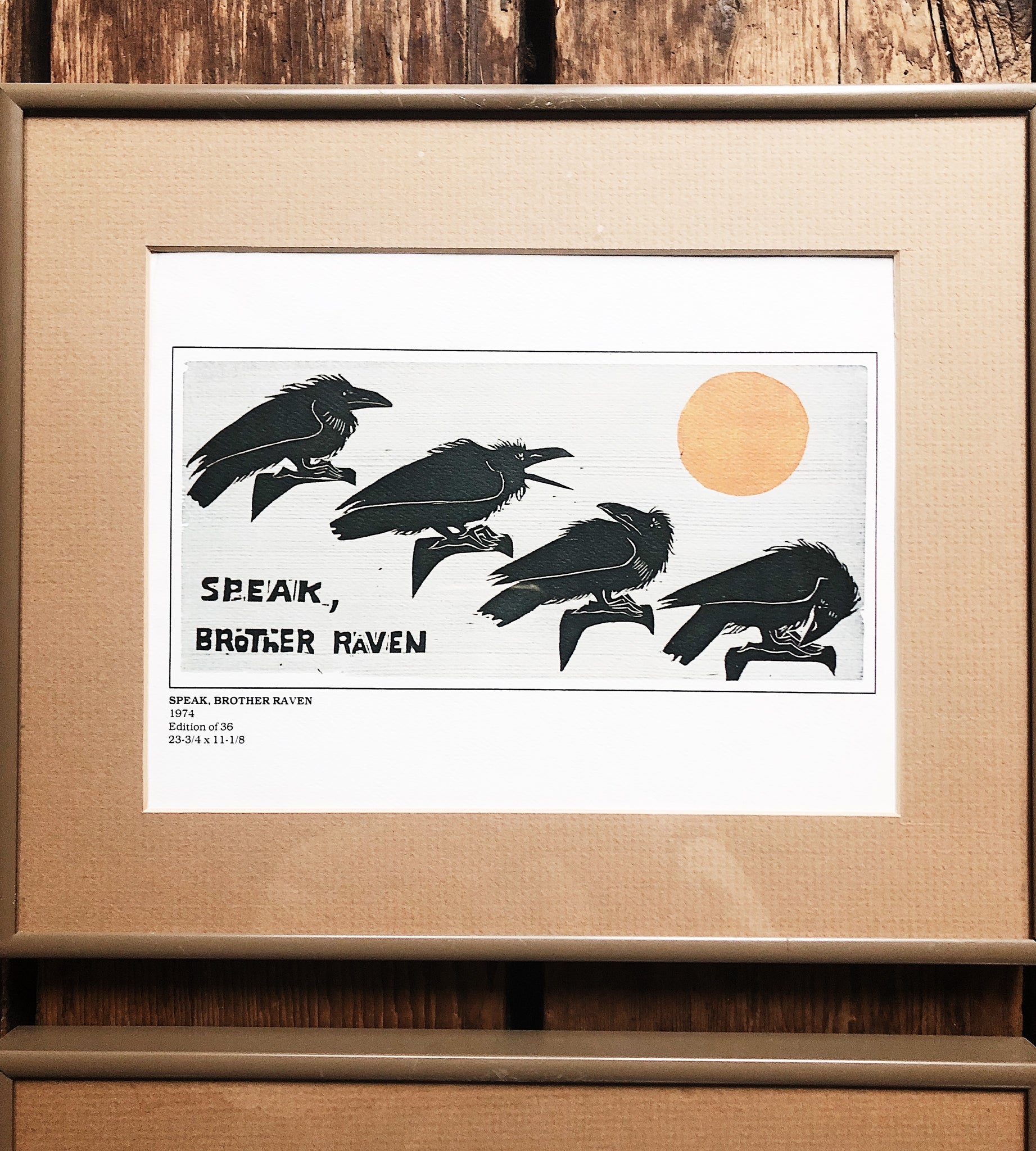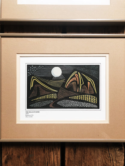 A beautiful print of an original woodcut by Dale De Armond. Focusing on the Inuit peoples of Alaska and the surrounding landscapes, her work has a lovely simplicity and depth. Museum mounted metal frames