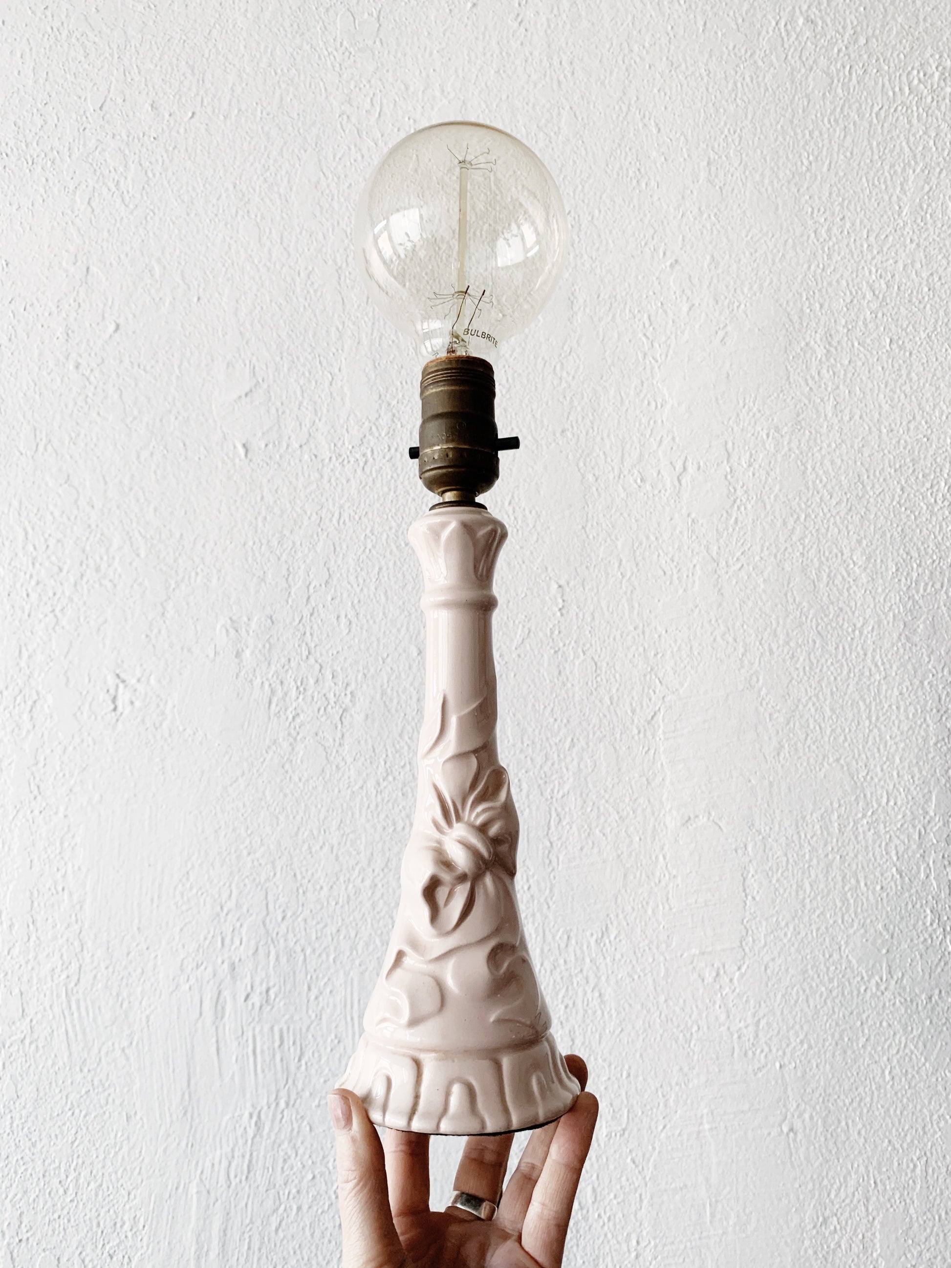Sweet little deco style ceramic lamp in pale pink. Perfect bedside or in the bathroom. Comes with vintage clamp on shade.