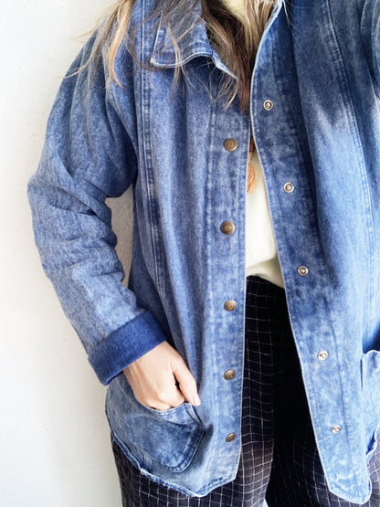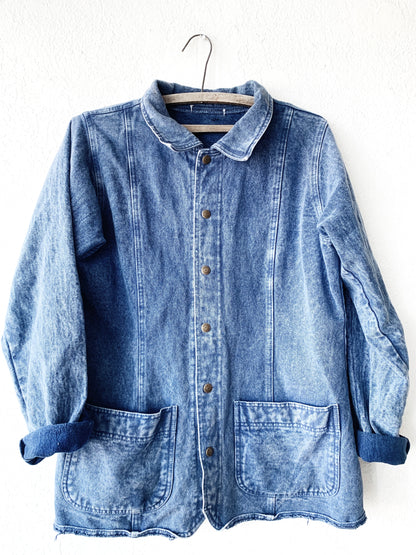 Vintage slightly acid washed soft denim chore jacket with snaps and pockets. Super soft and comfortable. Fit is a pretty solid m/l
