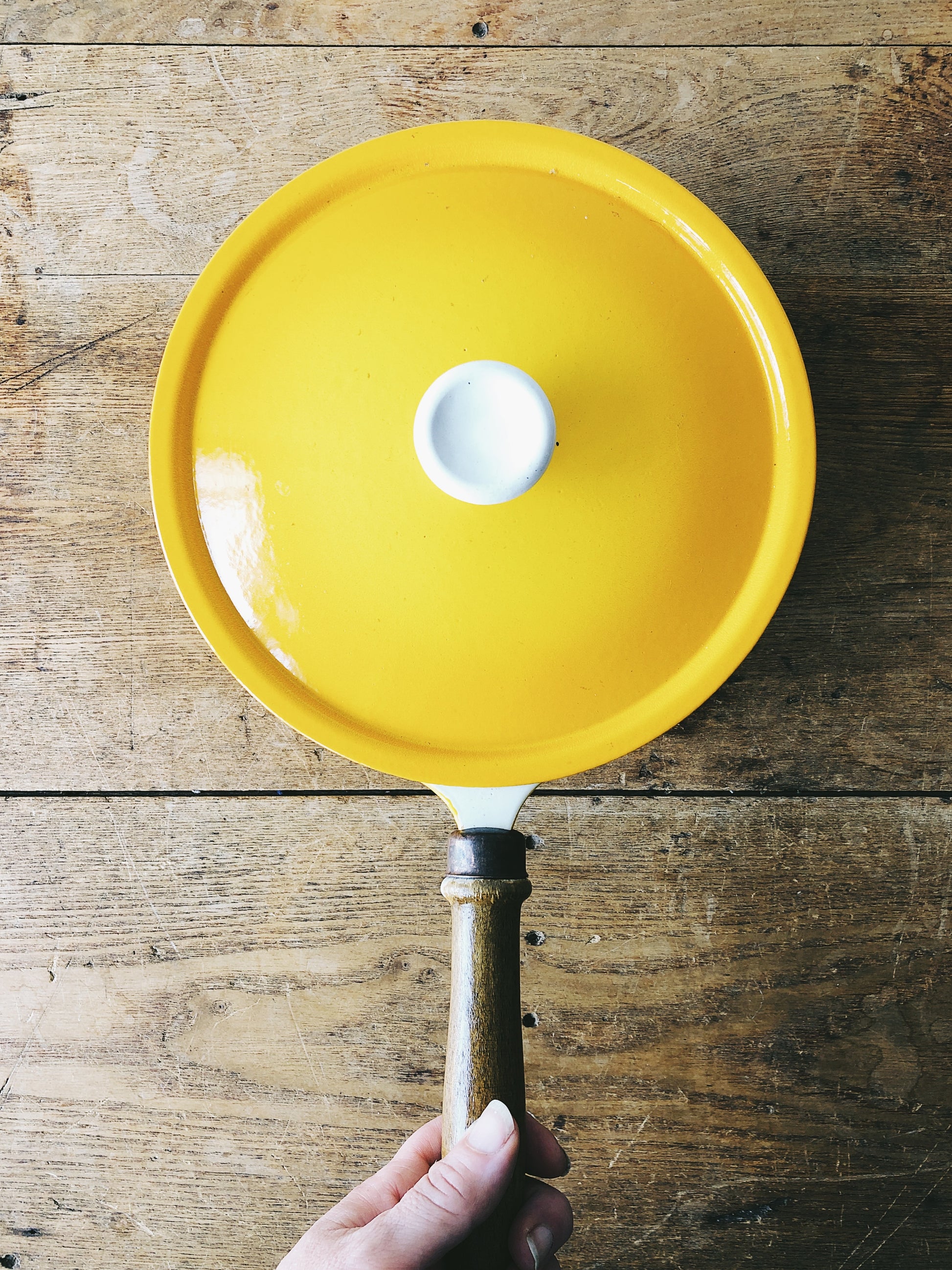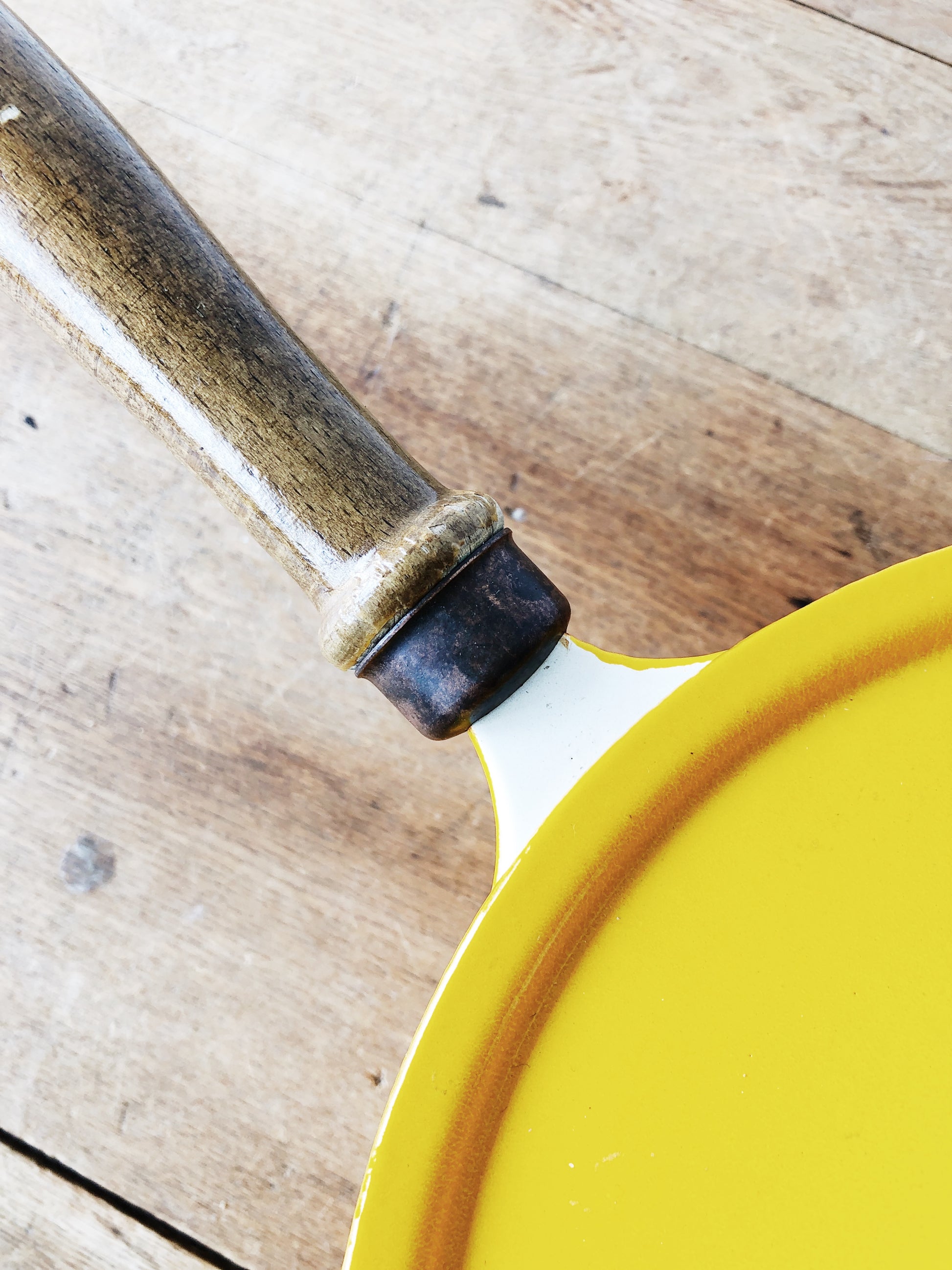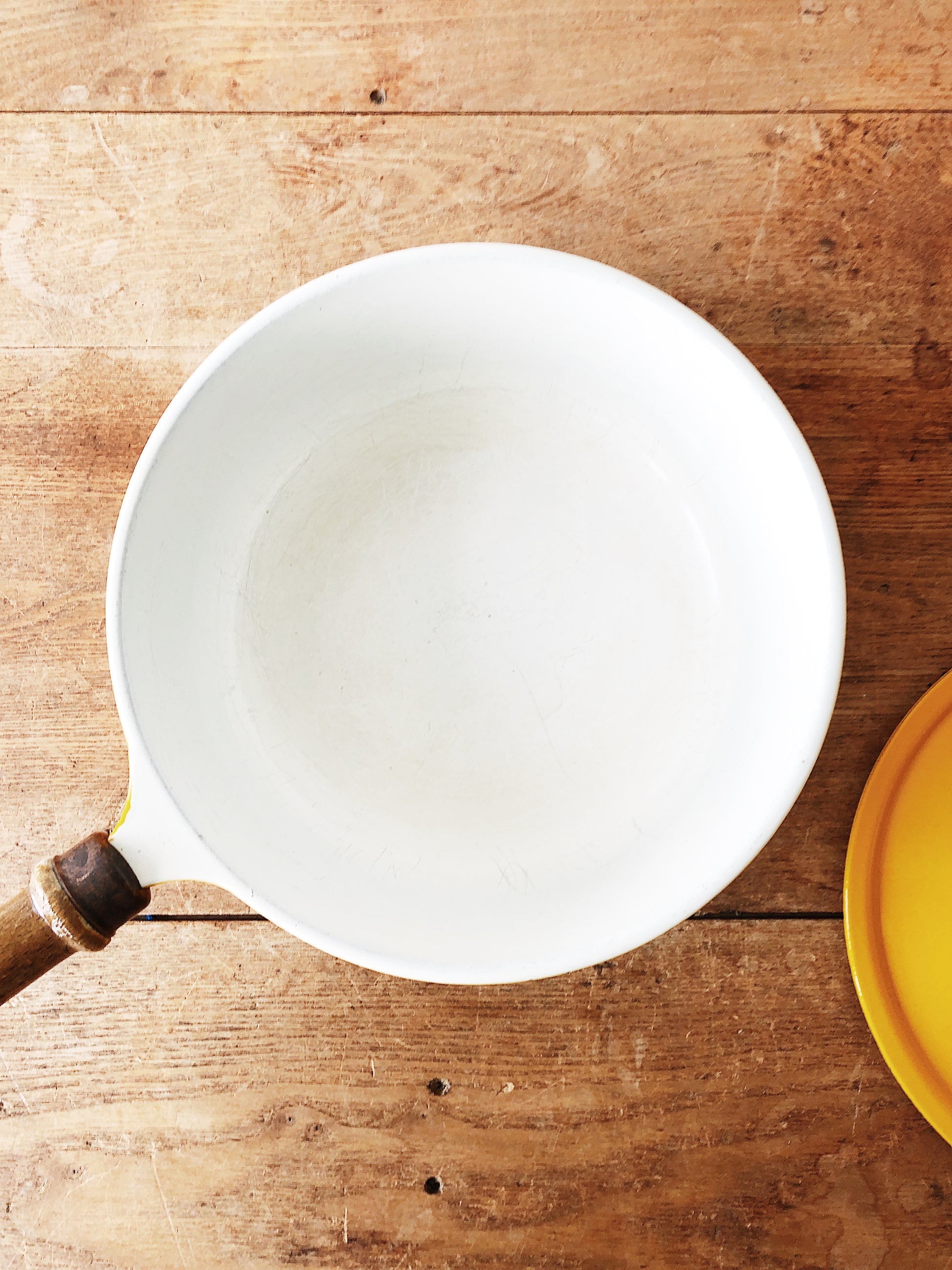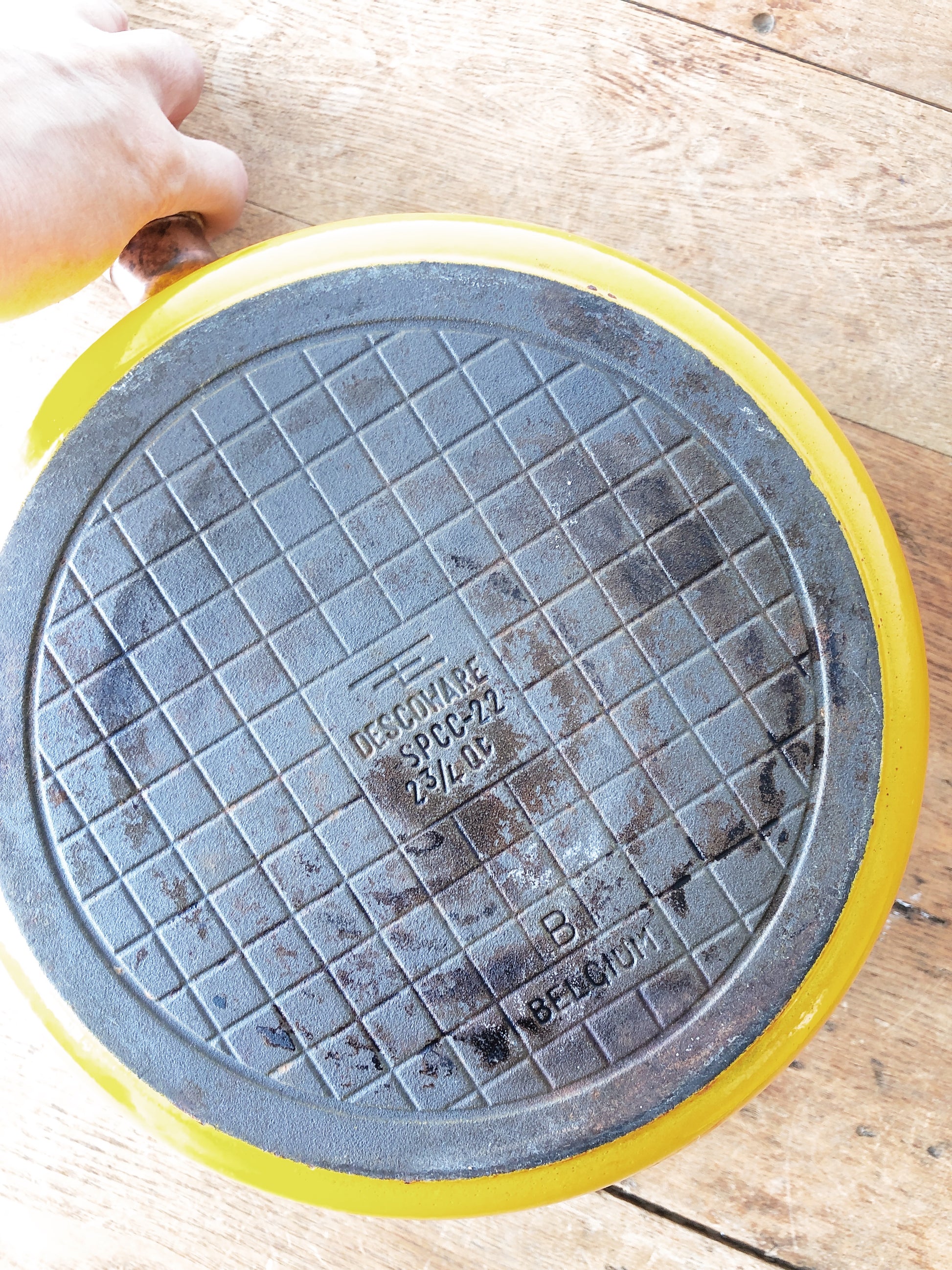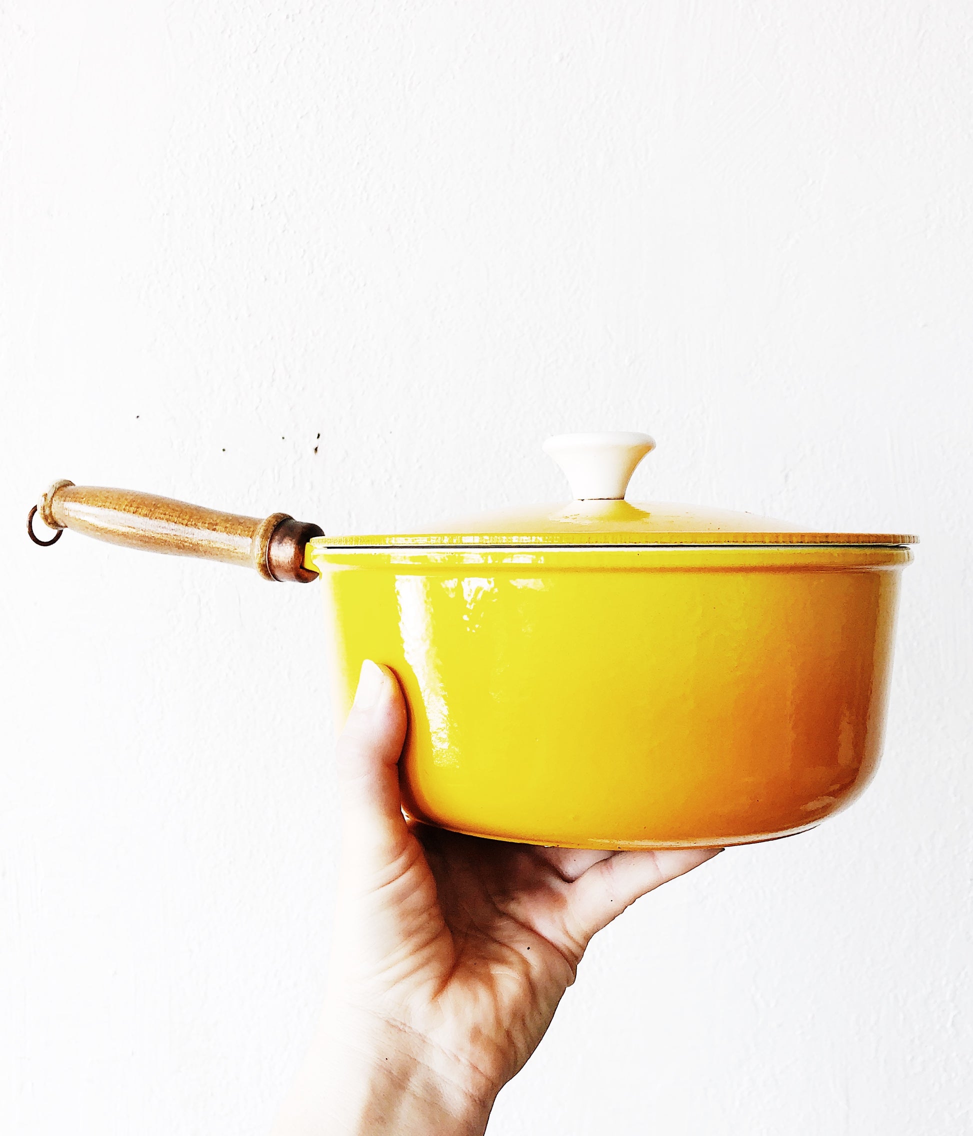 Julia’s choice! Vintage descoware enamelware cast iron sauce pot from Belgium. Made in the 1930s. Lighter than le crueset with the same quality. The color is a sunny yellow mixed with orange Called yellow flame.