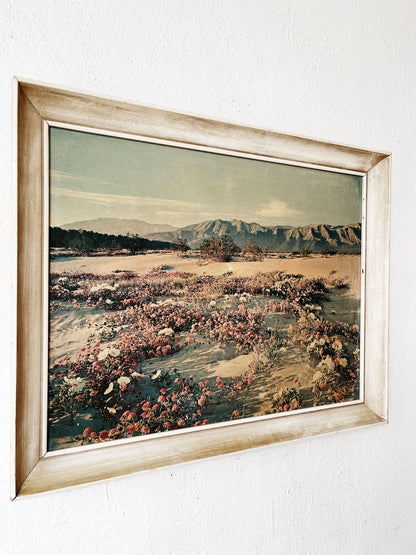 Pretty 1950s desert landscape in a mid century wood frame. No glass. Hand colored Pressed paper litho. On the larger size