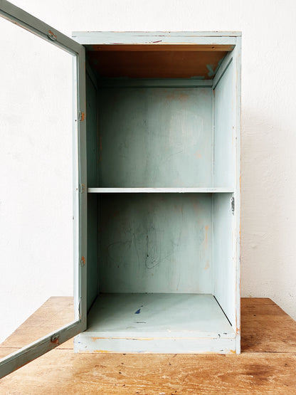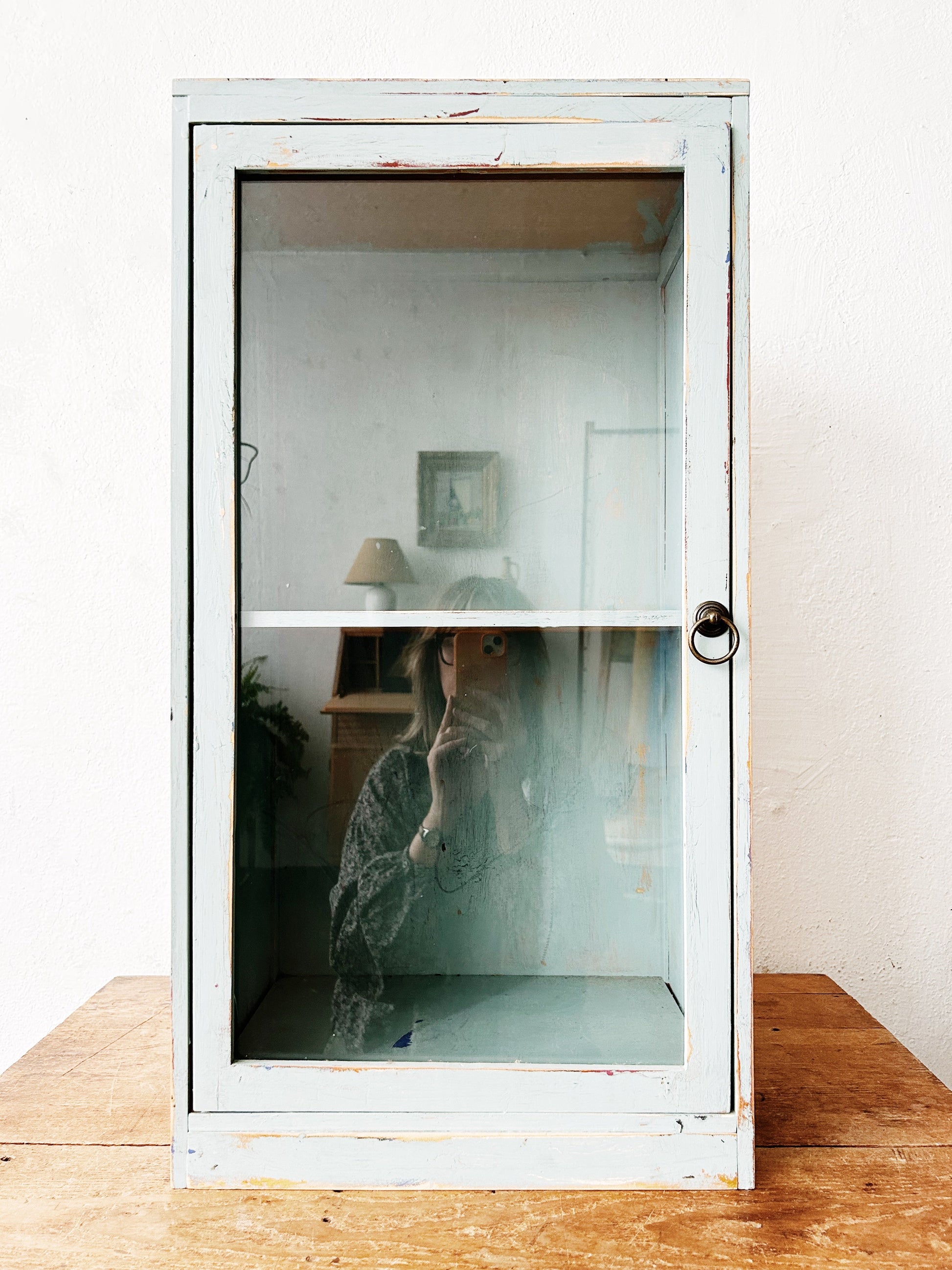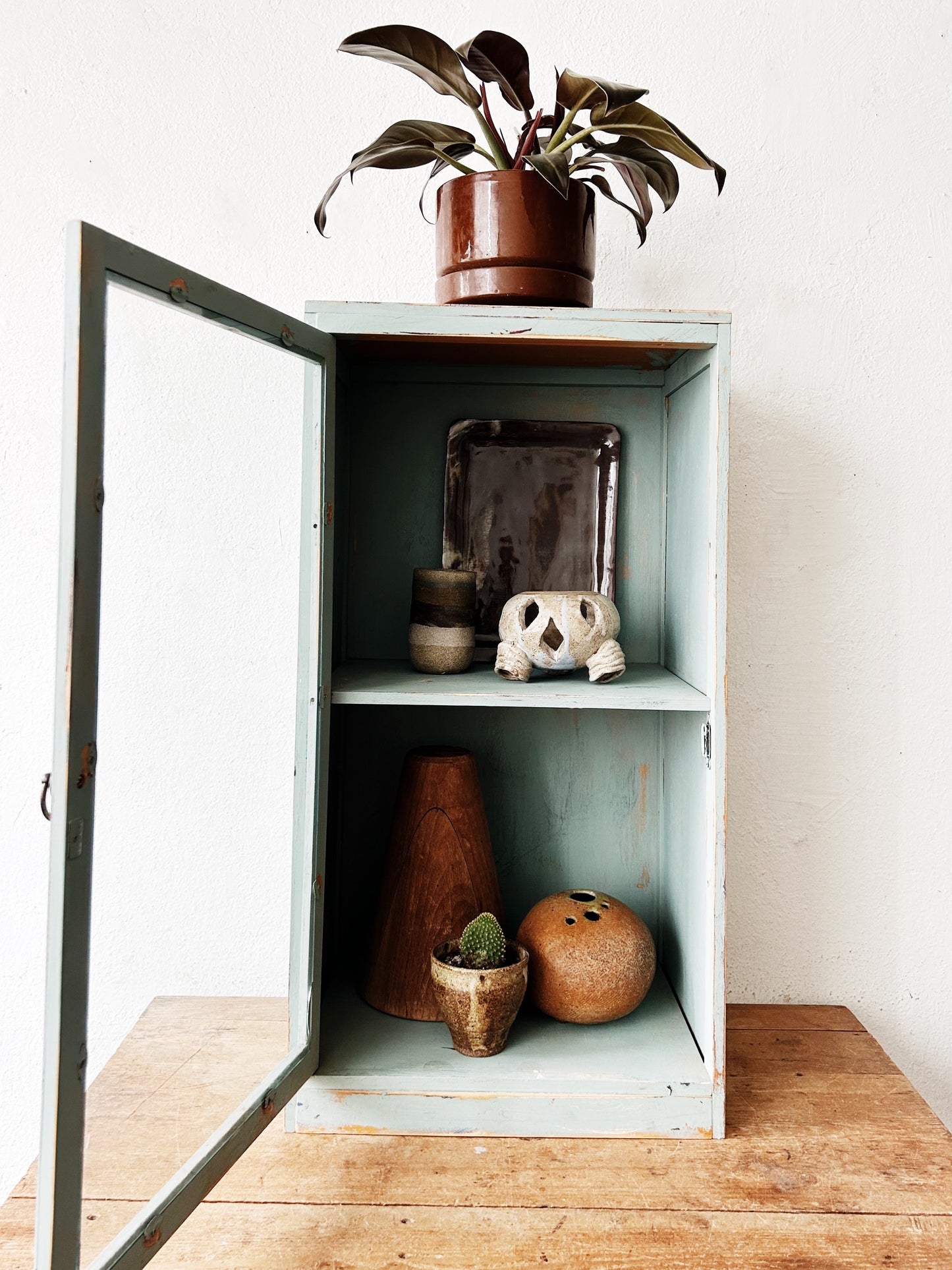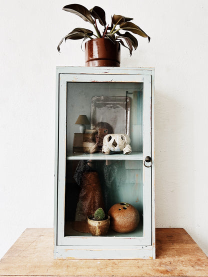 Wonderful wood vase with glass door. Painted a rustic flat robins egg blue. Awesome in the kitchen/dining / bathroom! Sits or has two hangers on back to mount it on the wall