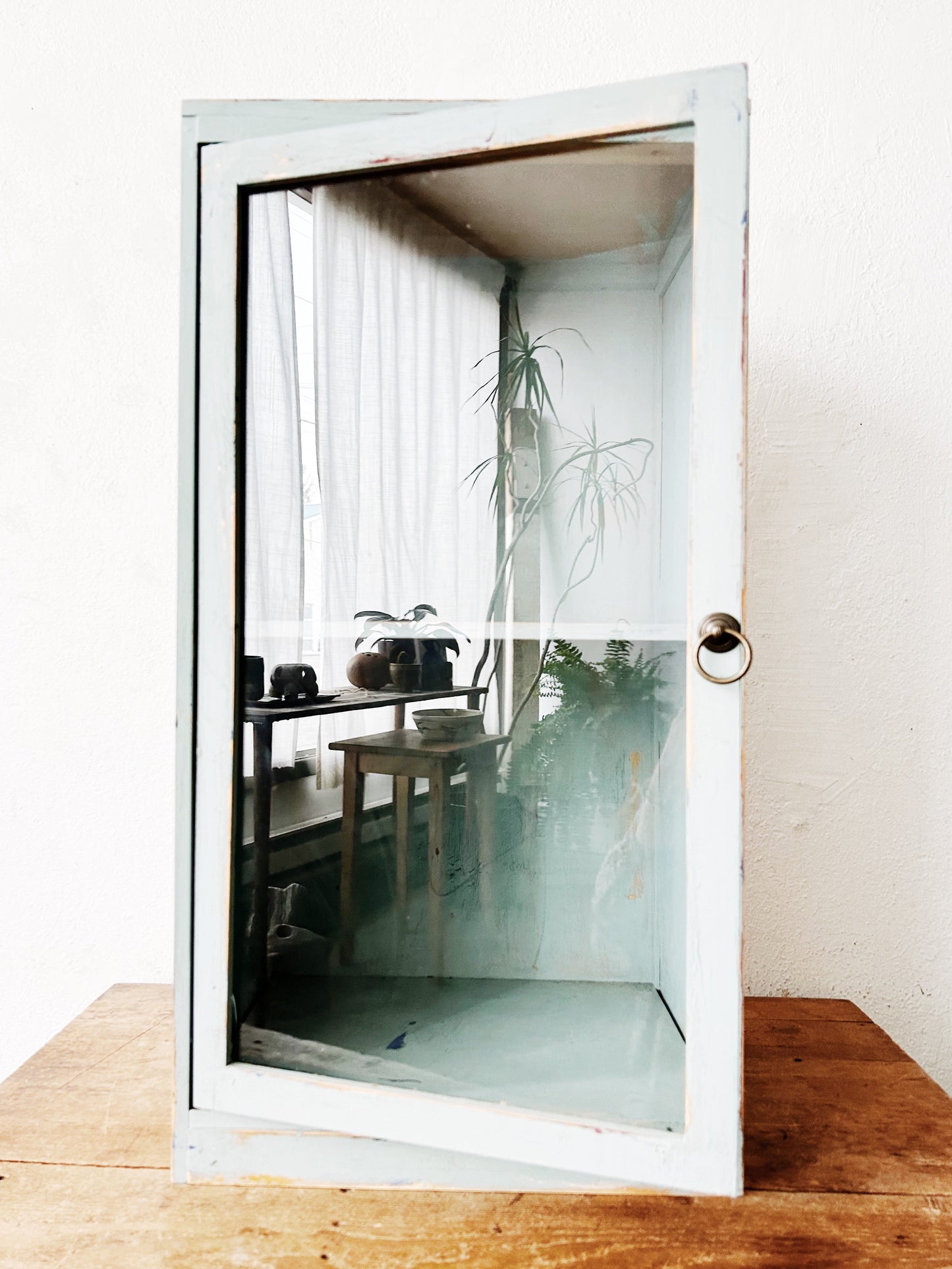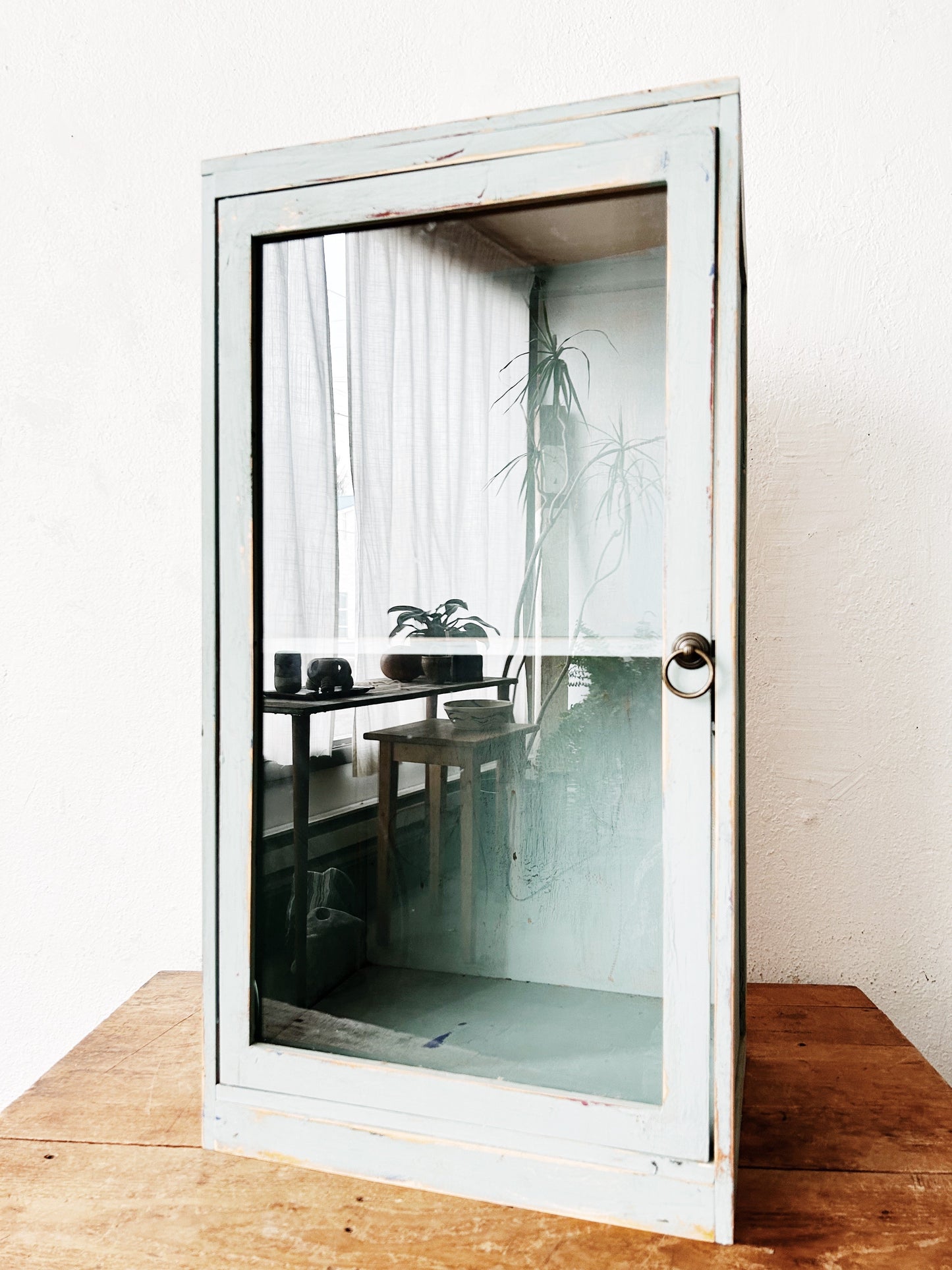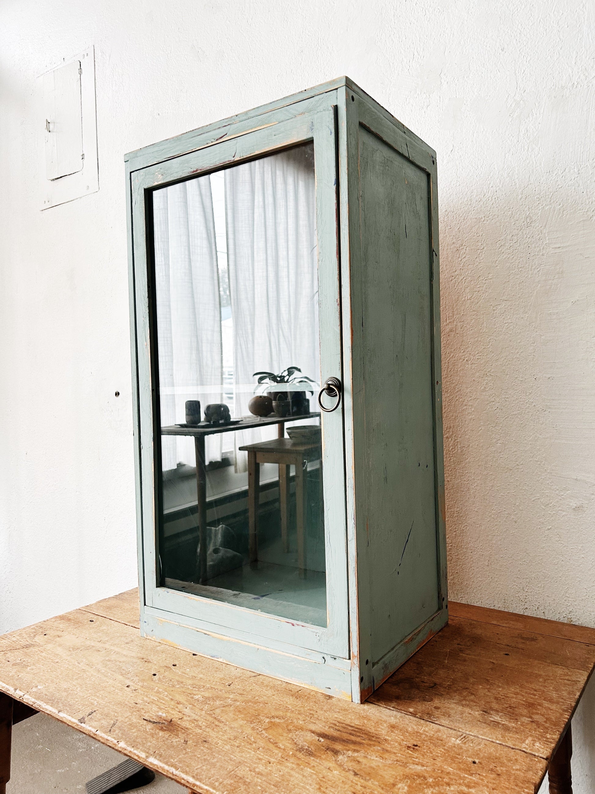 Wonderful wood vase with glass door. Painted a rustic flat robins egg blue. Awesome in the kitchen/dining / bathroom! Sits or has two hangers on back to mount it on the wall