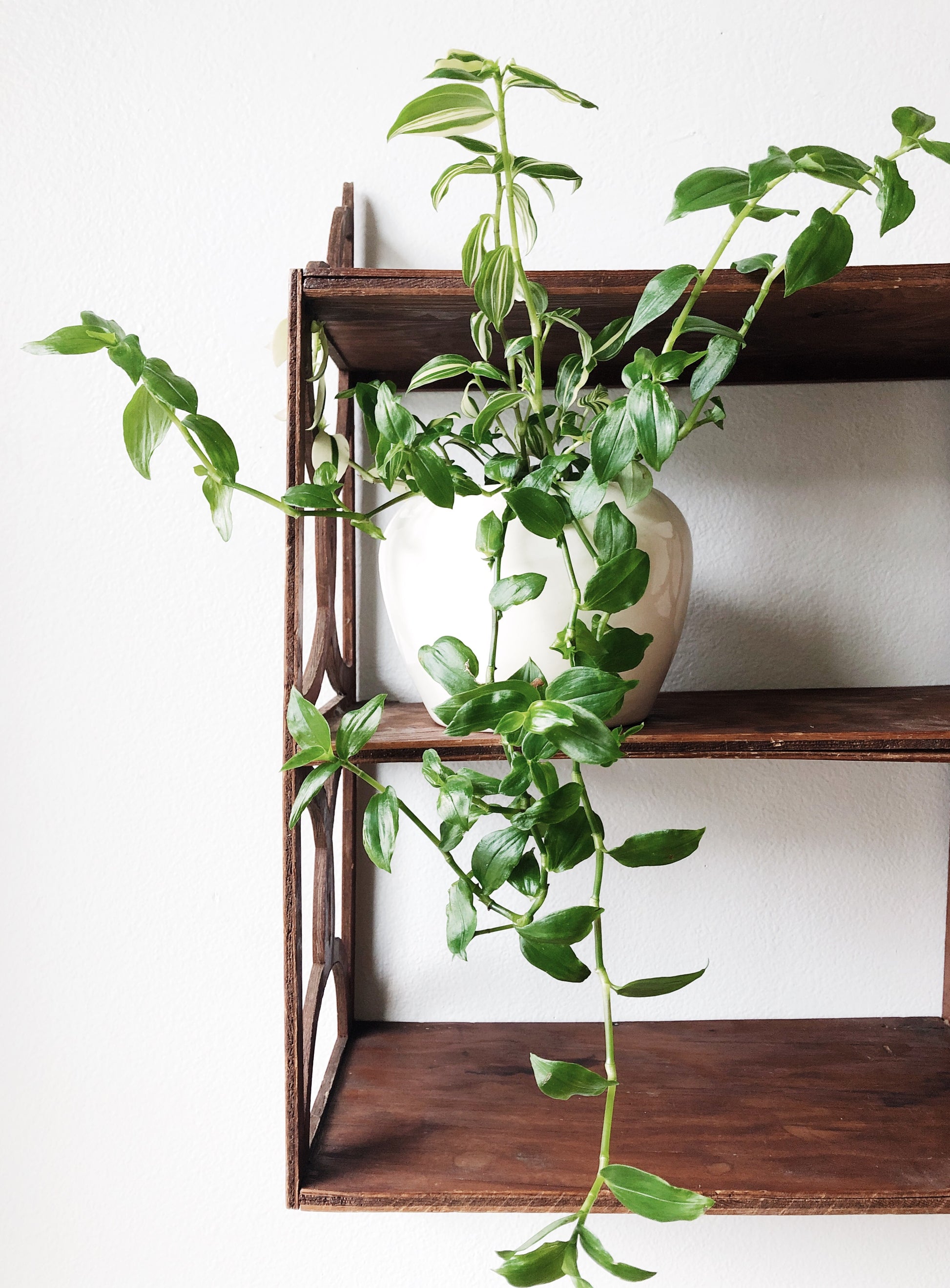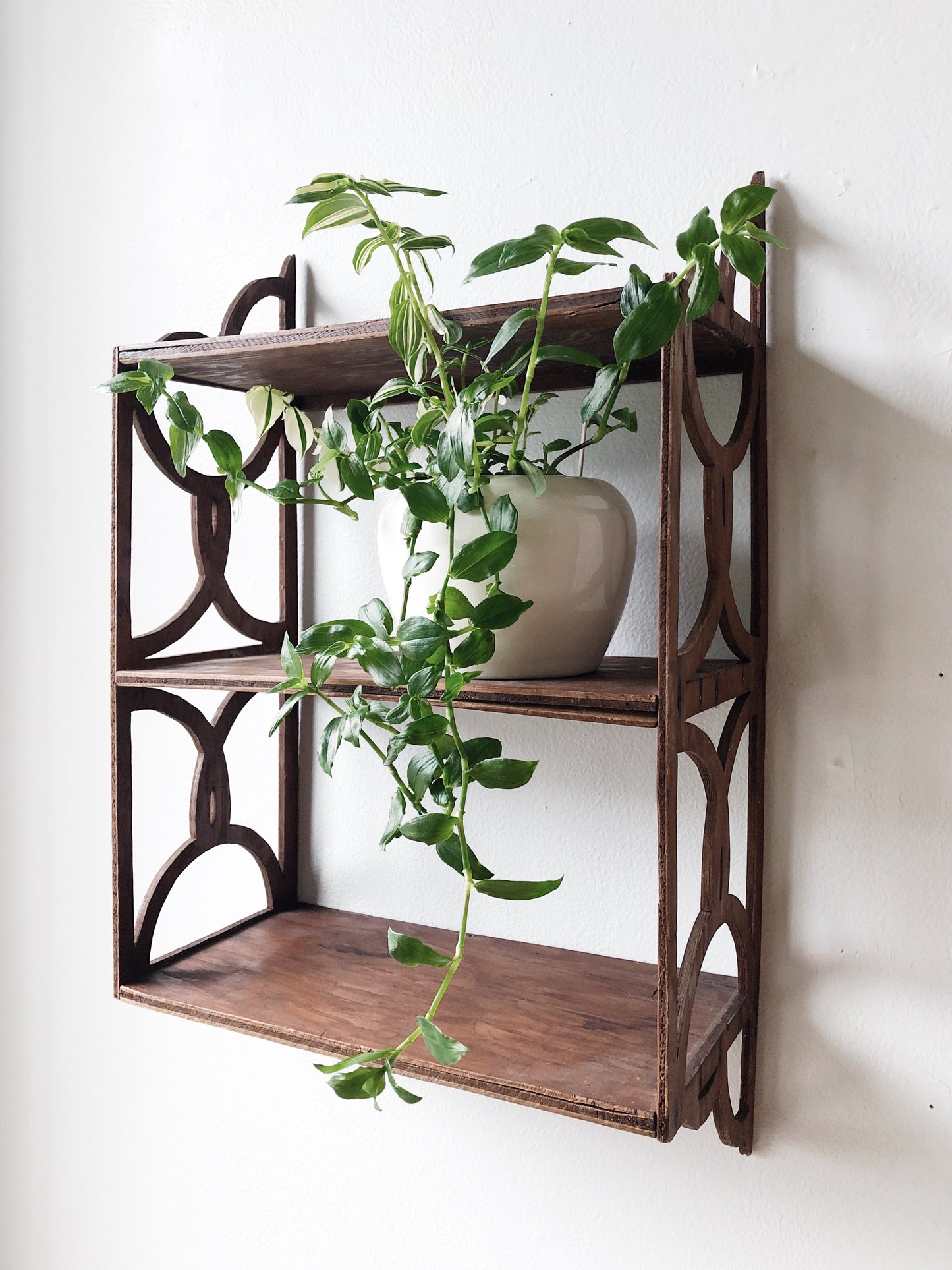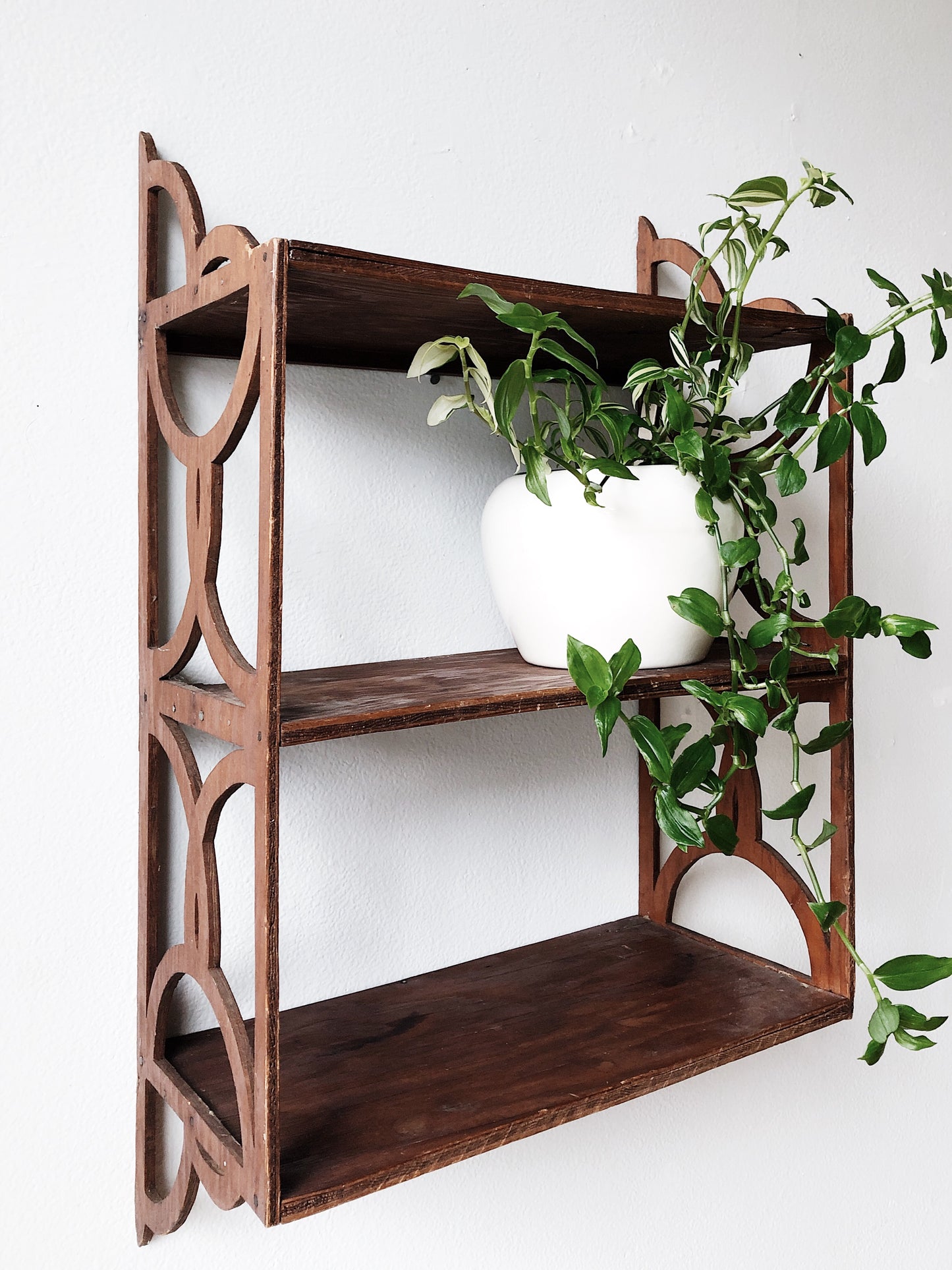 Really great open design work on this vintage shelf. It’s perfect for plants. Tiny aged brass hanging loops. A couple minor flaws do not detract.