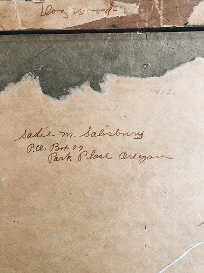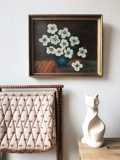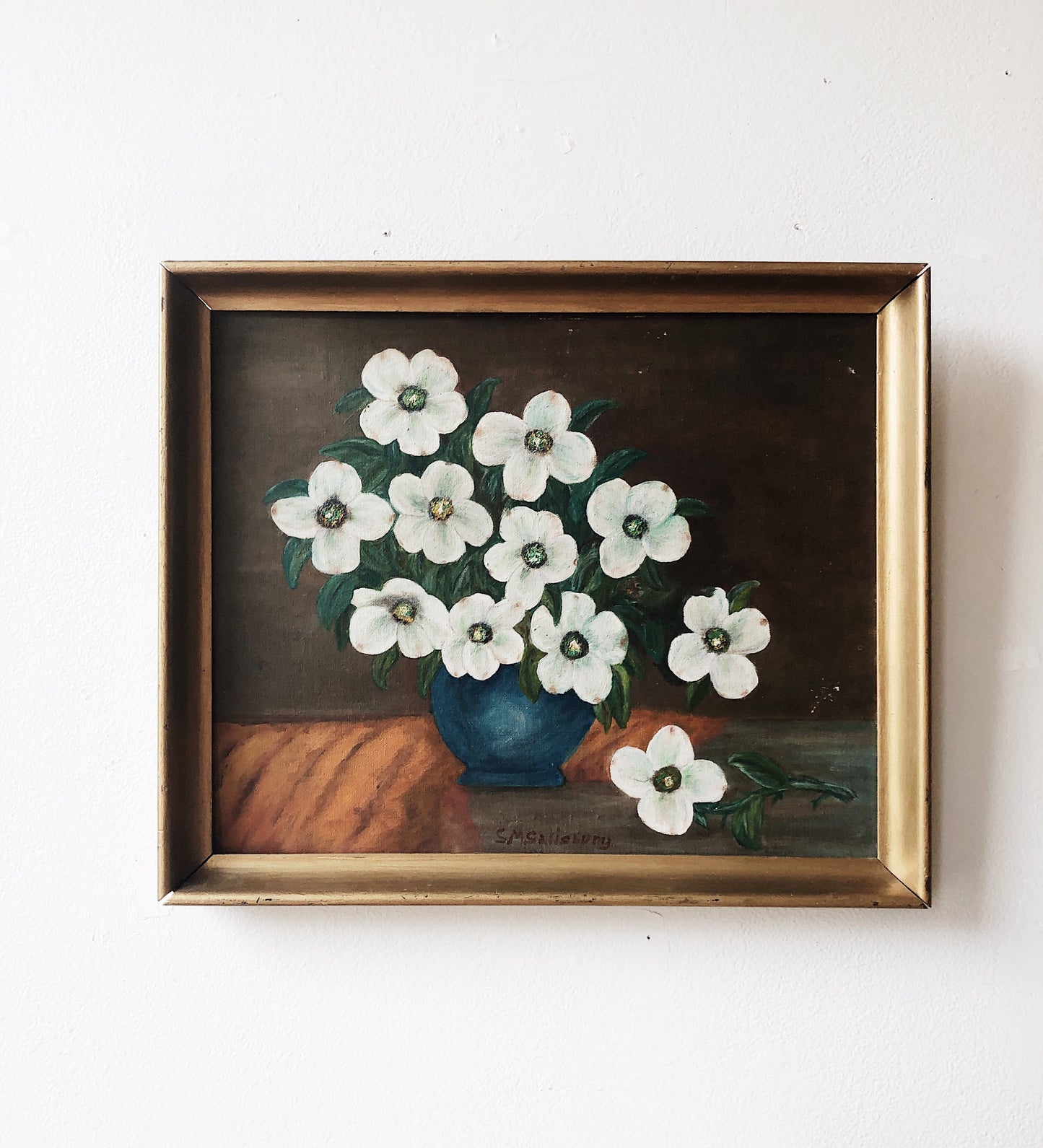 An old painting of dogwood branches, circa 1952 and painted by one Sadie M Salisbury. Loveliest colors in this beauty. Faded gold leafed wood frame