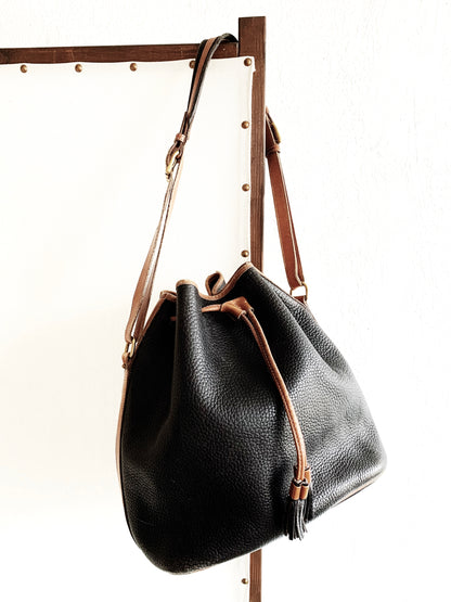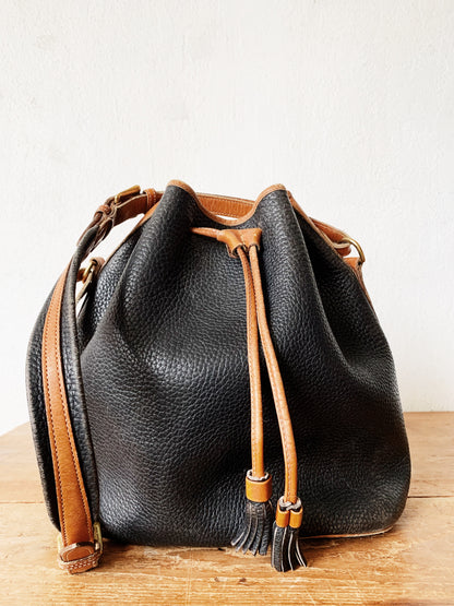 Large vintage Dooney drawstring bucket bag in really nice shape. Has some minor wear to the tan leather piping. Pebbled black leather in great shape with a sturdy adjustable strap with brass buckle and internal key ring.