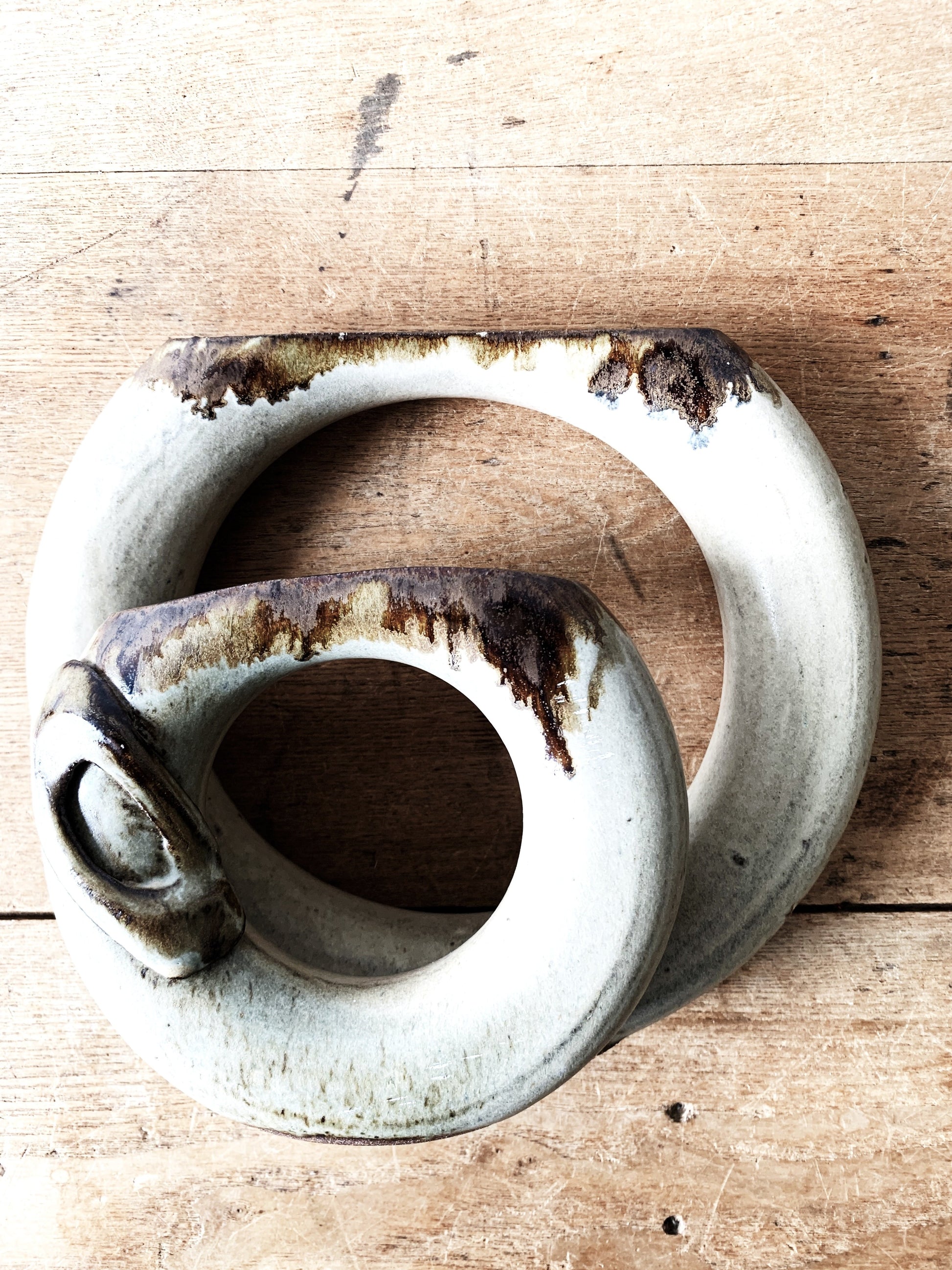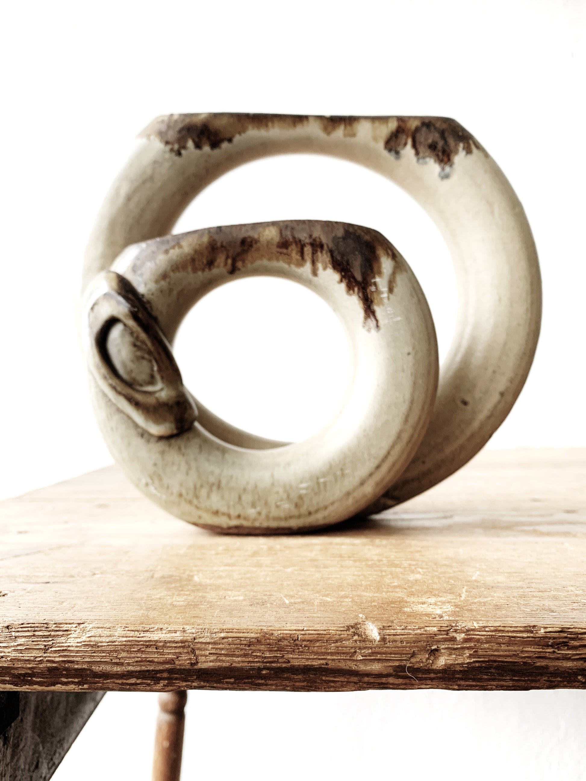 Earthy and beautiful art pottery piece. A fused together double half round circle vase with natural and brown drippy glaze.