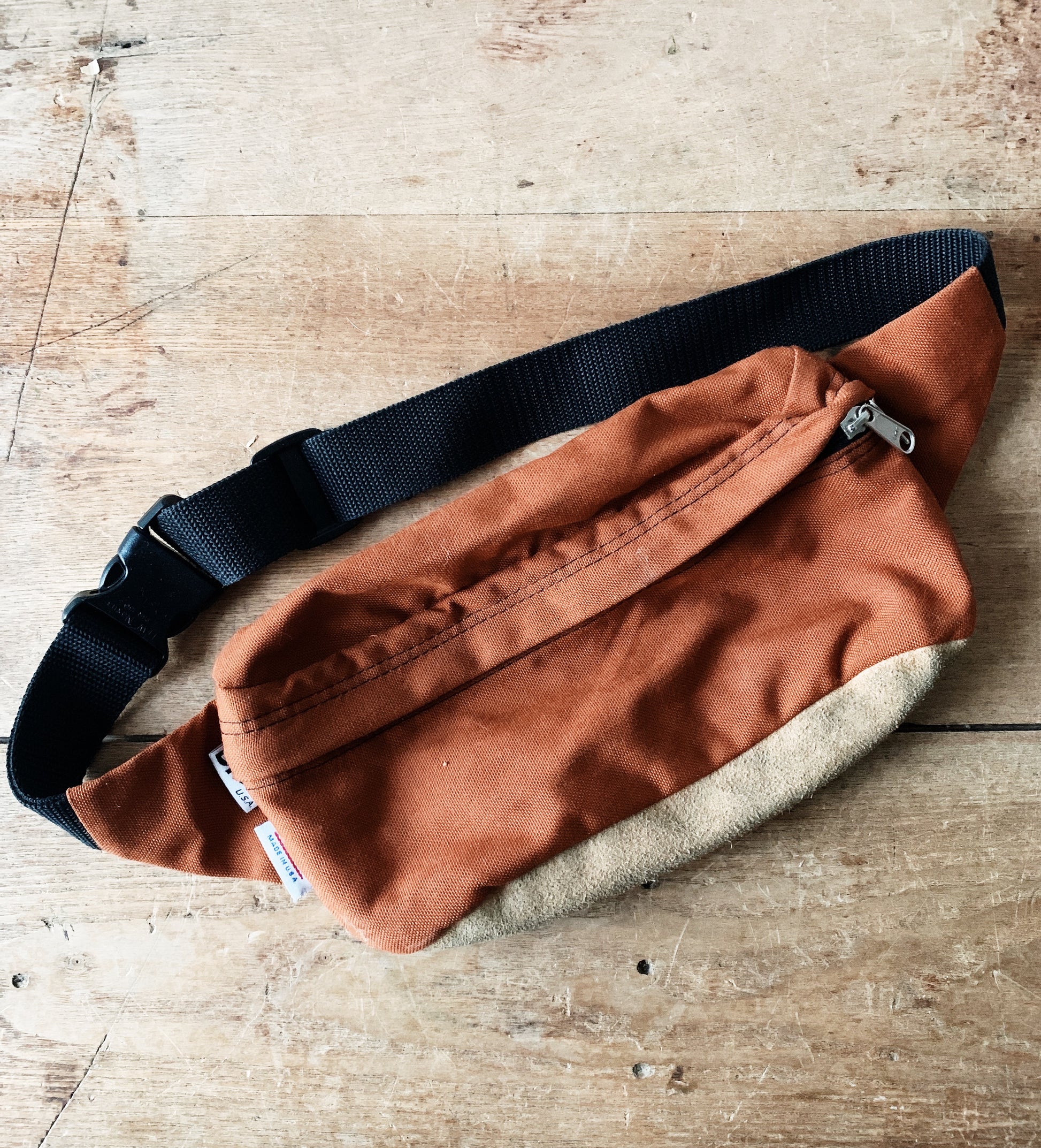 Awesome vintage dark terra canvas hip pack with suede bottom. In great shape, perfect size. Only selling because the strap is not long enough to sling cross body. Works great on the hip and/or over the shoulder though