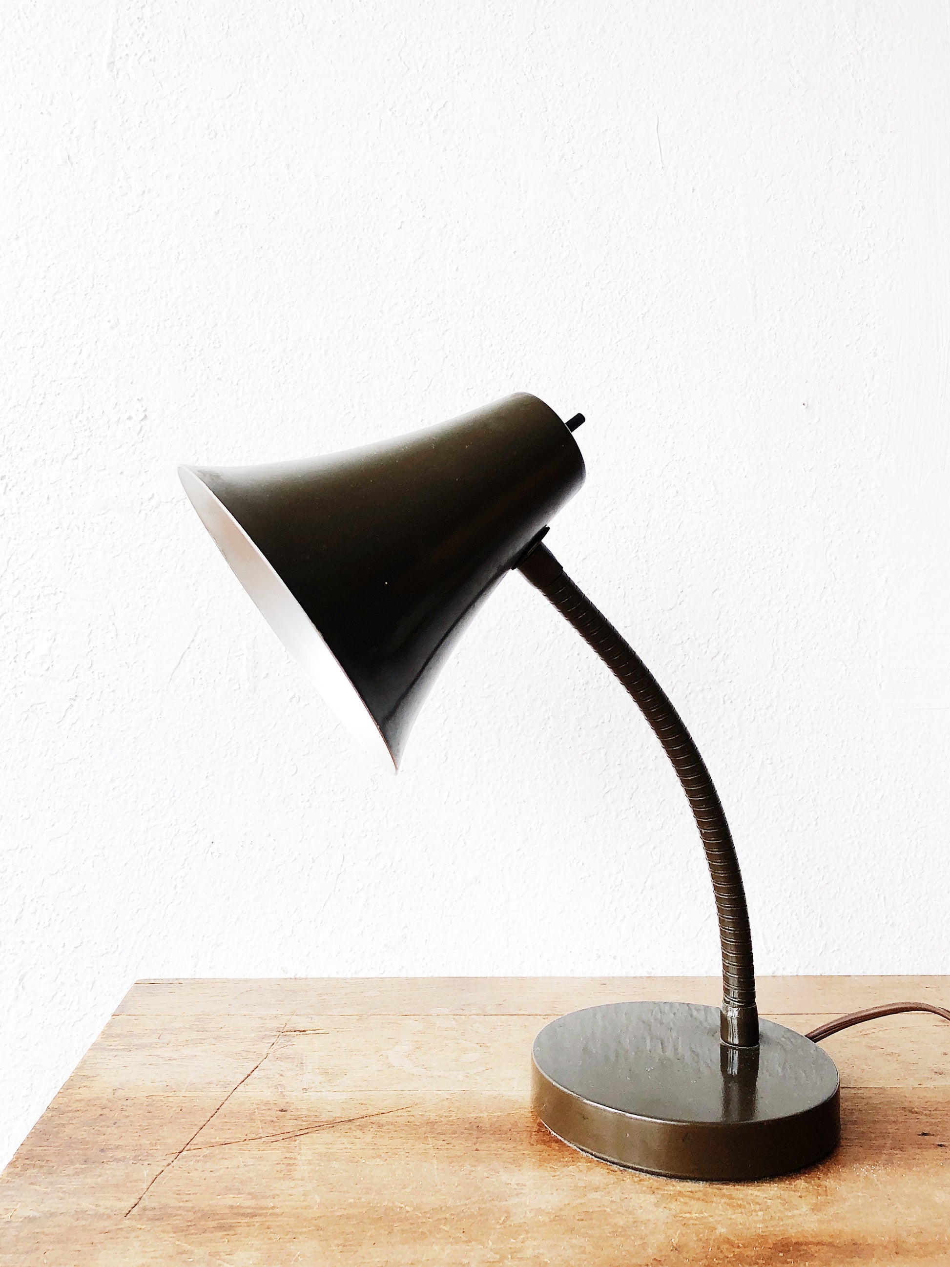 Vintage lamp from the 1930s. Most likely military. Industrial metal enamel in a great olive brown. Gooseneck flexes. Original label on reverse