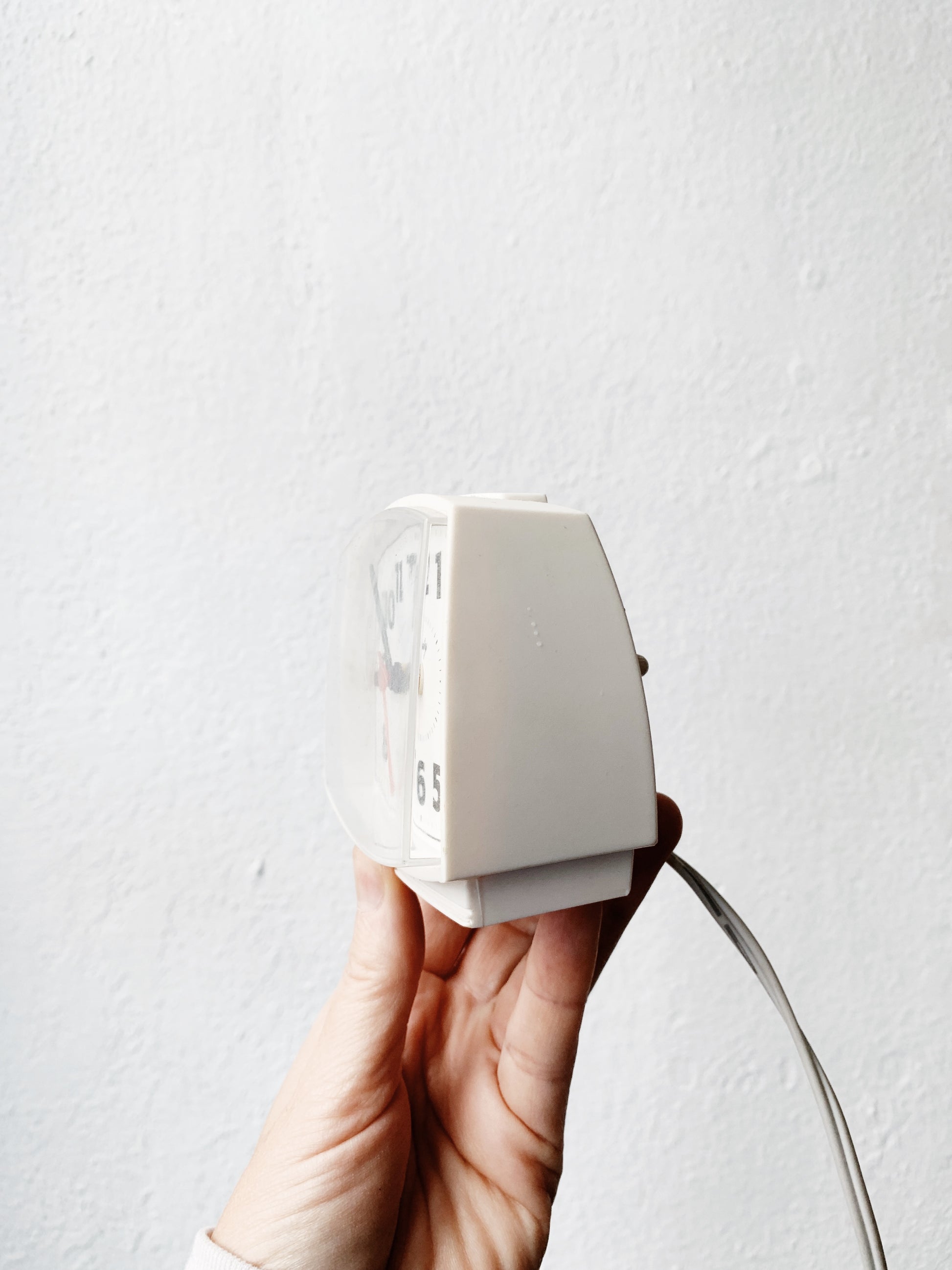 Simple vintage electric alarm clock that works great. A few minor scratches but overall in good shape. Features Nightlight and alarm snooze