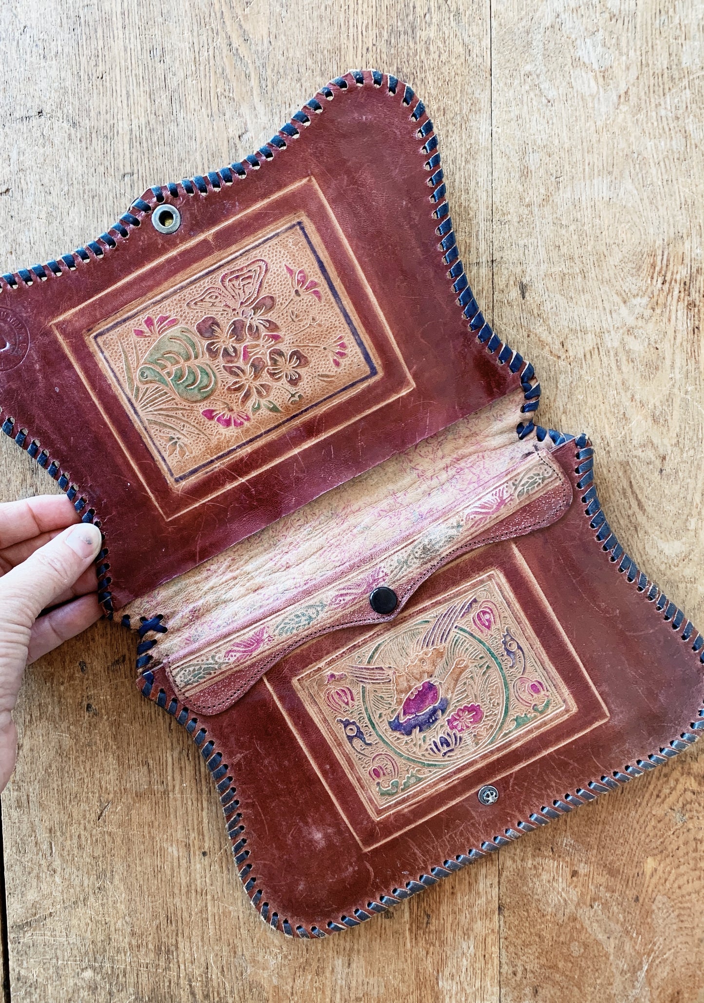 Wonderful vintage embossed leather purse/clutch. Snap closure, inner snap closure and pockets. Braided leather handle. Super sweet, in nice shape