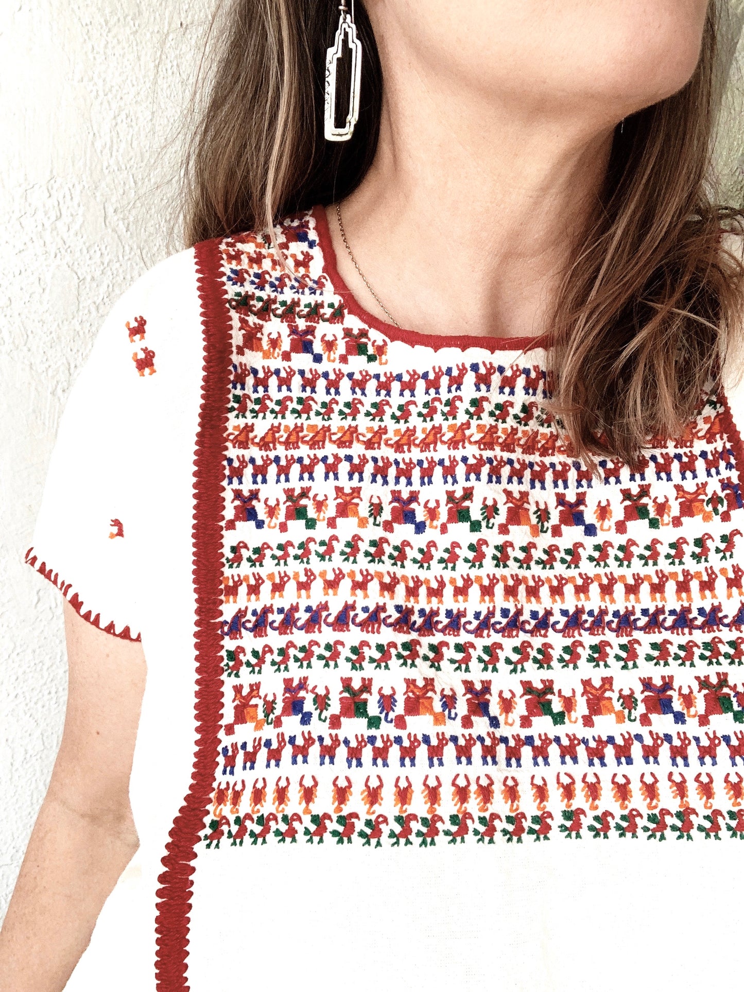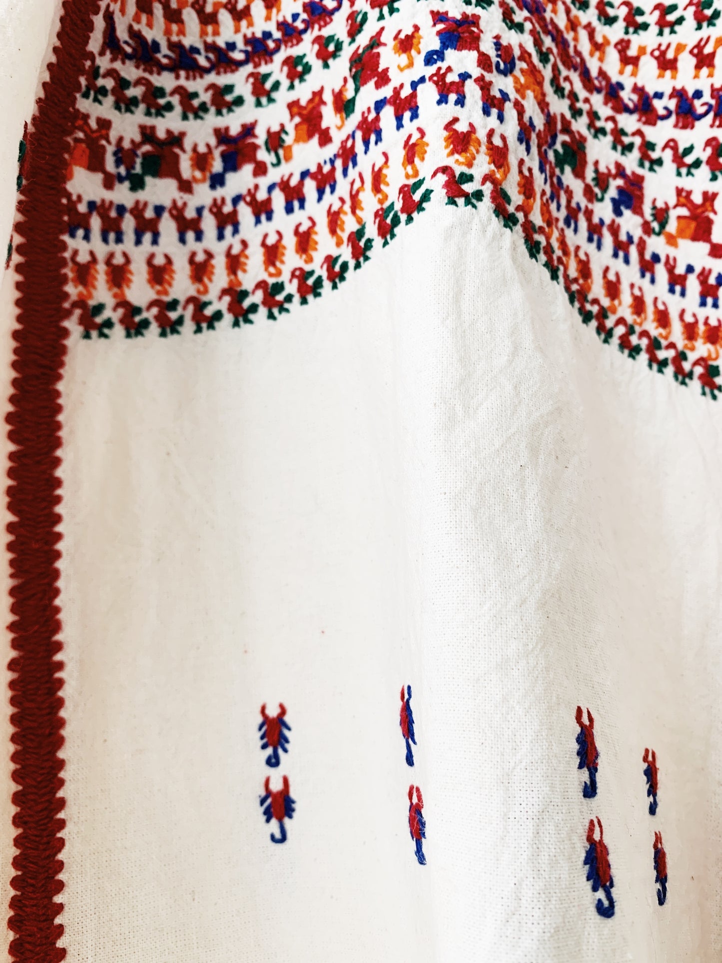 Beautifully embroidered vintage cotton muslin tunic. Boxy cut, love the little animals! Especially the scorpions.