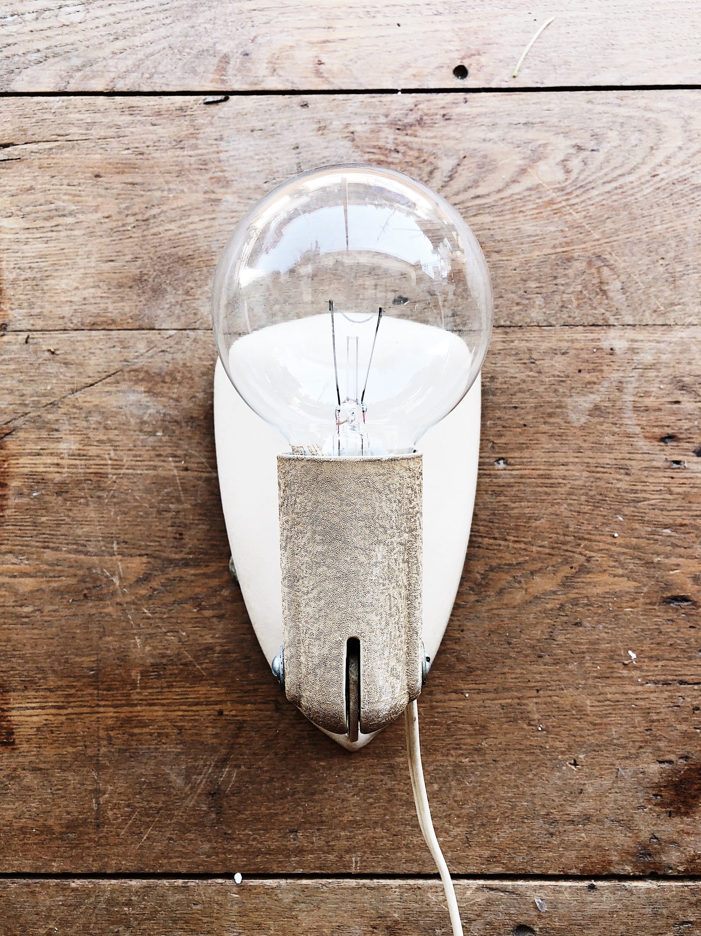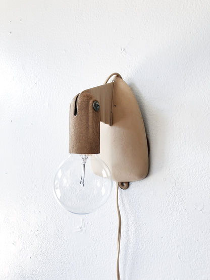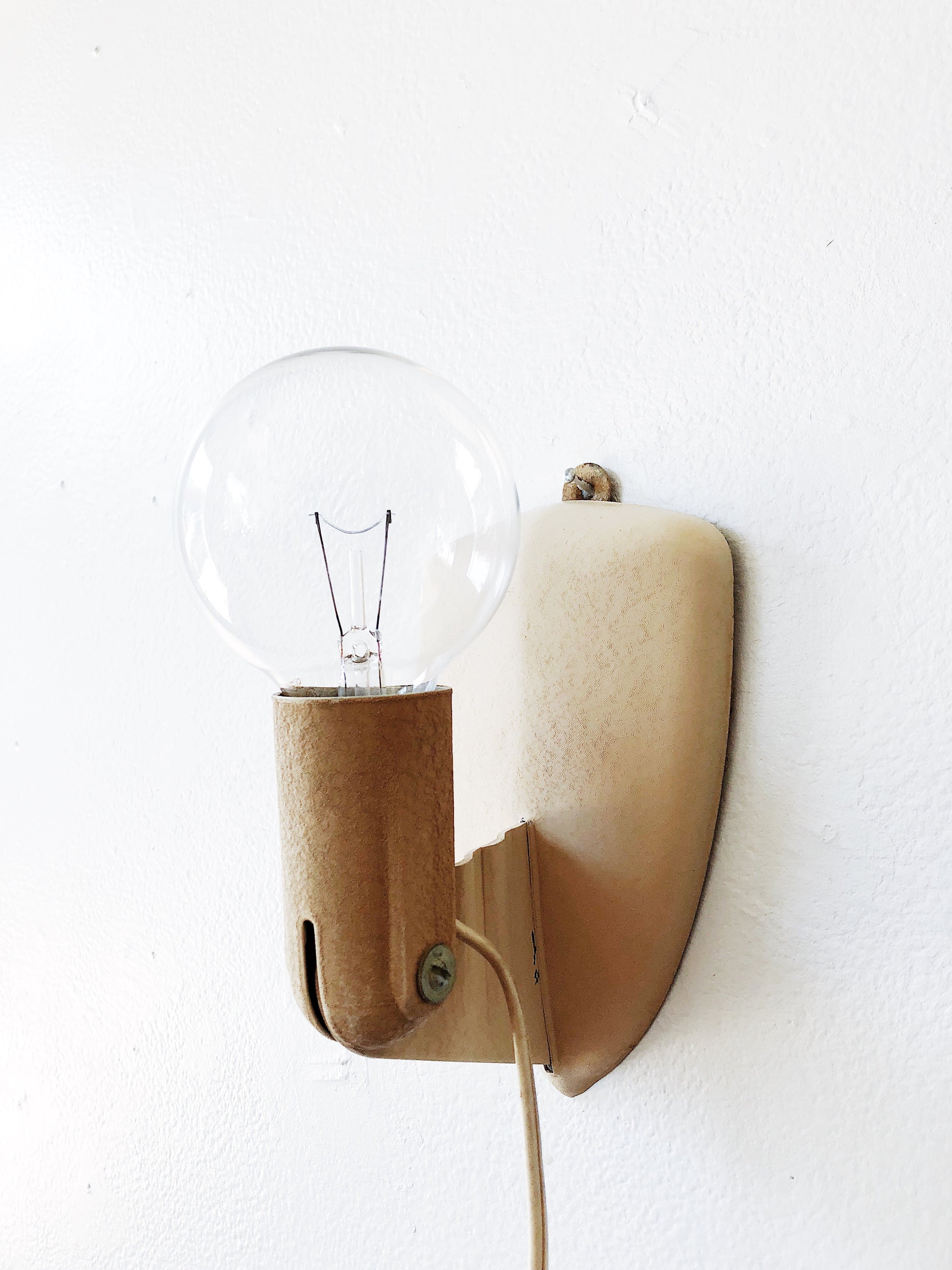 A mid century convertible sconce lamp in pale buff. Note the swivel and clamp back which allows you to clip to the headboard, or rotate it up or down. Plug end.