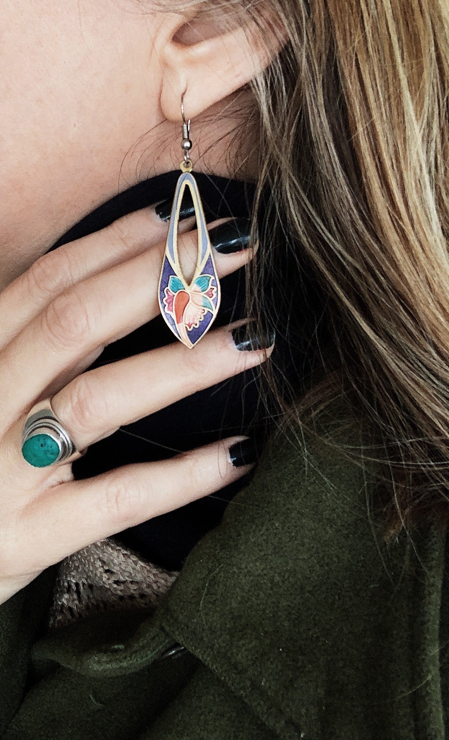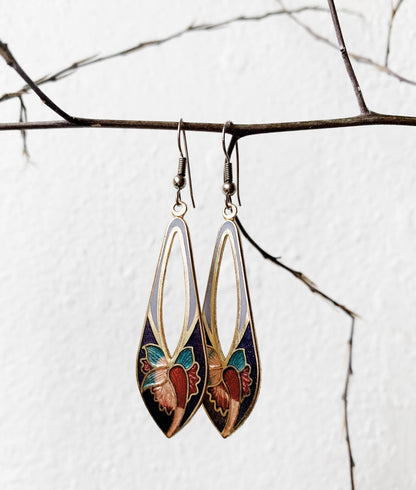 Pretty vintage enamel inlay earrings. Gold plated drop with stainless ear hoops. Very pretty! Lately Birch style, but unmarked. Well made.