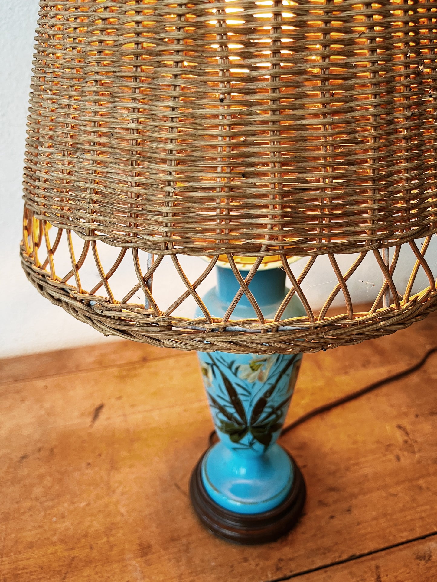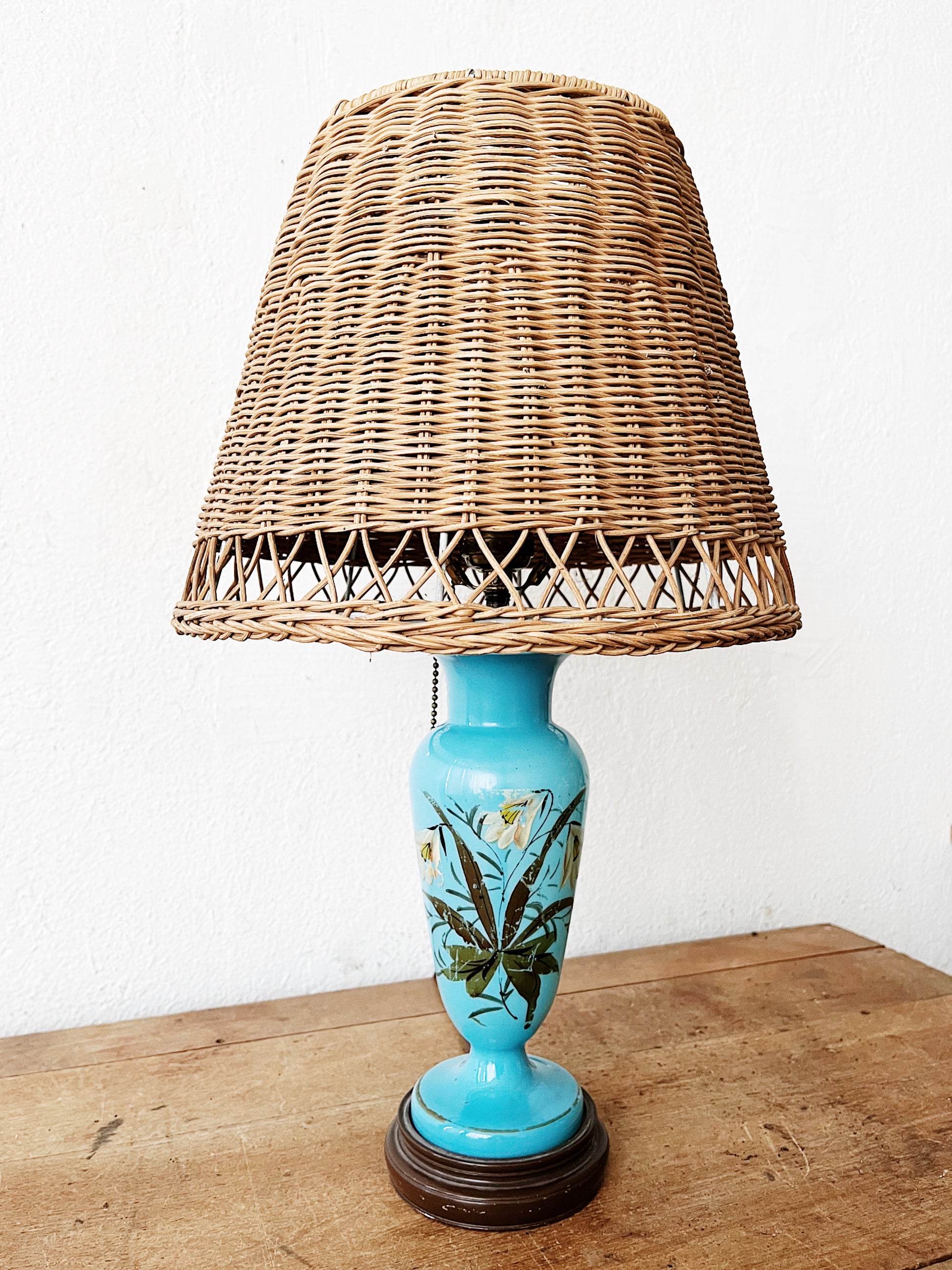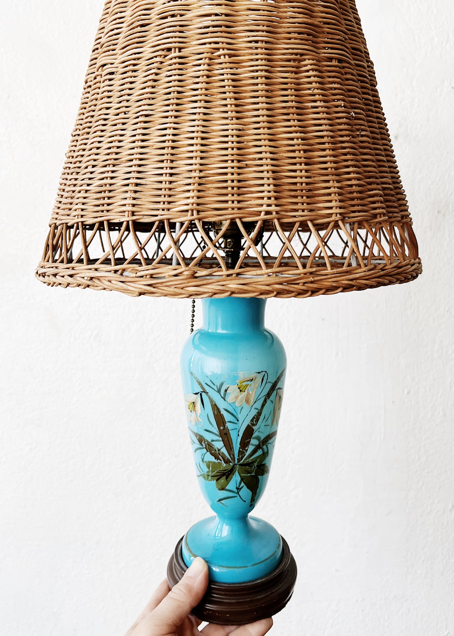 Hand painted enameled glass in the prettiest tifffany blue. Look at that little pull chain….So charming and romantic. Comes with a vintage woven shade. Age appropriate wear.