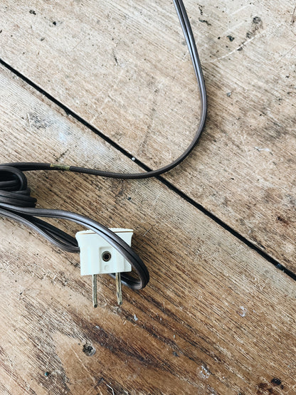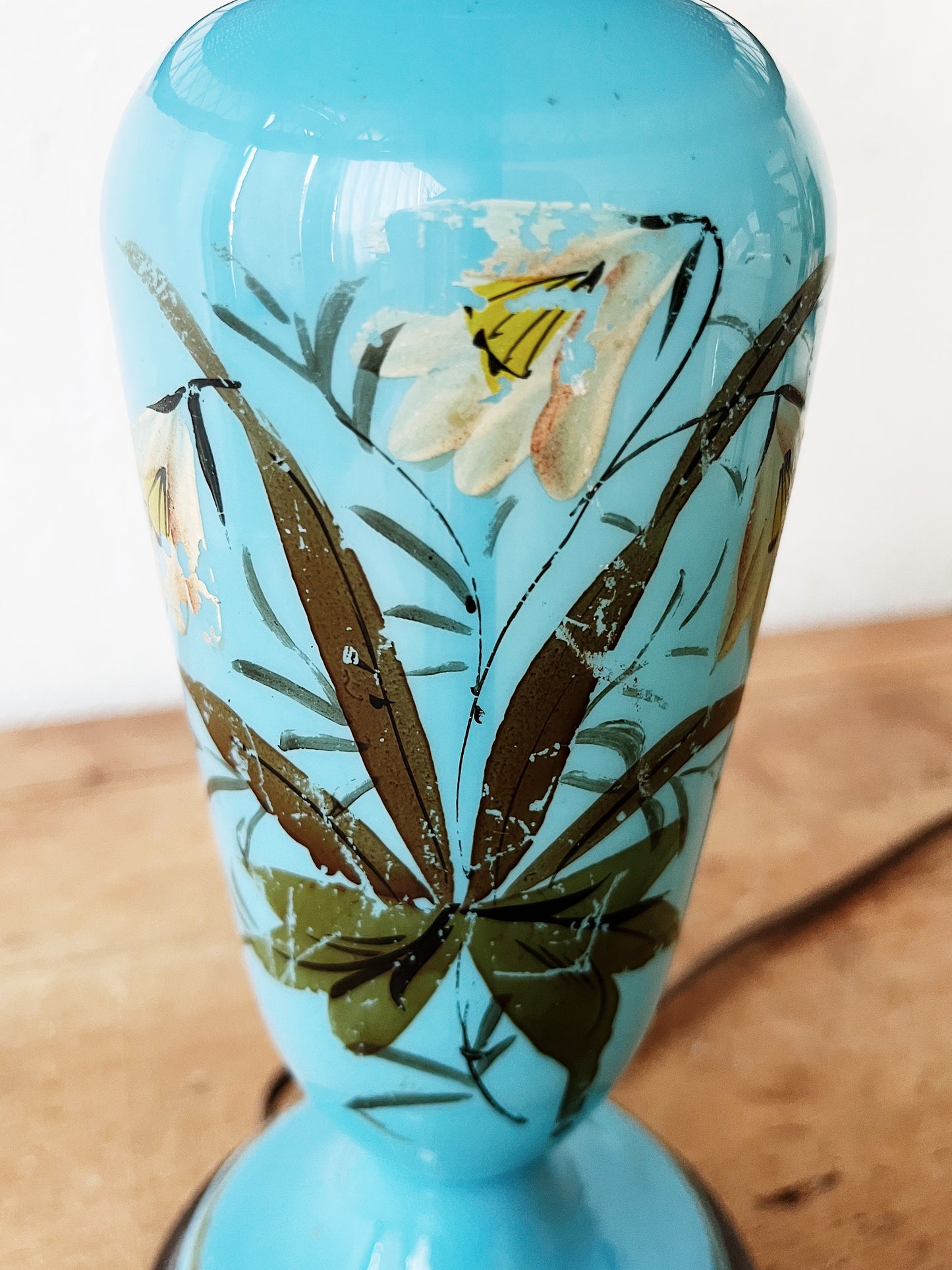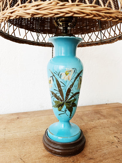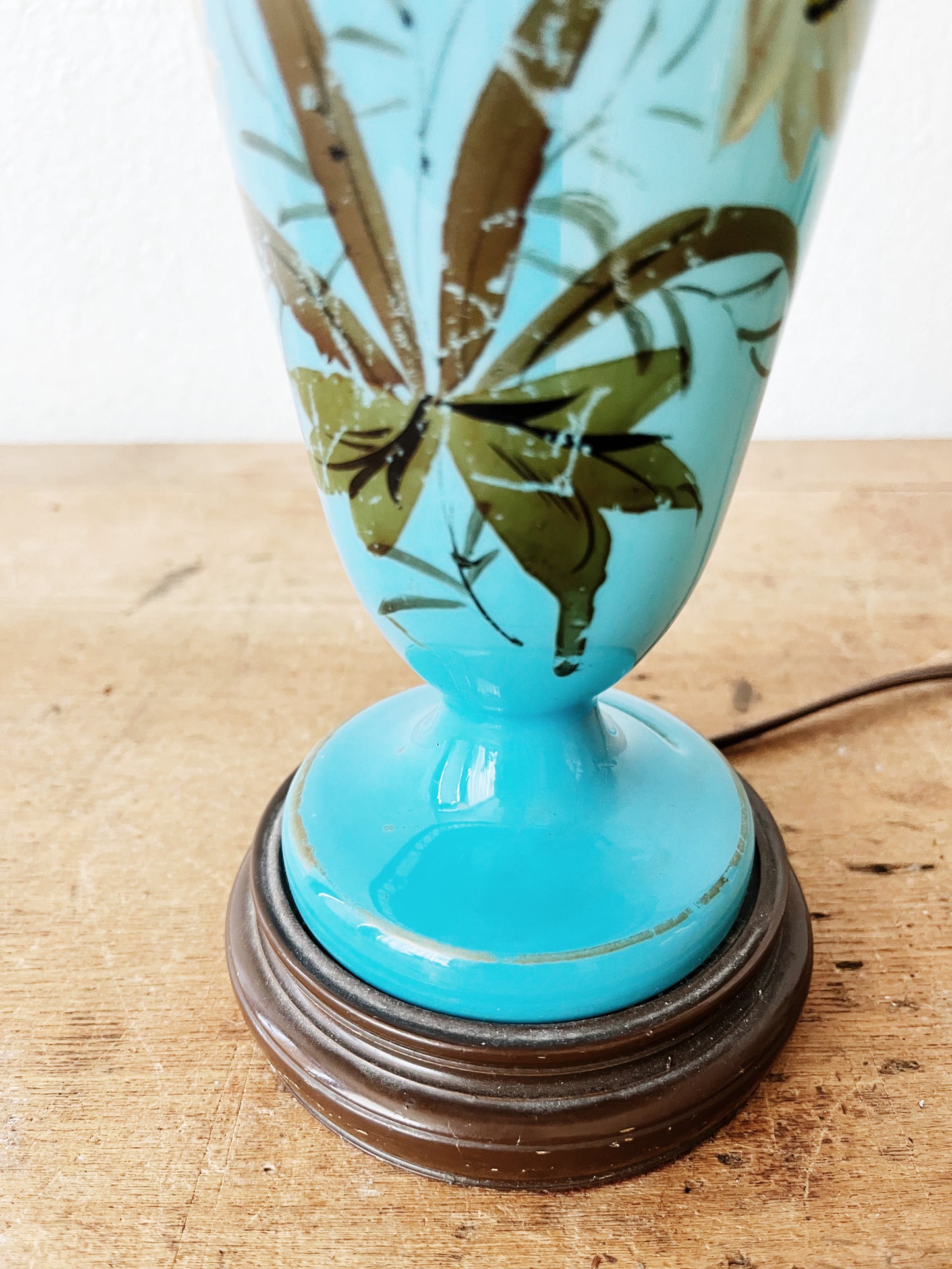 Hand painted enameled glass in the prettiest tifffany blue. Look at that little pull chain….So charming and romantic. Comes with a vintage woven shade. Age appropriate wear.