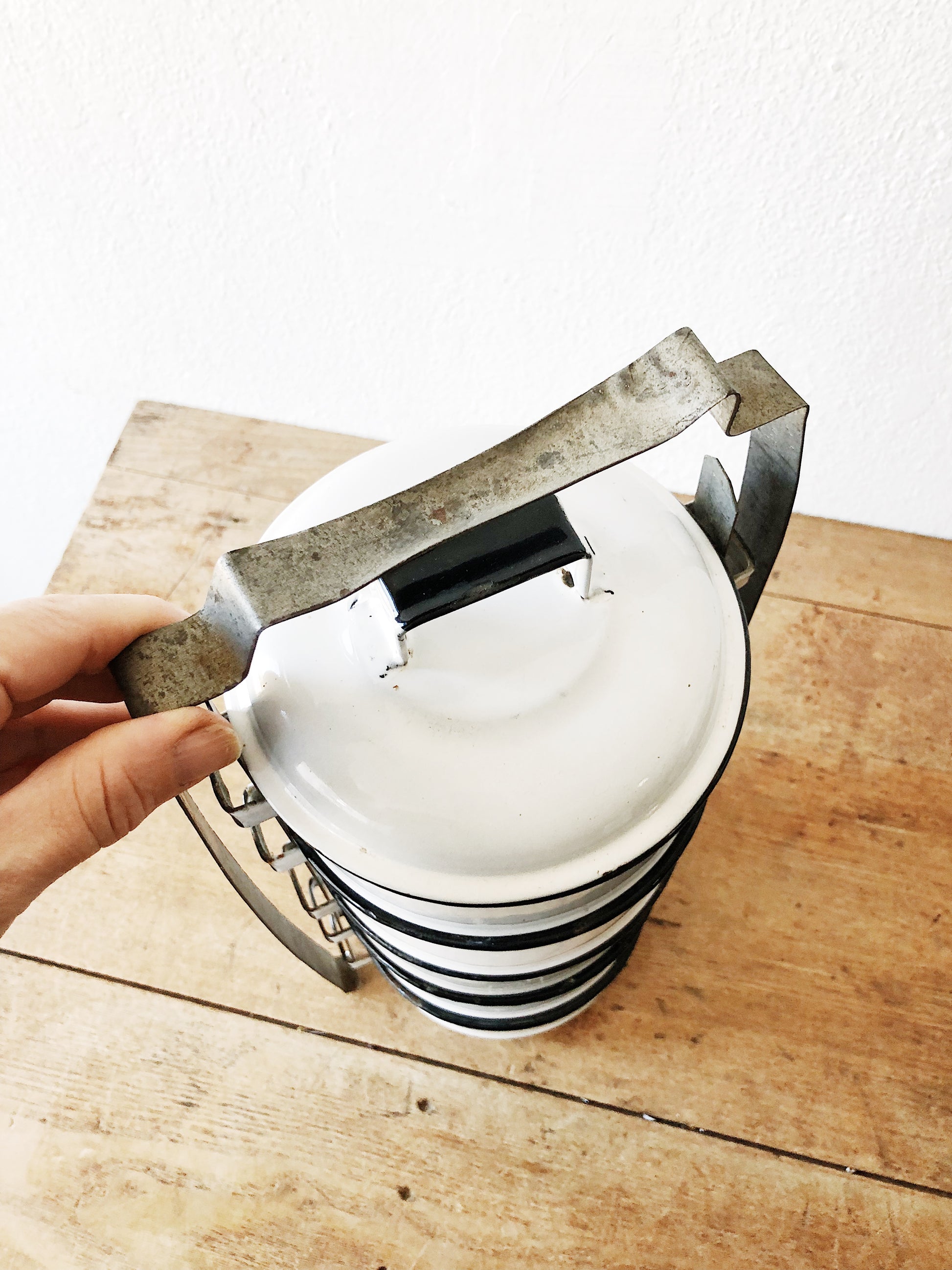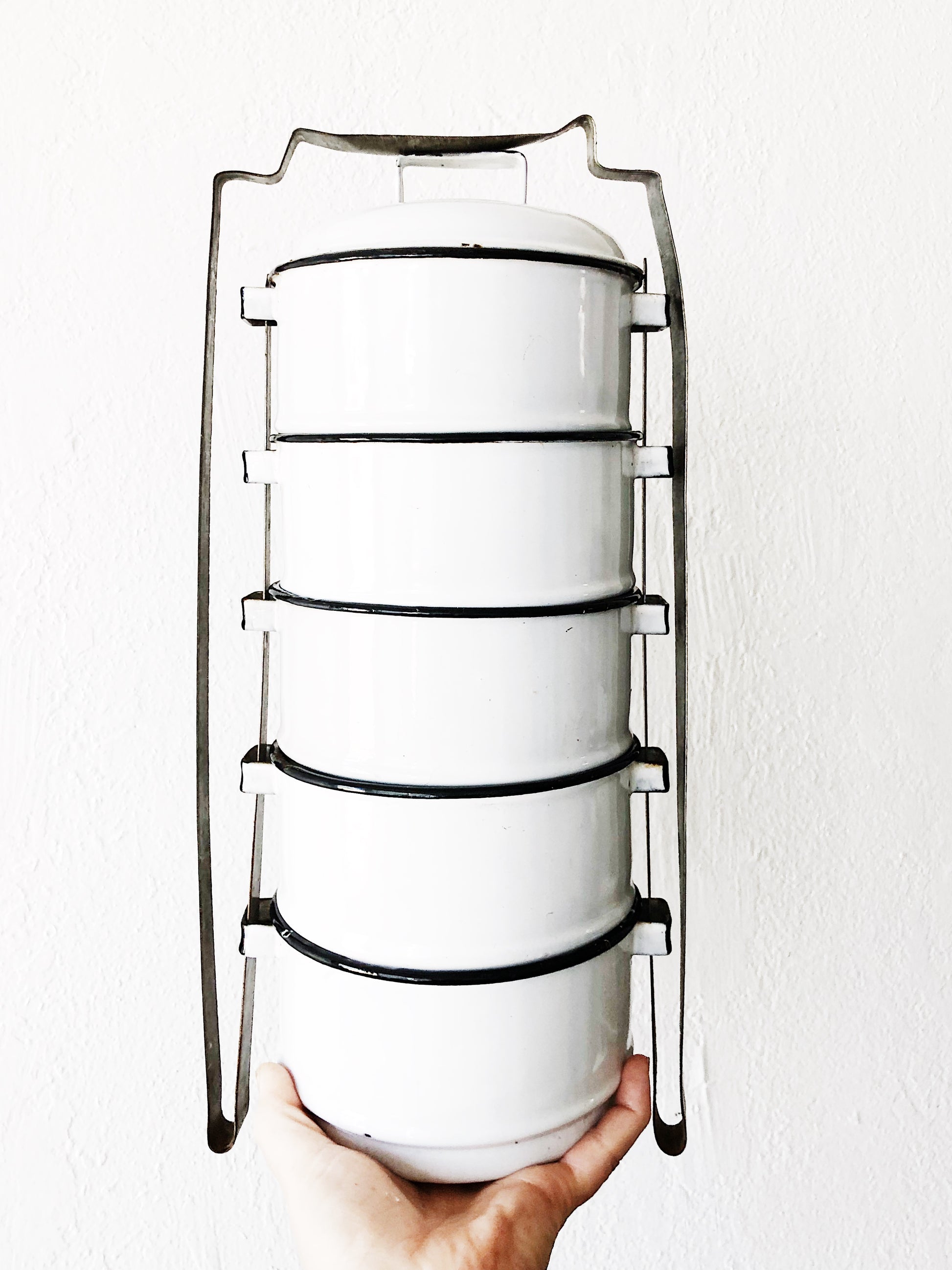 The best way to tote small meals, snacks, side dishes to the campsite or picnic area. Bowls remove all the way but meant to access while still stacked within the carrier. Great vintage condition