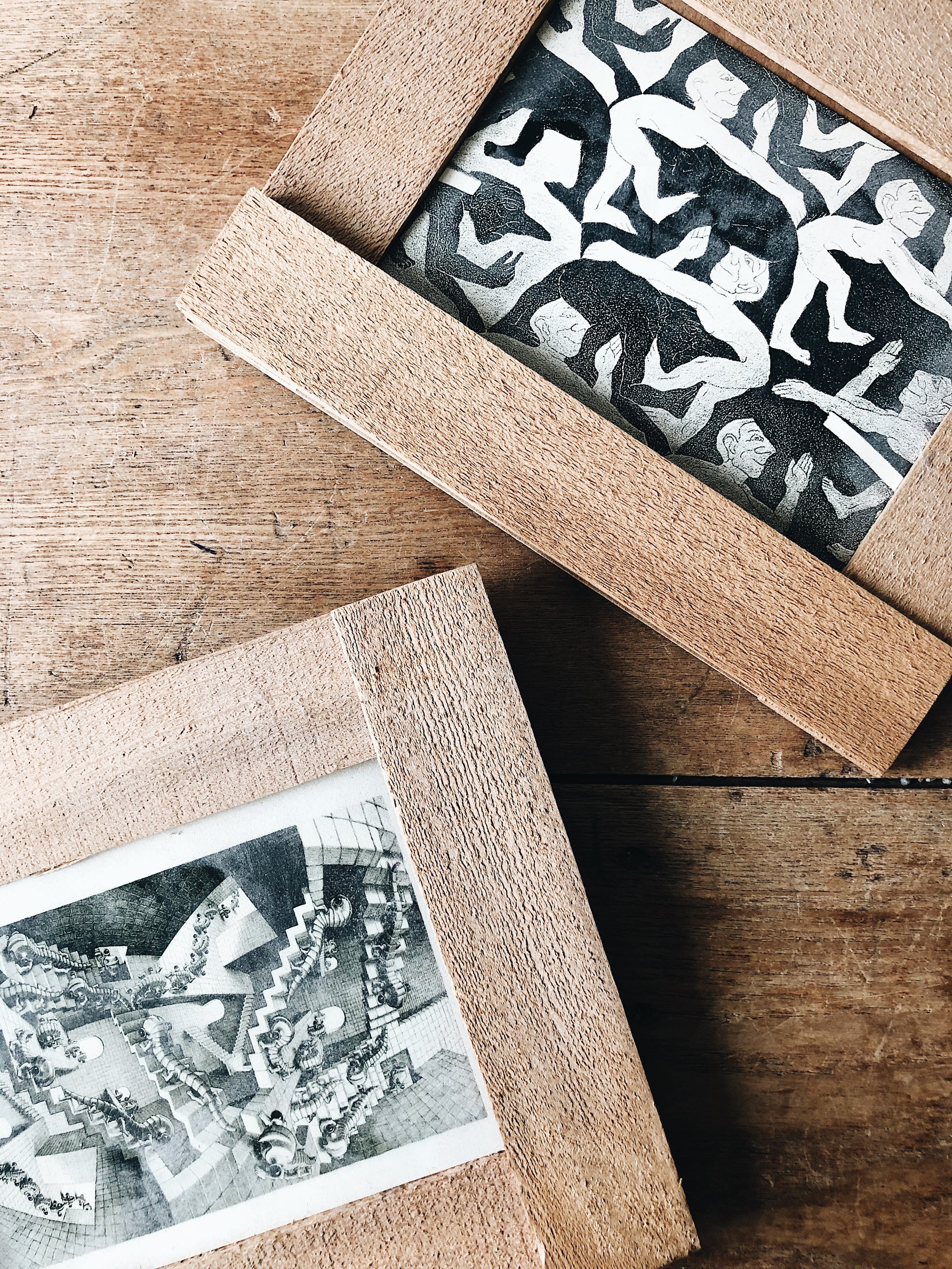 Nice Escher print in a simple wood frame. Very much love the craft feel to these. Hanger on reverse