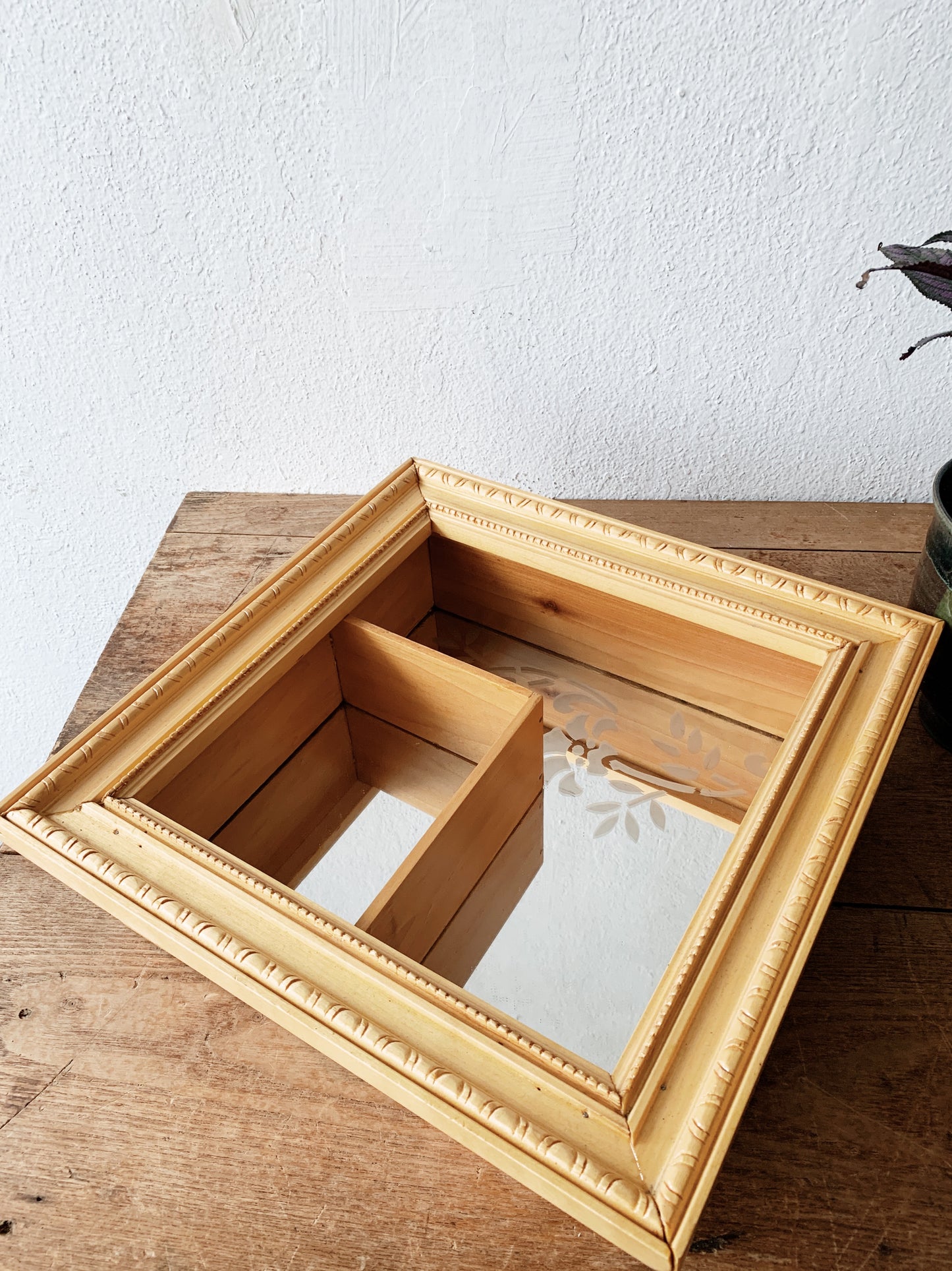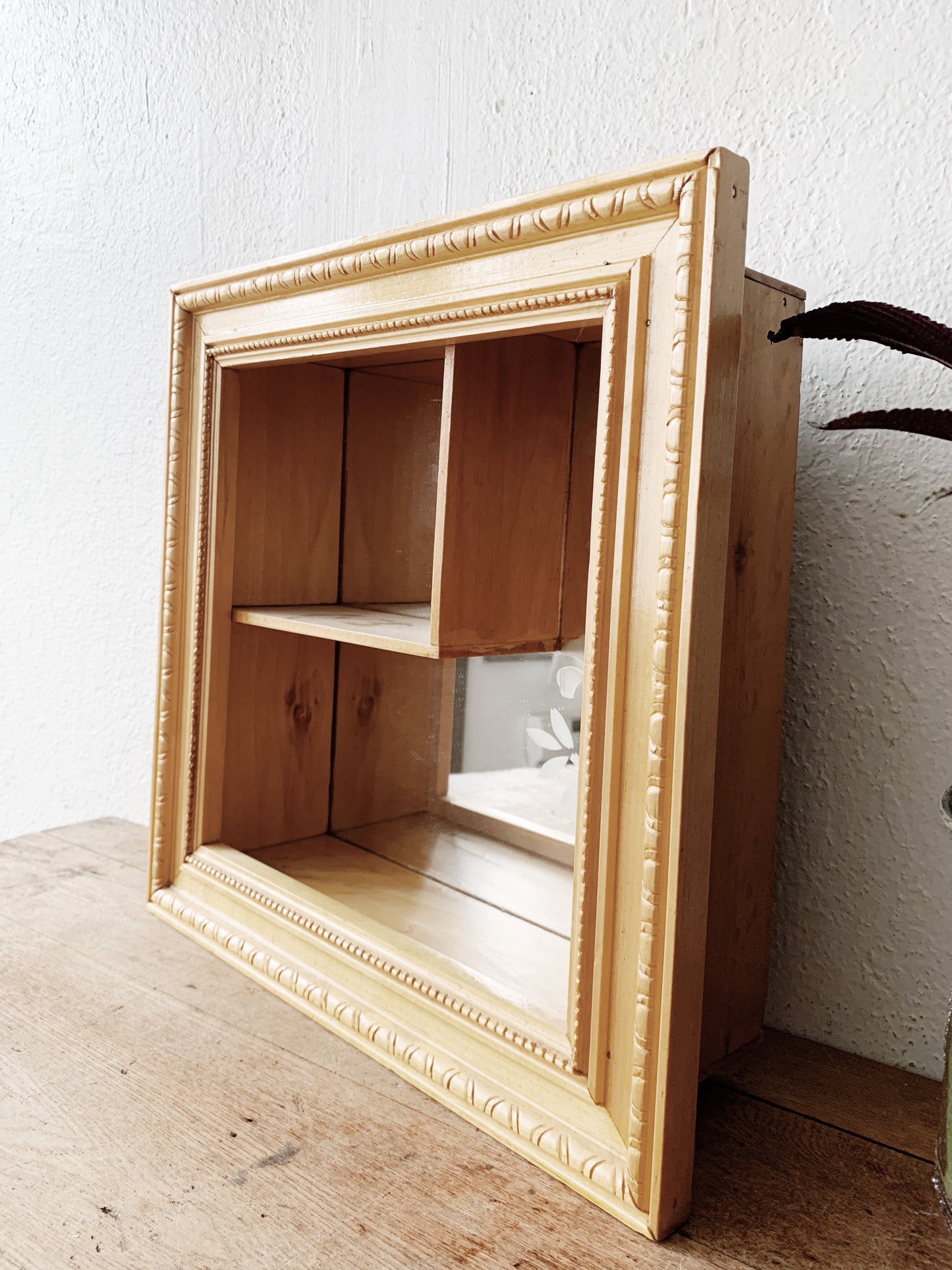 Lovely decorative wood shadow box shelf with etched mirror and two hangers on back. Super sweet!