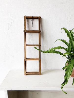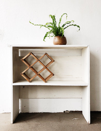 Vintage from Hong Kong. Natural wood and brass details. Delicate chain support. Makes a nice rack for liquor or wine bottles