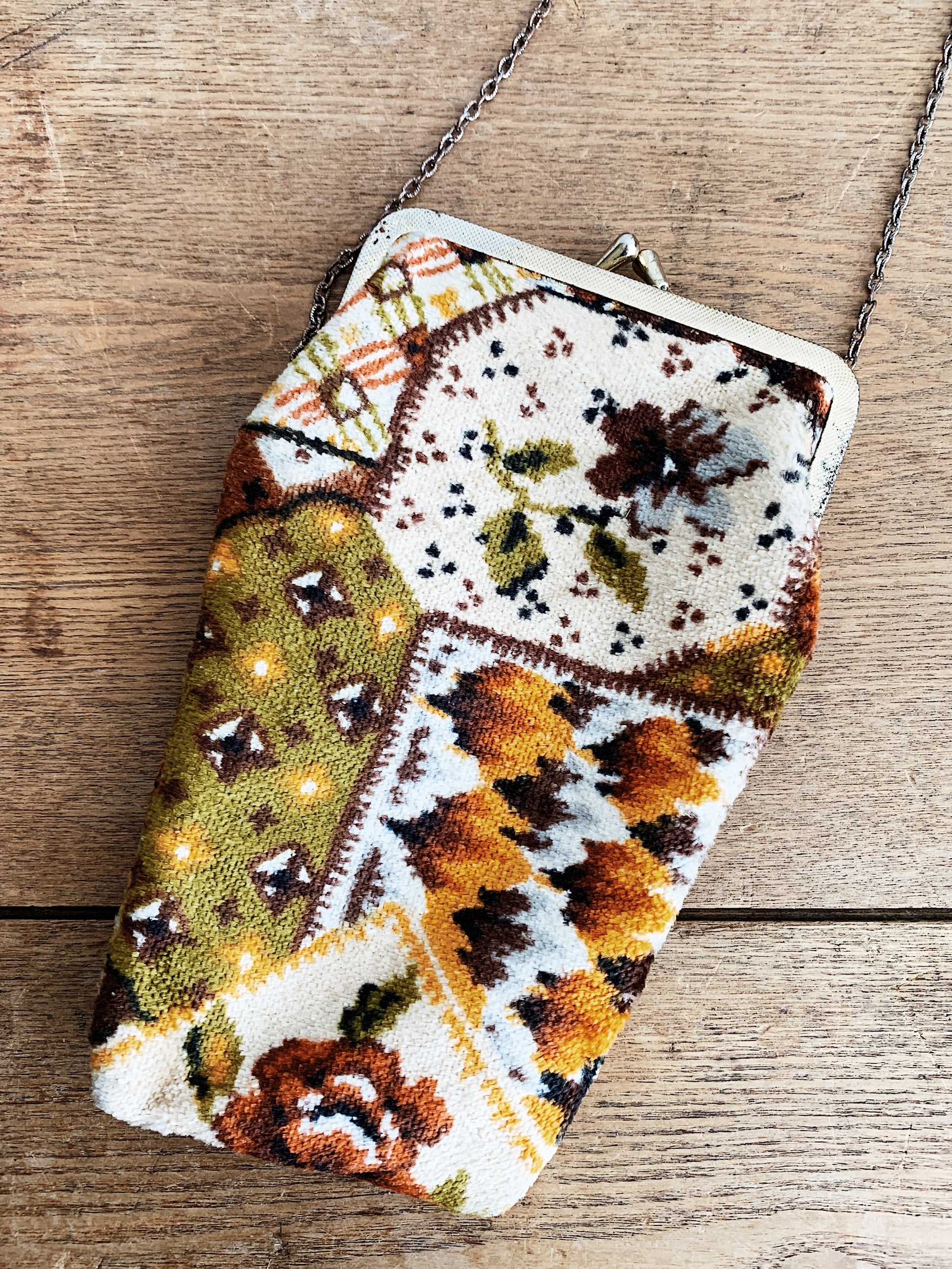 Vintage eyeglass case on chain. Love this! It’s actually big enough to fit your glasses, debit card and tube of lip gloss.