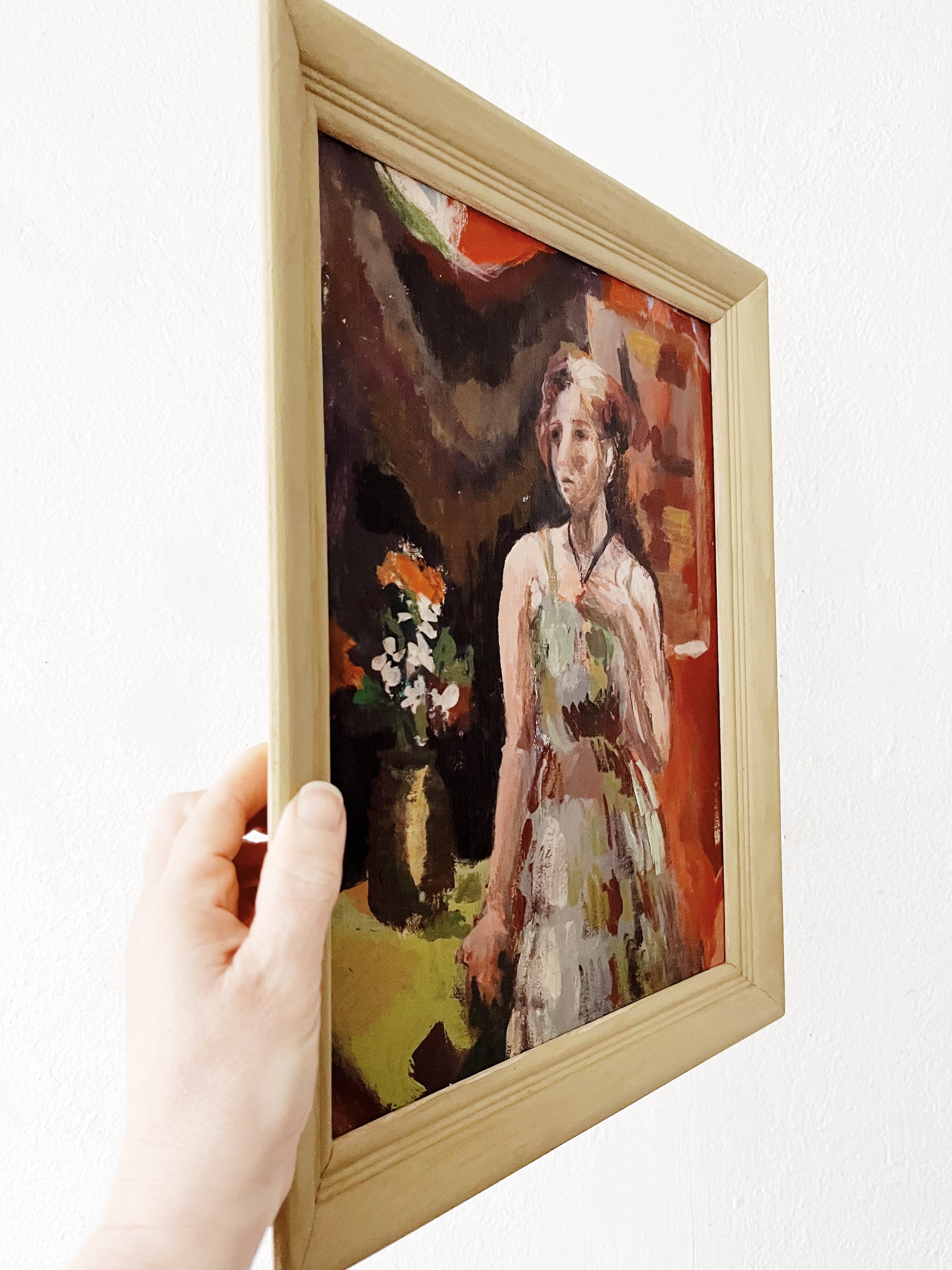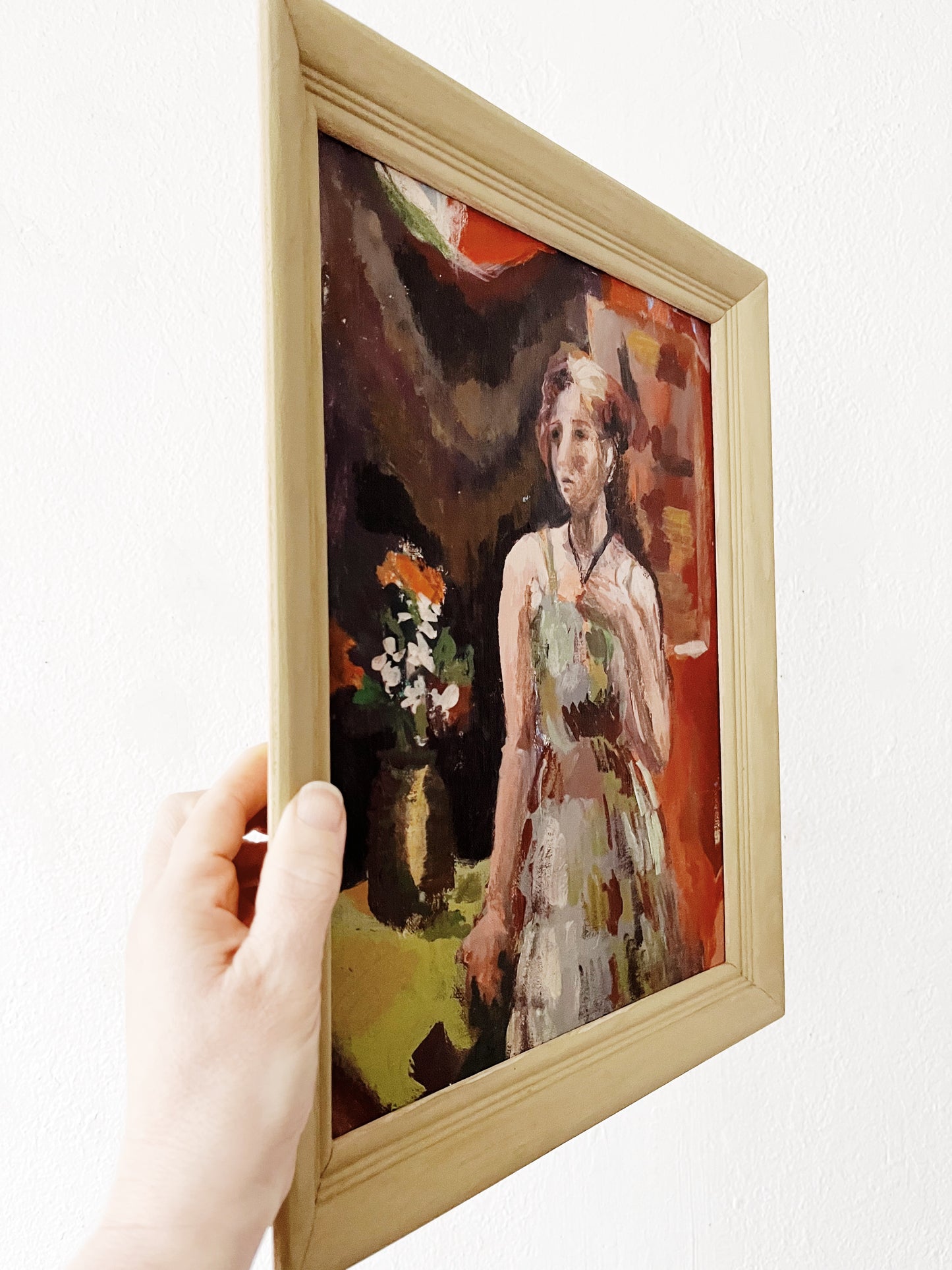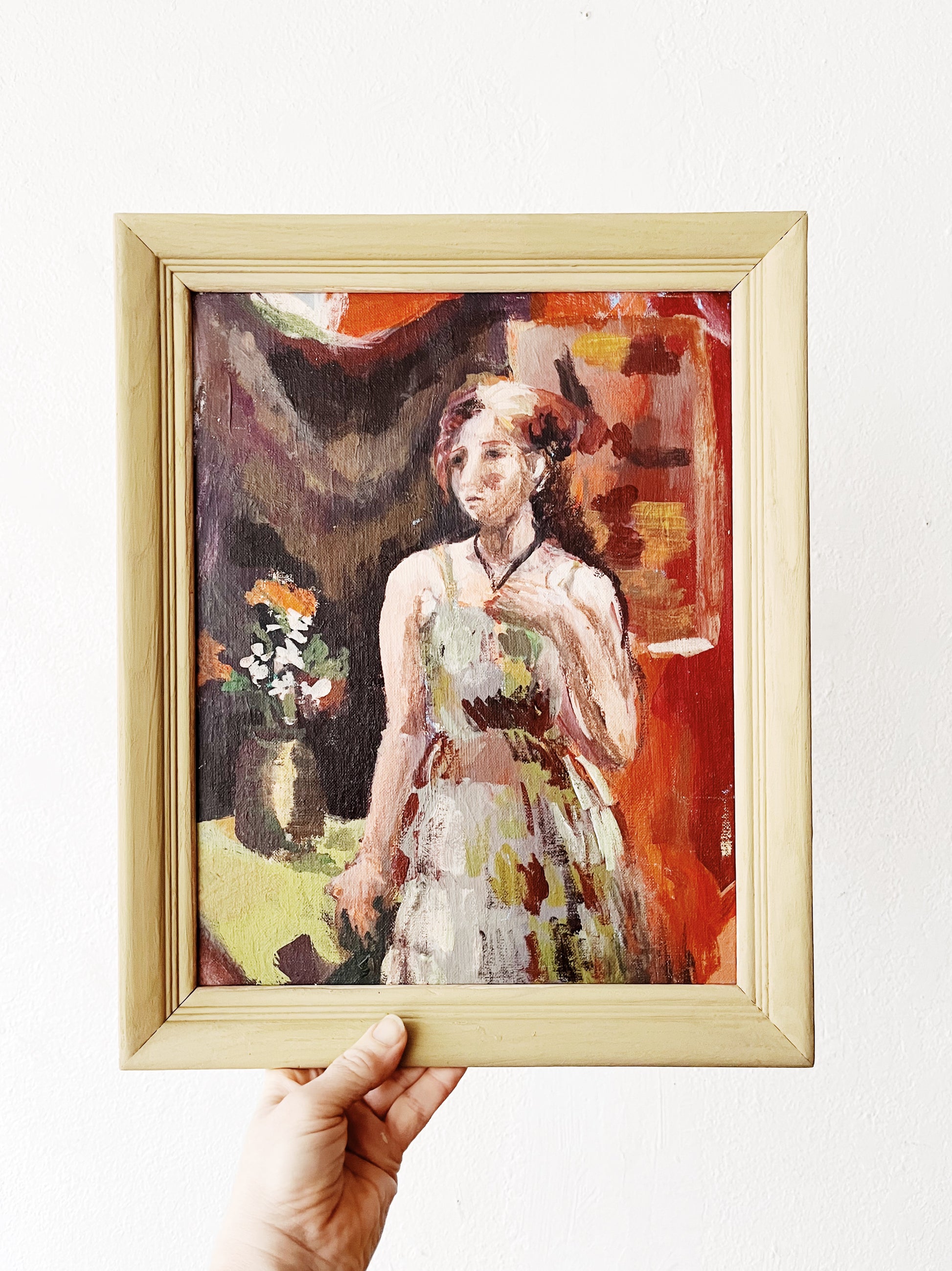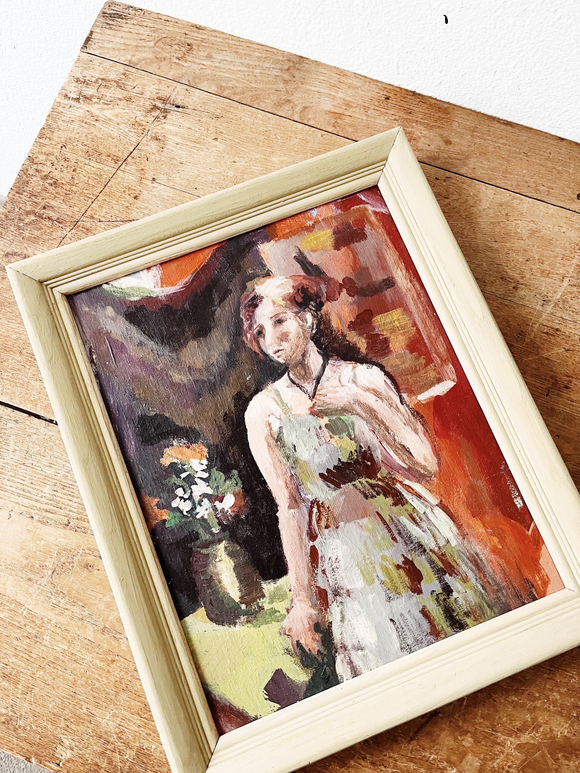 Beautifully painted oil on canvas board. The colors on this one are just spot on. Saturated yet earthy and grounded. The expressionism is palpable. Framed in ochre painted wood.