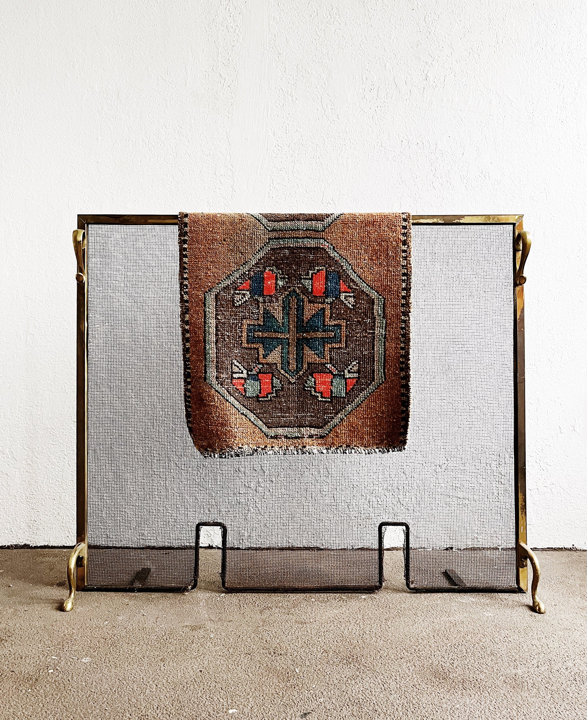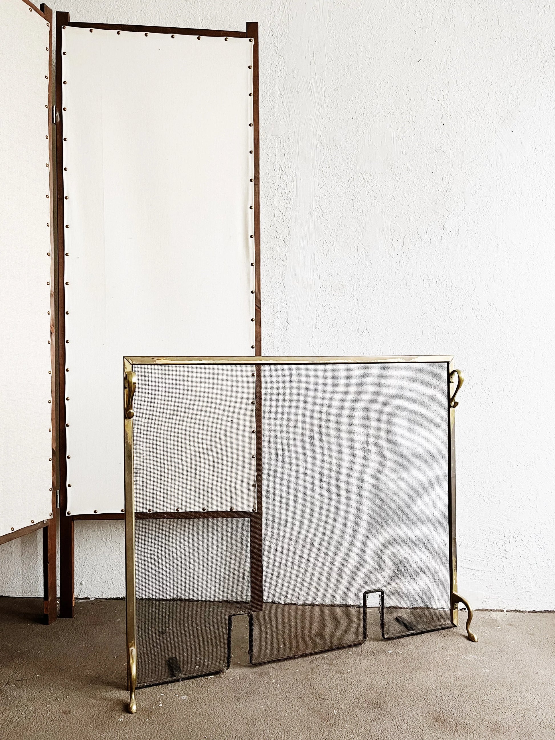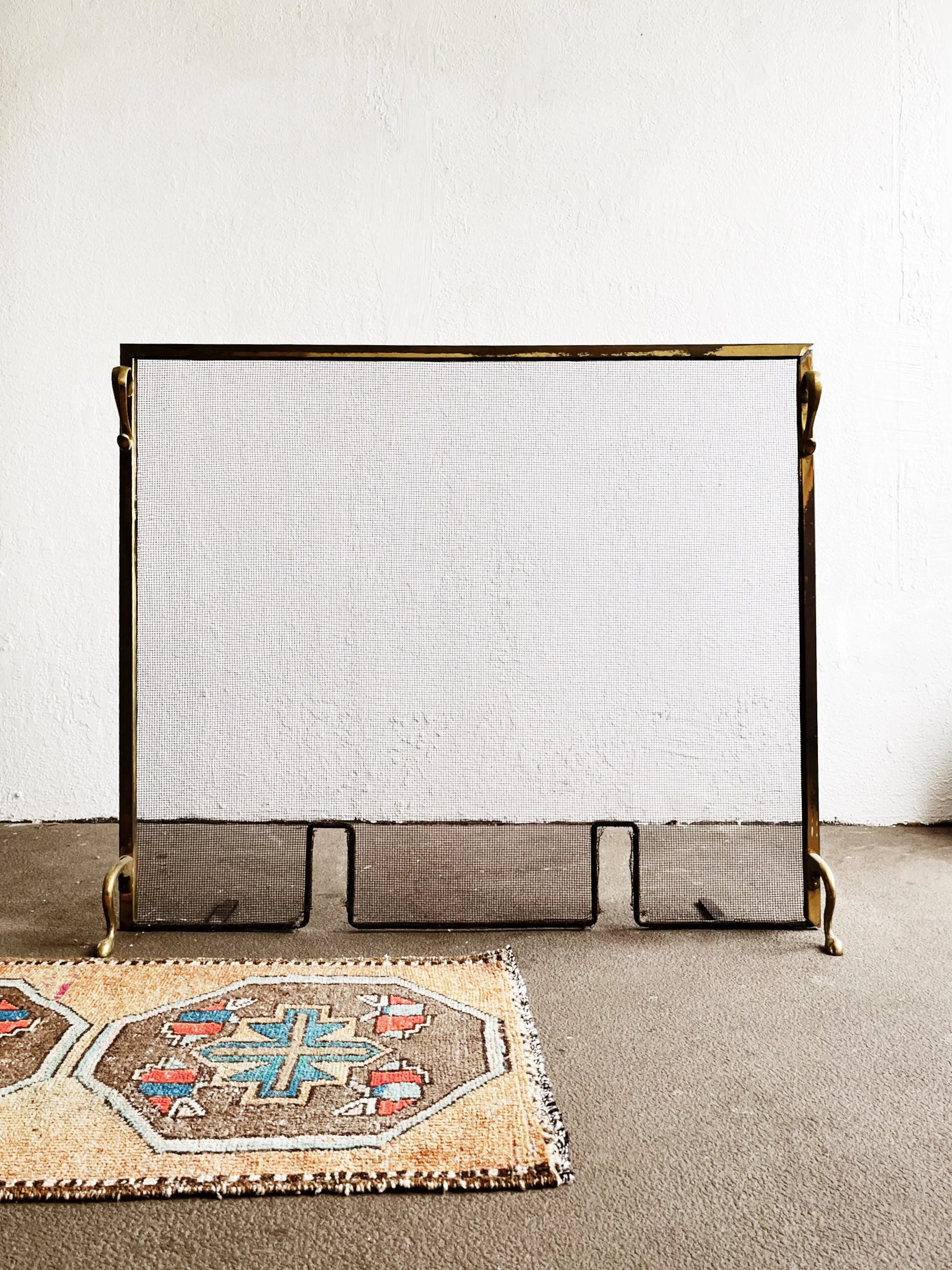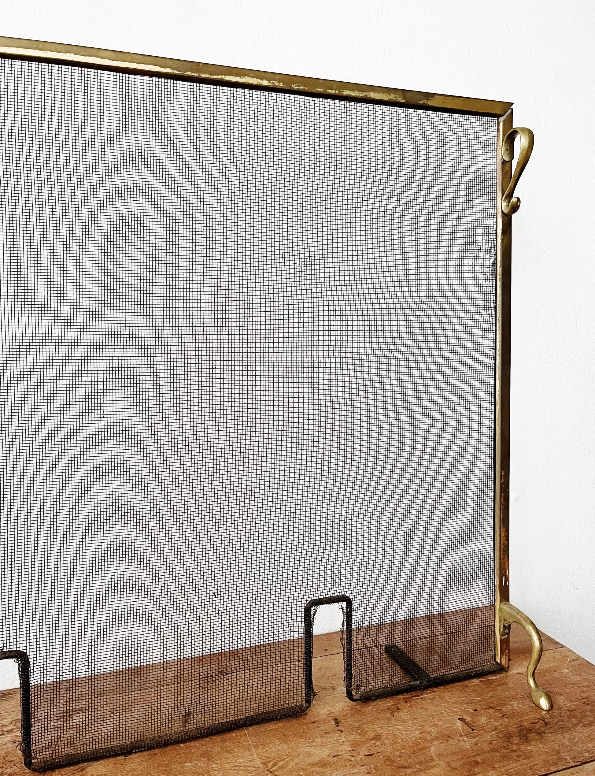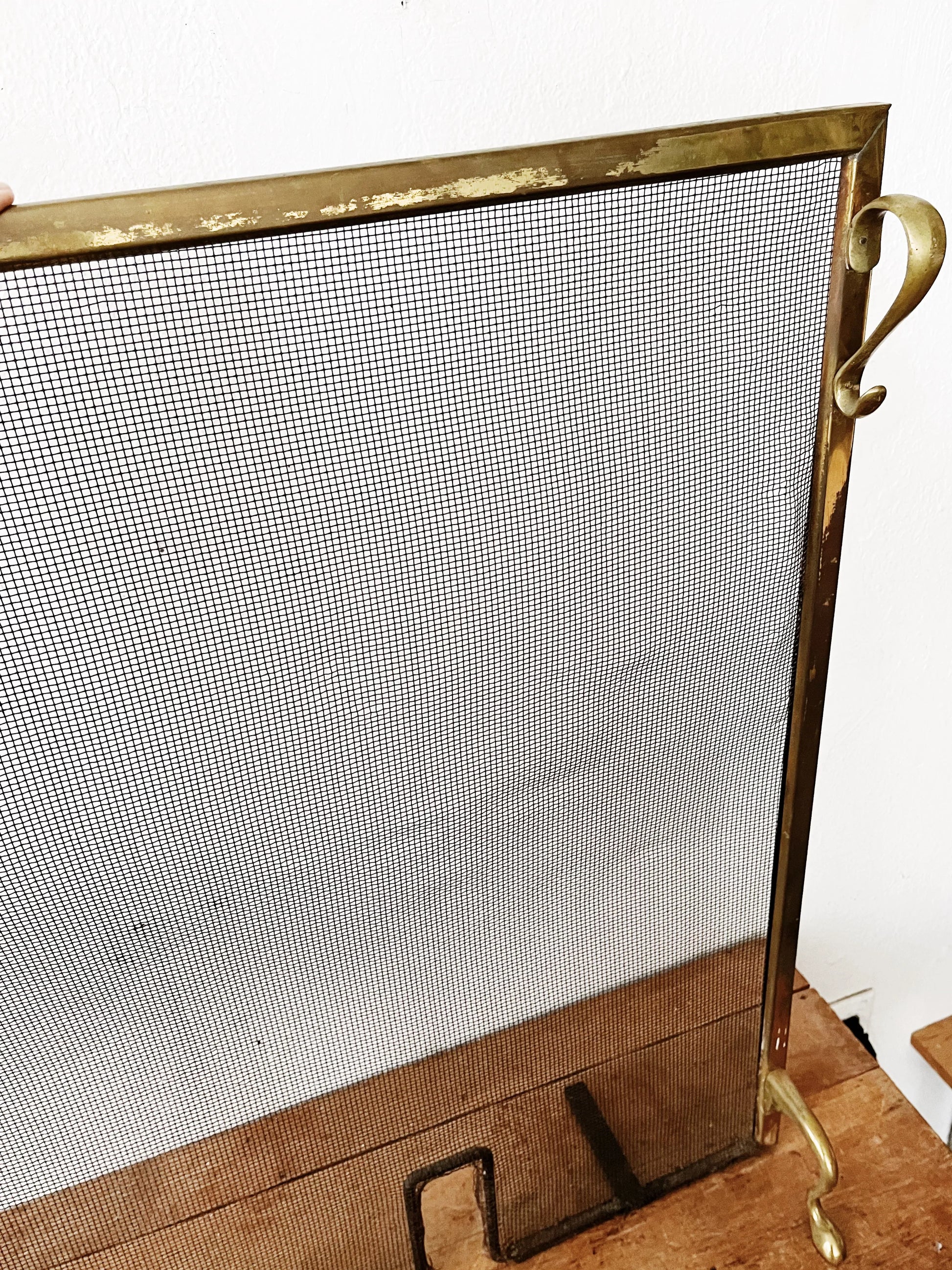 Brass trimmed metal screening for a fireplace front. Simple and effective styling. There are even cutouts for andirons if you have them. Sturdy. Some surface wear to the brass and screen but nothing affects use