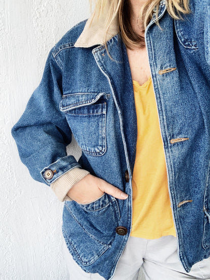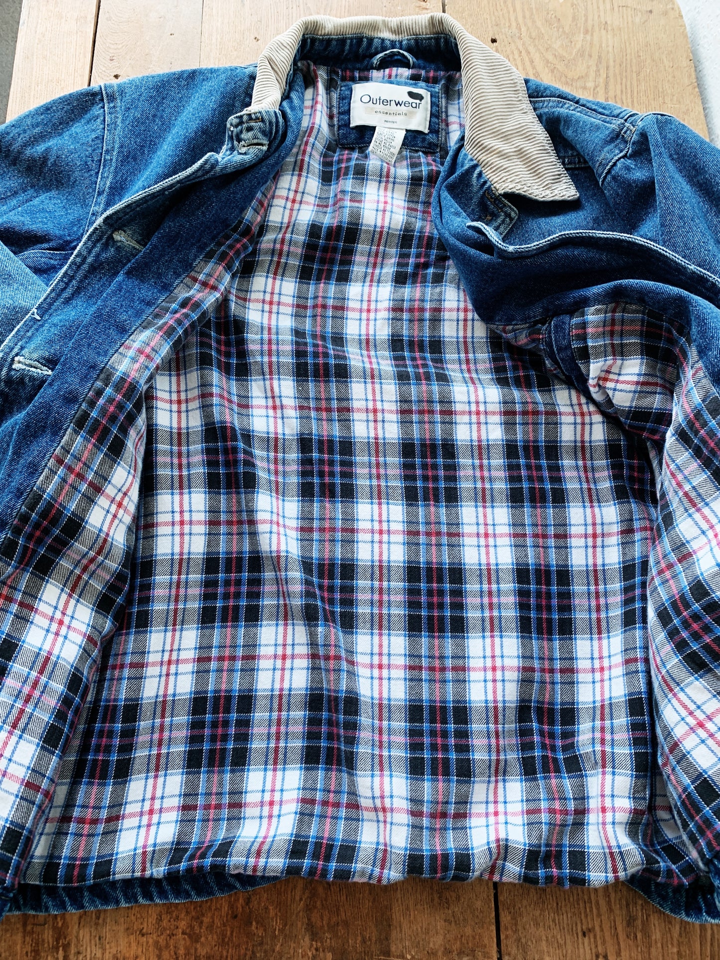 Outerwear Essentials 100% cotton flannel lined denim chore coat. So soft, comfortable and warm, and pockets! Corduroy collar and cuffs. This ones a winner. Tagged a petite, and fit is true. Size small