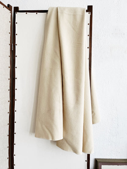 Simple and pretty wool blend (mostly wool) blanket. Flat weave and hemmed edge. Soft, not scratchy