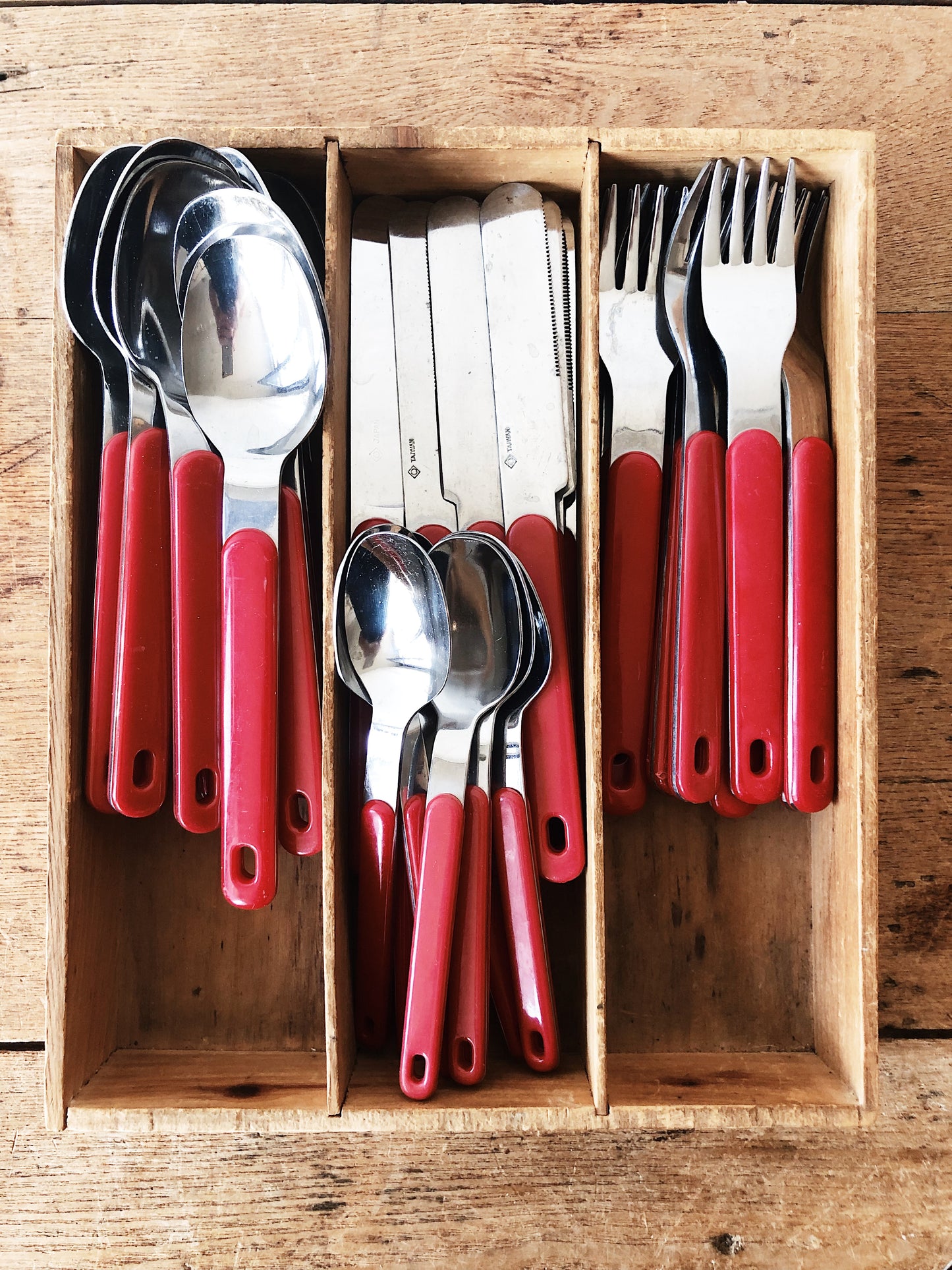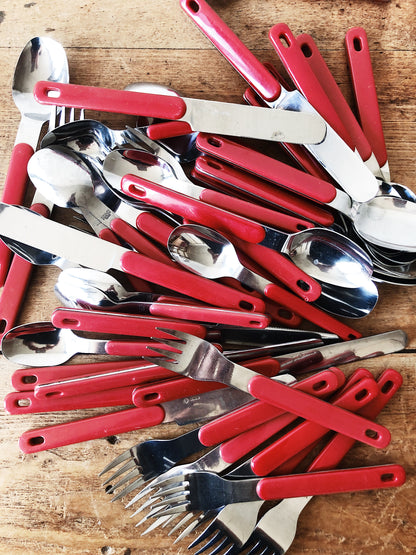 Made in Japan. Cherry red plastic handles with mod shaped stainless. Setting for 8 plus a few extras