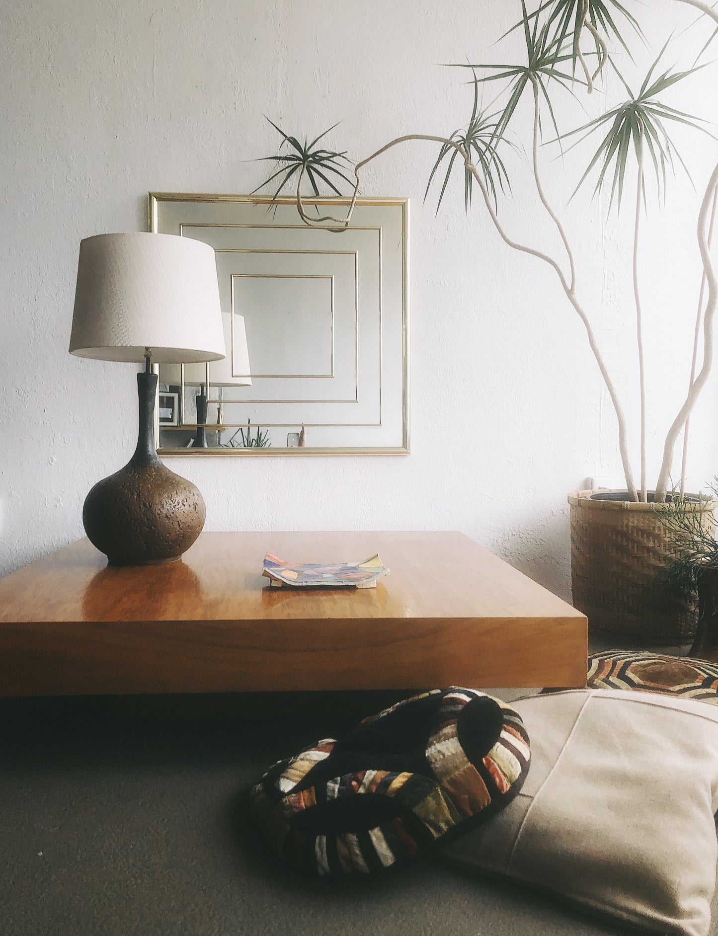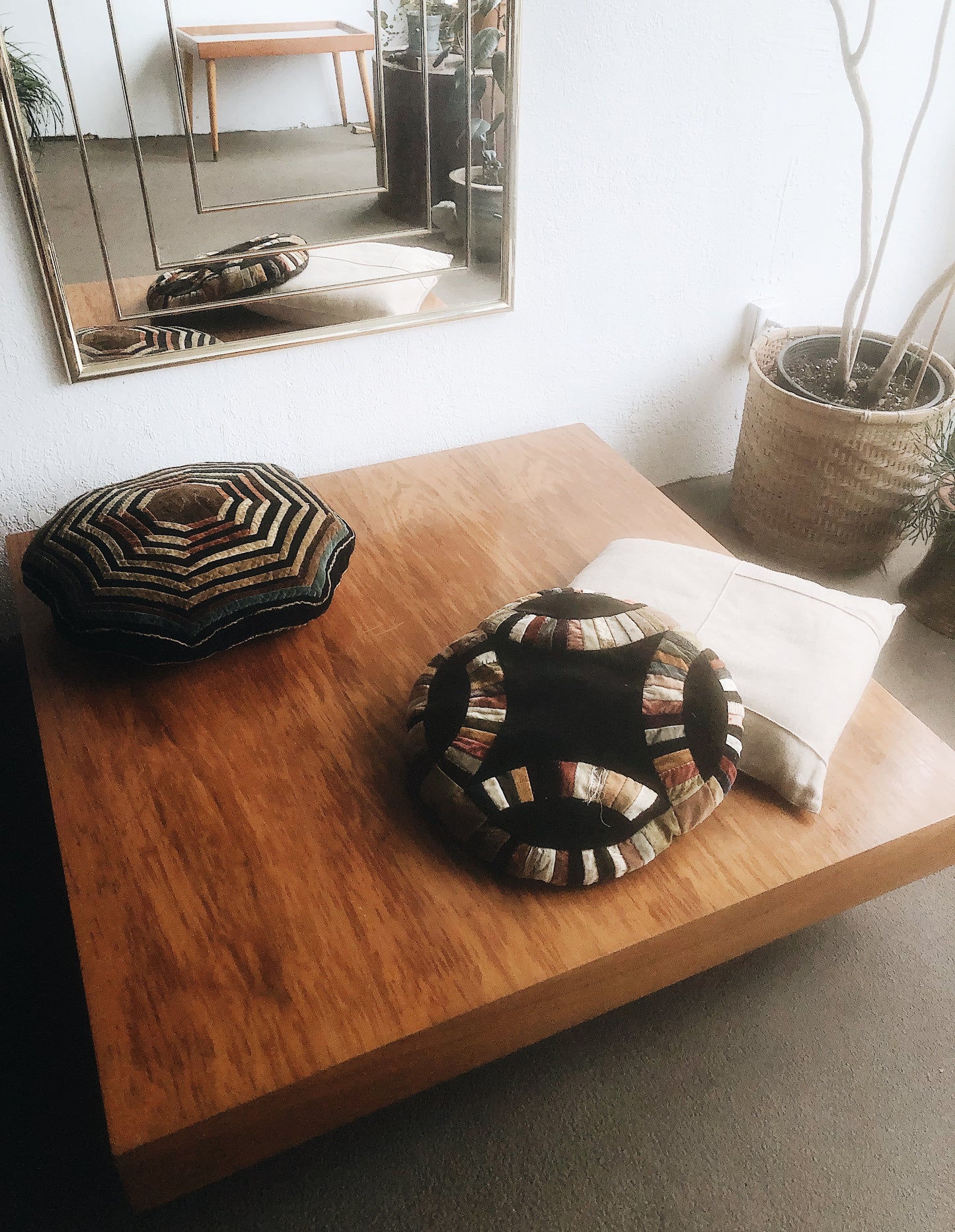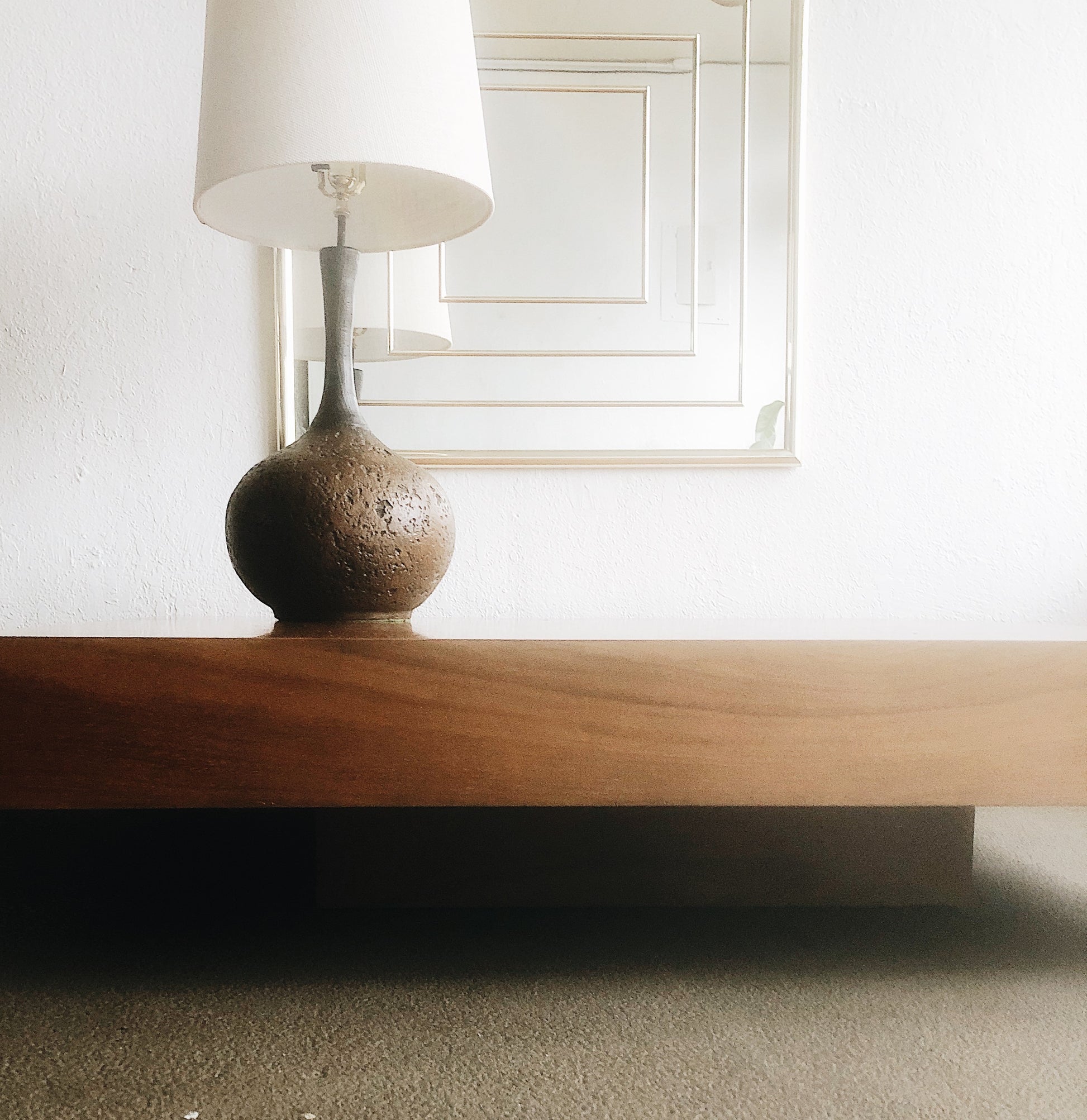 Beautiful simple wood floating coffee table. Low slung for a nice modern look. Square in shape. Would be the place to be at a party. Use cushions to sit on or around...and just right for low mid modern furniture