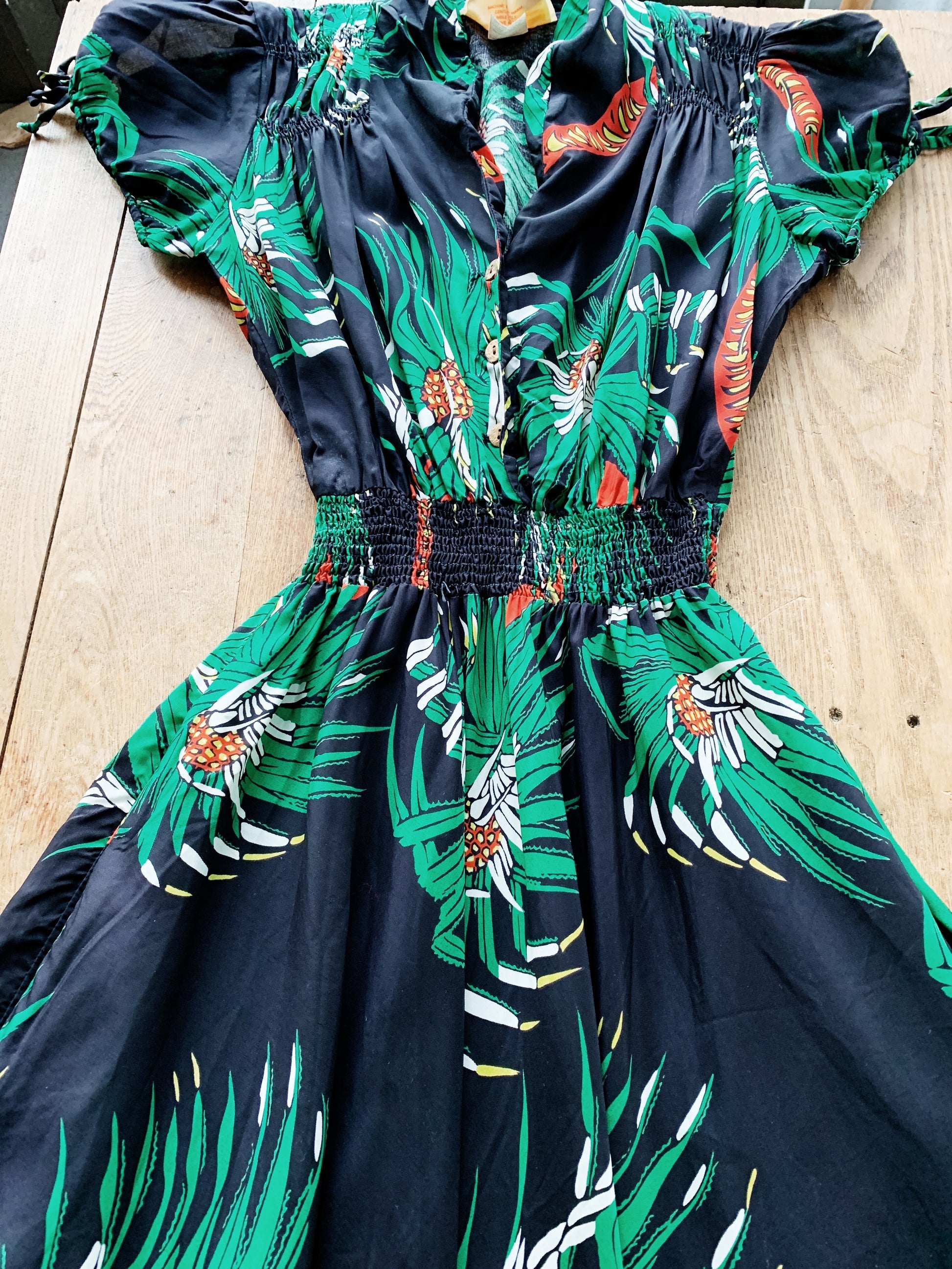 Gorgeous vintage floral dress with pockets. Wonderful print, wood buttons and tie sleeves. Vintage size 11, modern day size 4-8. Elastic waist. In excellent condition.