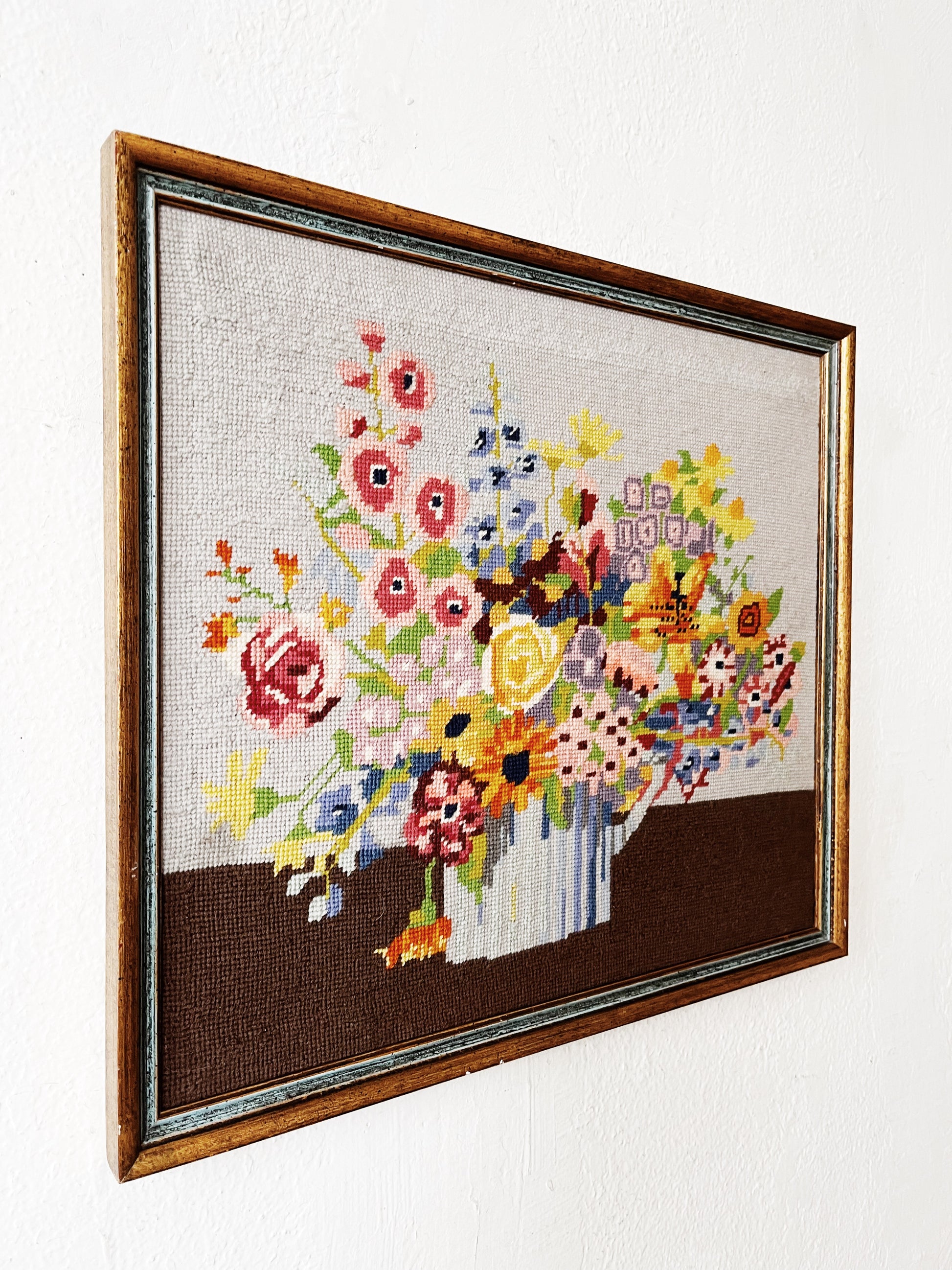 Pretty vintage needlepoint of a cheery still life. Very well done. Framed in old vintage wood. We live a good piece of textile art!