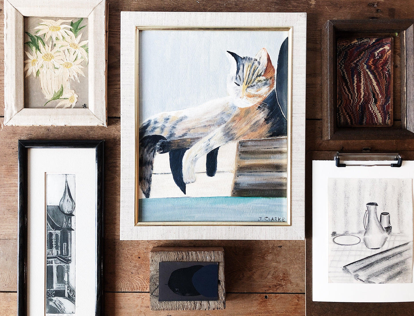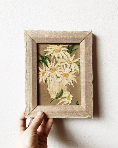 An old vintage oil, signed. Creamy colors and thick strokes. Taupe, cream, mustard yellow and spring green. Muslin over wood frame