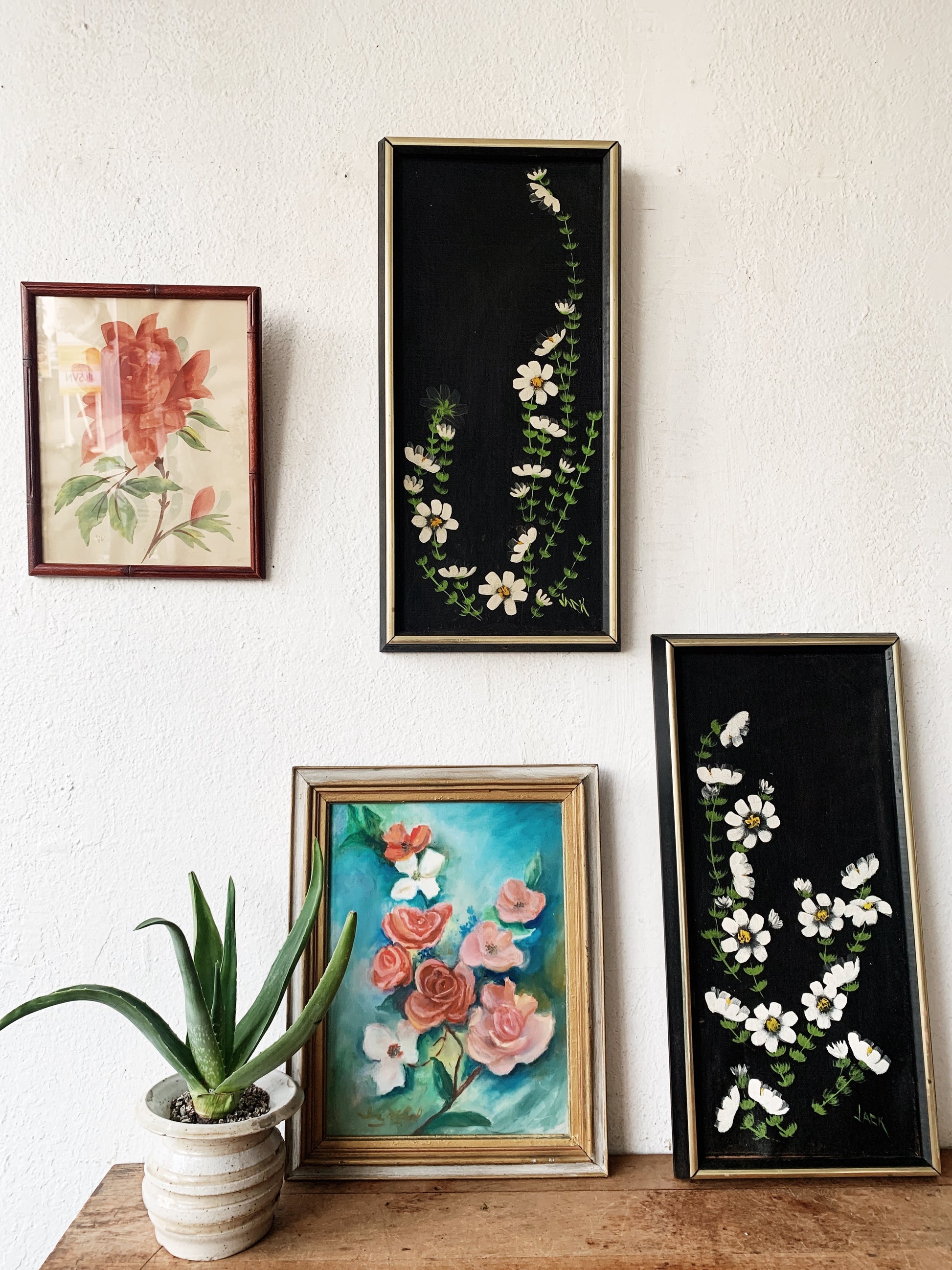 Wonderful dark floral paintings signed by Jack. Framed in black with gold trim. Love these!